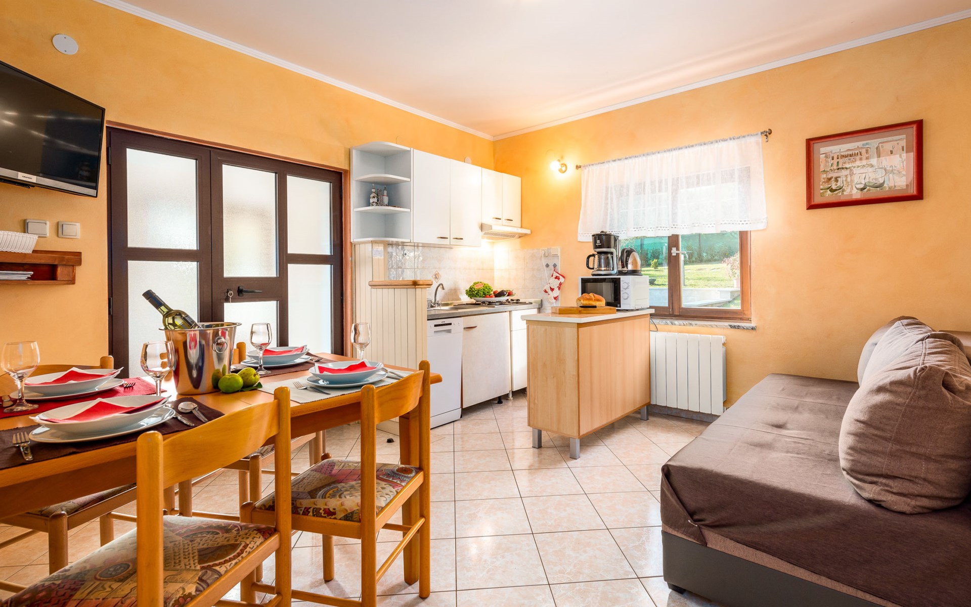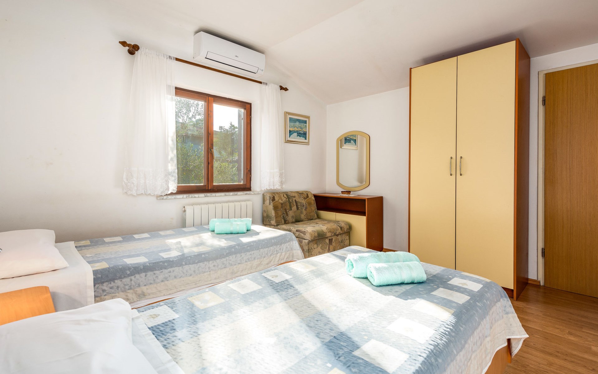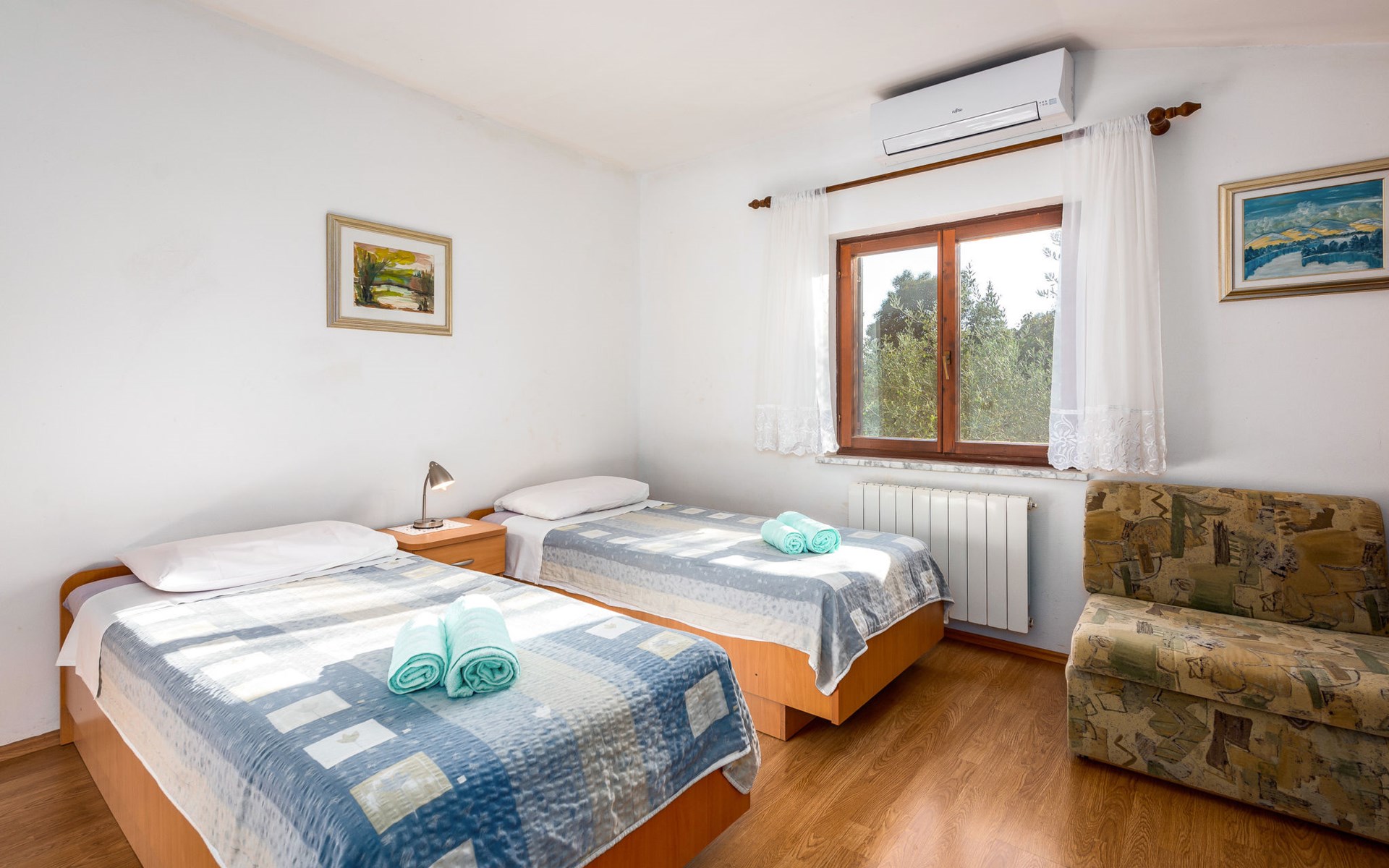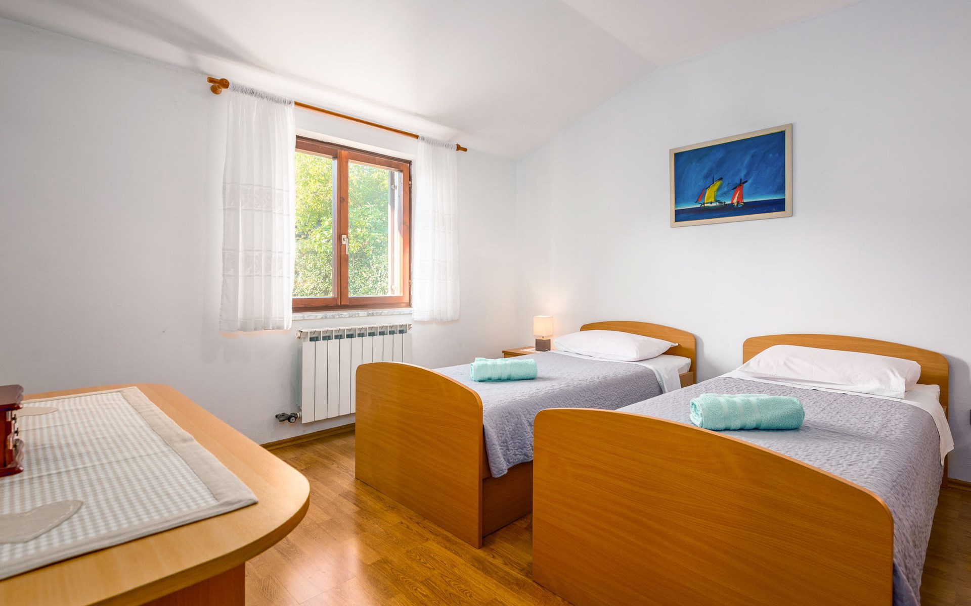 Twee onder één kap woning "Hacienda". 2 km van het centrum van Tinjan, 20 km van het centrum van Poreč, 30 km van het centrum van Pula, 20 km van zee, te midden van groen. Voor medegebruik: terrein 15.000 m2 met gazon en bomen. Voor alleengebruik: terrein 4.000 m2 met gazon, openluchtzwembad (7 x 4 m, 150 cm diepte, seizoensgebonden beschikbaarheid: 04.Apr. - 06.Nov.). Buitendouche, tafeltennis, terras, tuinmeubelen, barbecue (schommel), onderhoud zwembad door de eigenaar/tuinman. In het huis: internetaansluiting, trampoline, wasmachine. Parkeerplaats op het terrein. Winkel 2 km, restaurant 2 km, bushalte 450 m, rotsstrand 20 km. Lokale verkoop van streekproducten. De eigenaar woont in hetzelfde huis. Groepen jongeren zijn niet toegestaan.