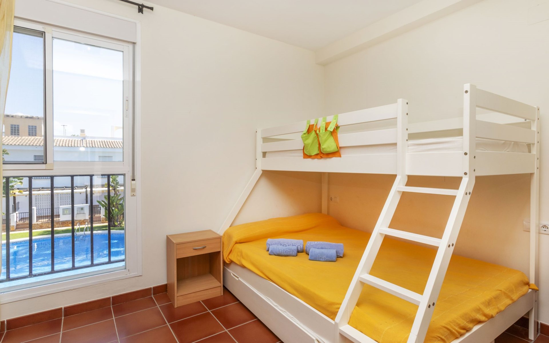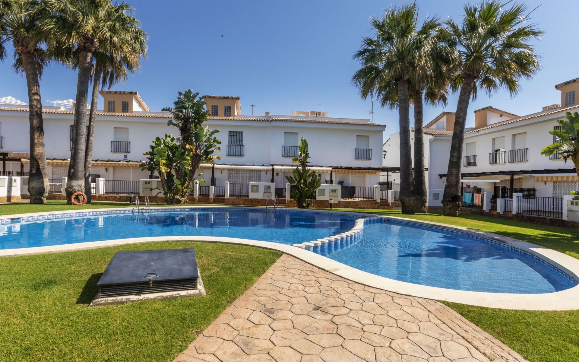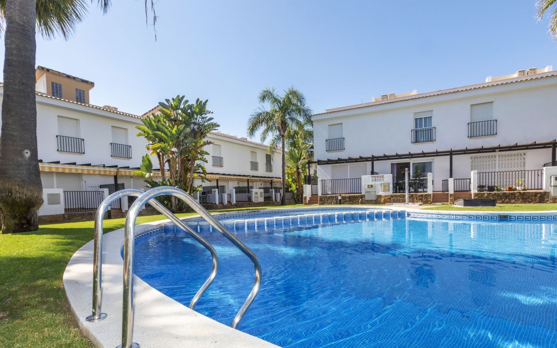 Capicorb: Rijtjeshuis "Palm Beach". 80 huizen in de plaats. In de plaats, 2 km van het centrum van Alcosserbre, 400 m van zee, 400 m van het strand. Voor medegebruik: ligweide, 2 zwembaden (30 m2, 50 - 190 cm diepte, seizoensgebonden beschikbaarheid: 01.Jan. - 31.Dec. openingstijden zwembad: 10:00-15:00 en 17:00-21:00). Onregelmatig zwembad. Kinderzwembad, buitendouche, parkeerplaats nr. 135. Winkel, levensmiddelenwinkel 800 m, supermarkt 2 km, restaurant 700 m, bar, bakkerij 800 m, bushalte "Cami L'atall con C/ Avellaner" 450 m, treinstation "Alcalá de Xivert" 5 km, zandstrand "Cala del Moro" 600 m, stenenstrand "Tres Platges" 400 m, duikschool 3.5 km. Jachthaven 3.5 km. Attracties in de buurt: Peñiscola 32 km, Ciutat de les Arts i les Ciències 120 km, Benicassim 35 km, Vilafamés 40 km, Alcalá de Xivert-Castillo y campanario 12 km, Coves de Sant Josep 82 km. Wandelgebied Parque Natural Sierra de Irta 6 km. Auto noodzakelijk, geen lift. Groepen jongeren uitsluitend op aanvraag. De omgeving is gevoelig voor geluidsoverlast. Gelieve geen lawaai te maken en de rust te bewaren.