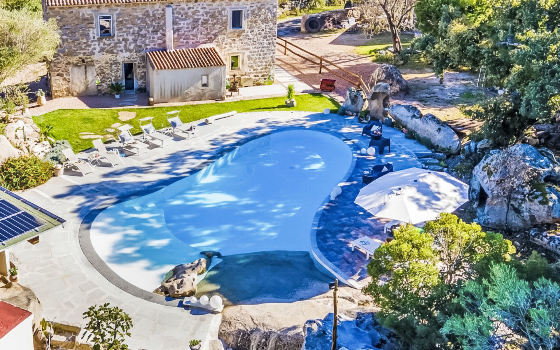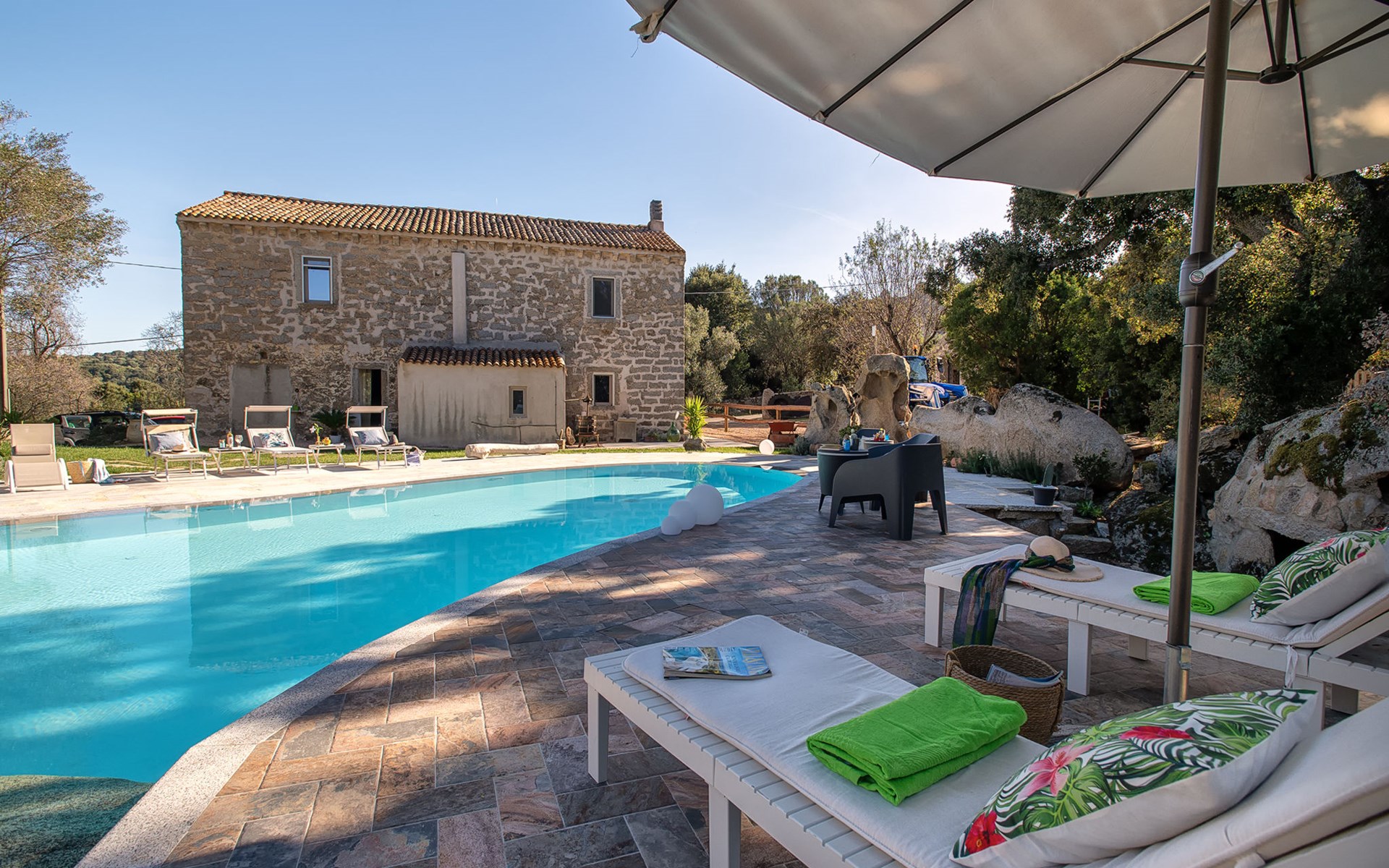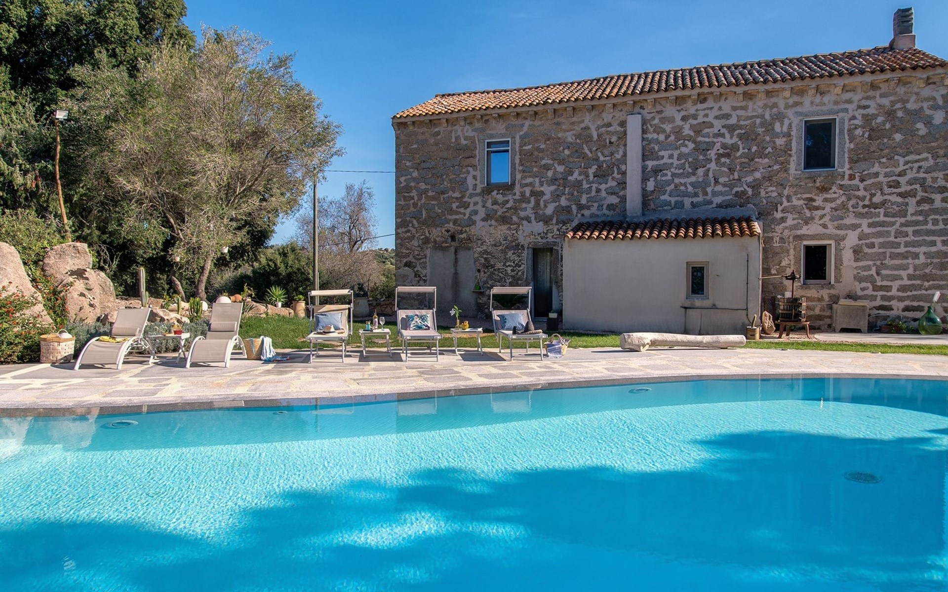 Groot, mooi, comfortabele eengezinswoning. In de plaats, 9 km van het centrum van Arzachena, rustige, zonnige ligging, 15 km van zee, te midden van groen. Voor alleengebruik: terrein, groot tuin met gazon en bomen, openluchtzwembad rond (15 x 7 m, seizoensgebonden beschikbaarheid: 01.Apr. - 31.Okt.). Douche/WC bij het zwembad, patio, tuinmeubelen, barbecue (schommel). Toegangsweg tot aan het huis. Parkeerplaats bij het huis. Supermarkt 9 km, restaurant 11 km, bar 11 km, bushalte "Suldarana" 1.1 km, zandstrand "Tanca manna" 17.5 km. Attracties in de buurt: baia sardinia 23 km, porto cervo 26 km, olbia 27 km, arzachena 9 km, cannigione 15 km, palau 23 km. Auto noodzakelijk. Op het grondstuk dierhouderij.