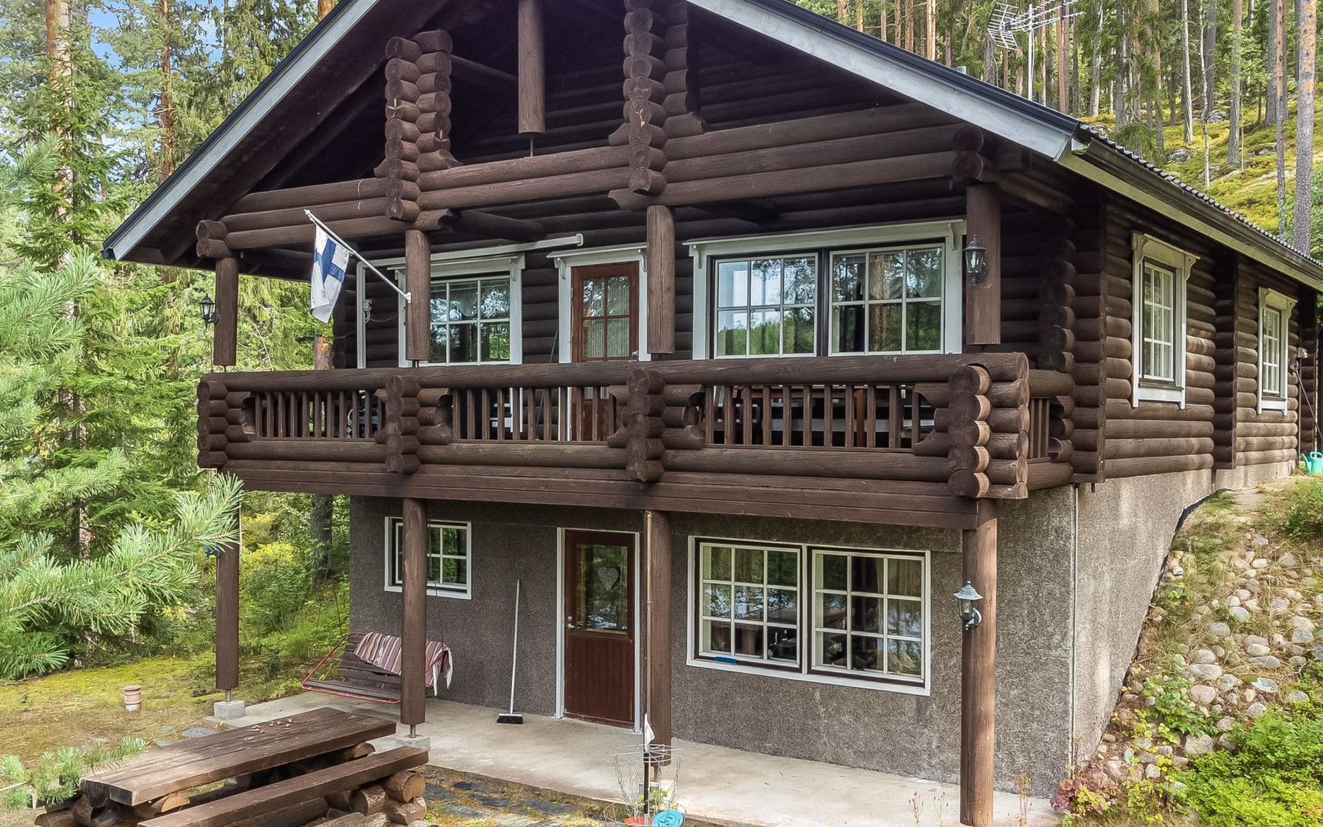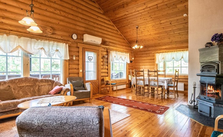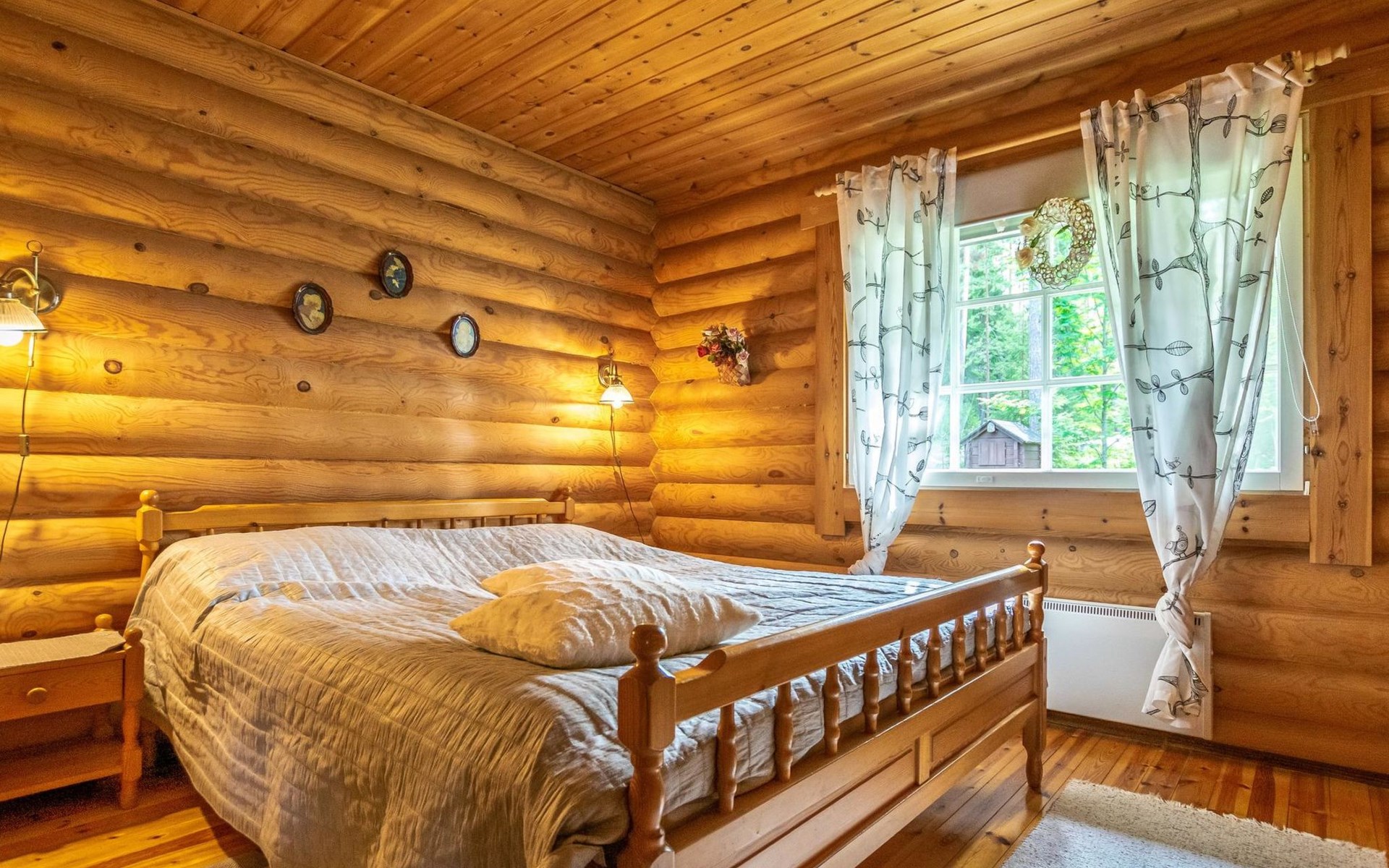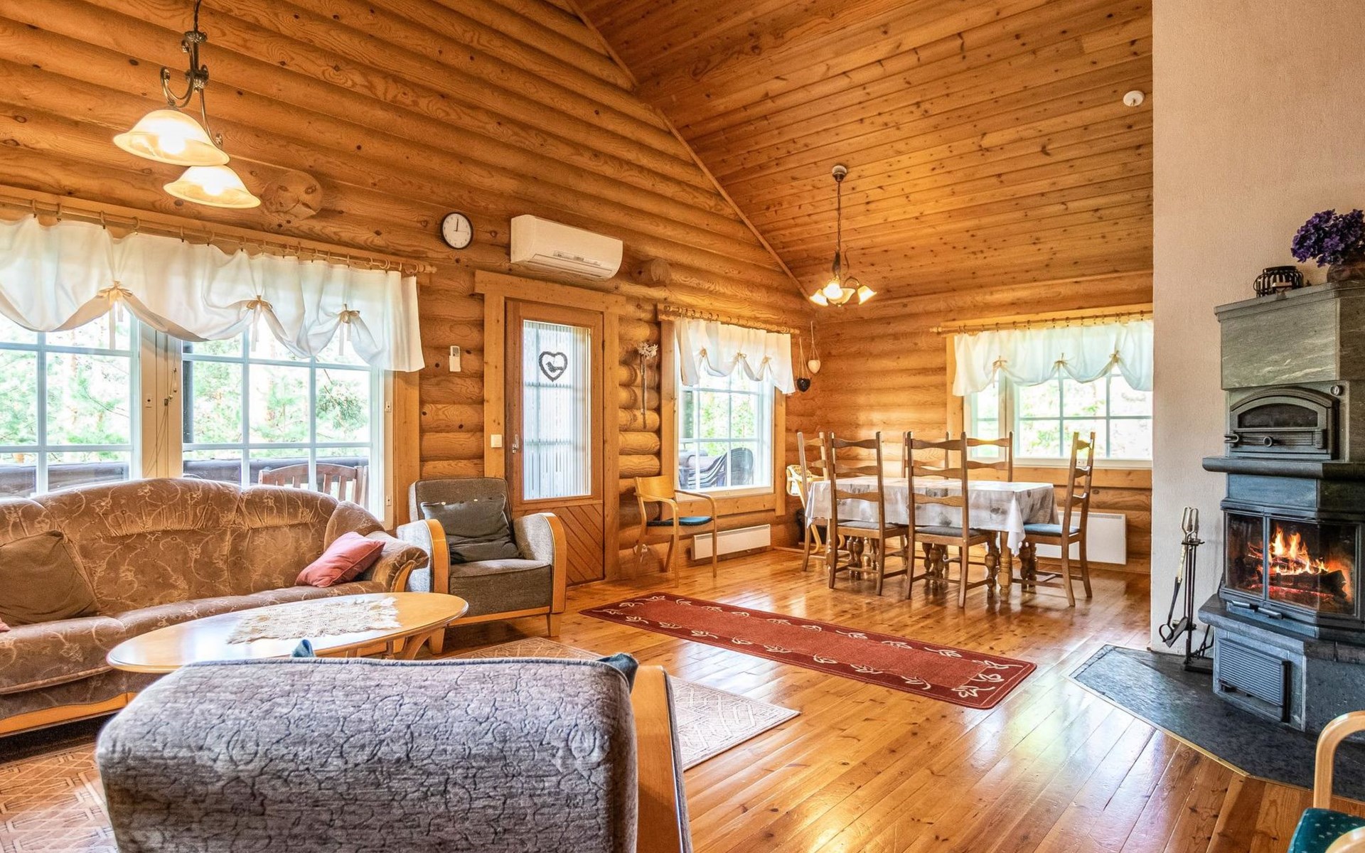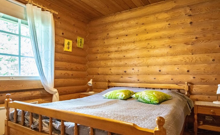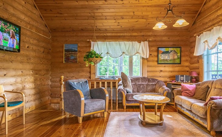 Two-storey log cottage 1999, living room/ kitchen, 2 bedrooms double bed in each, downstairs room with fireplace and sofa, washroom, sauna (elec. stove).