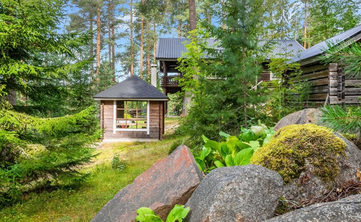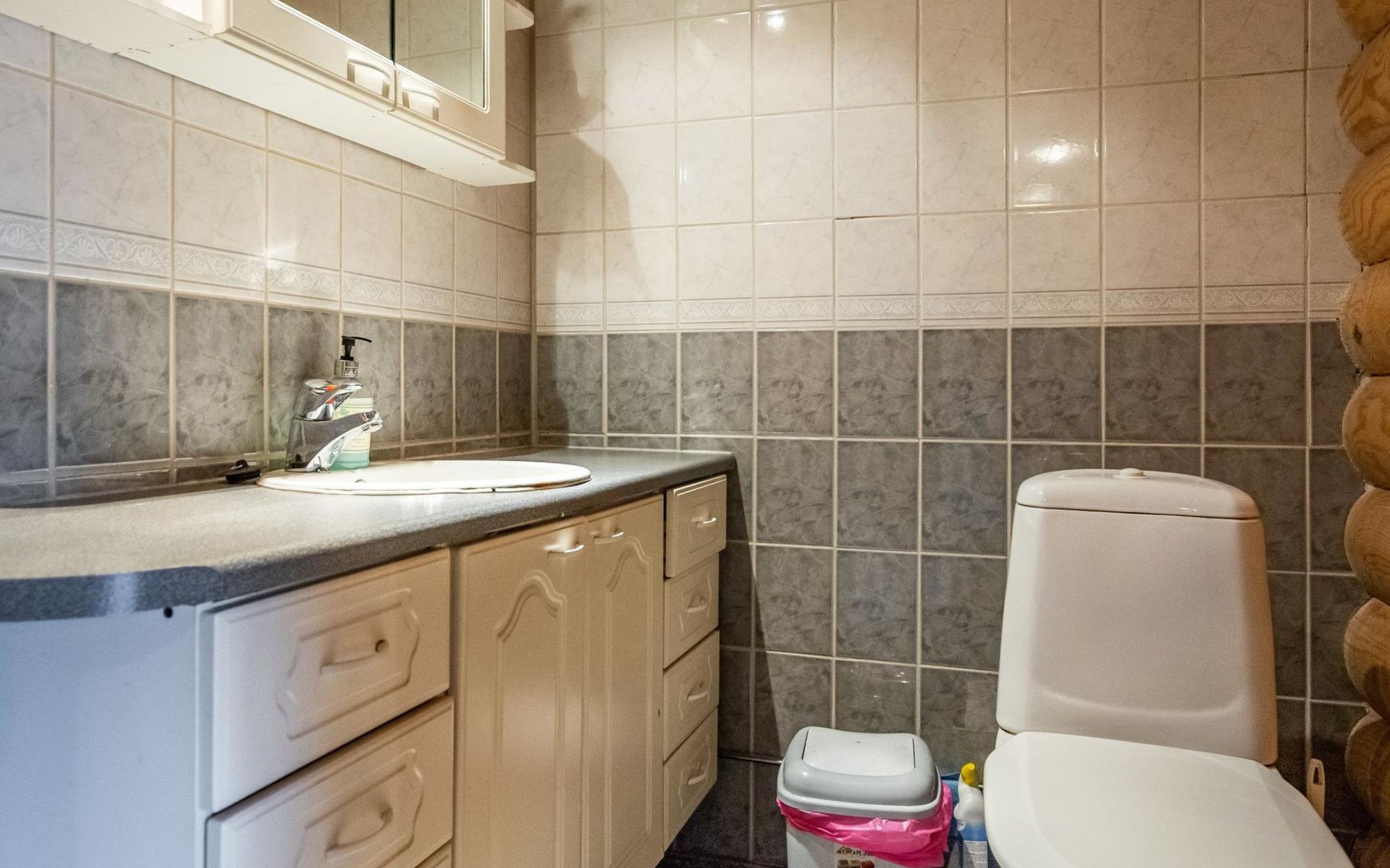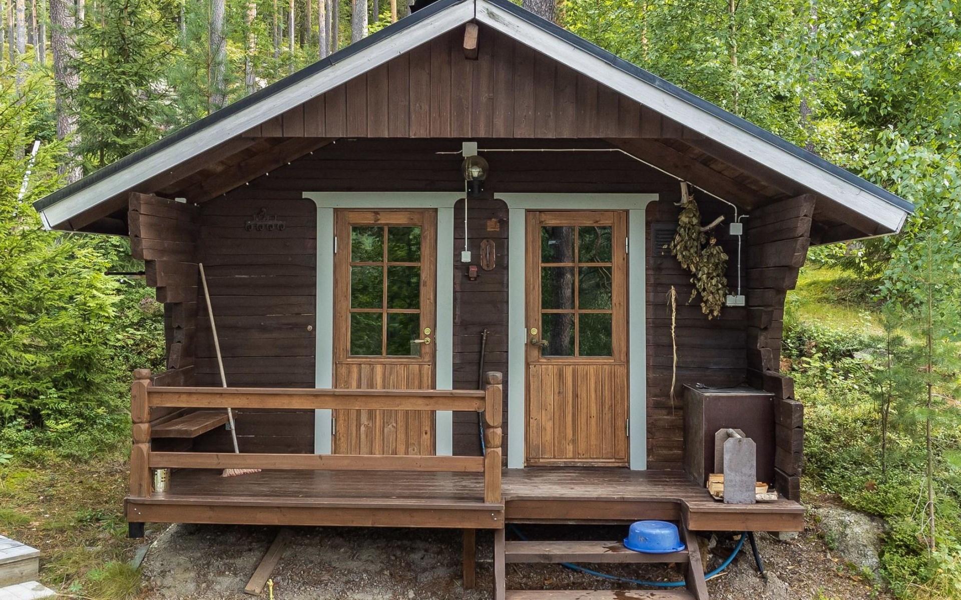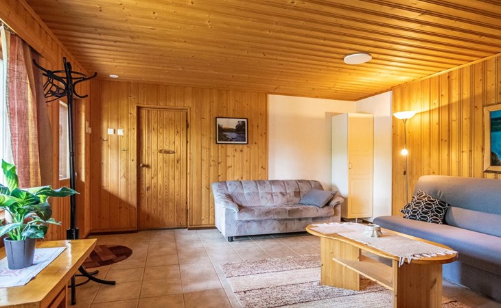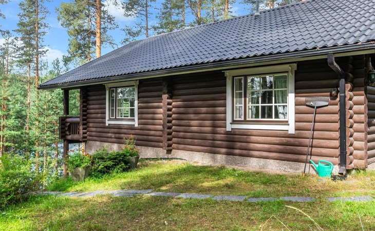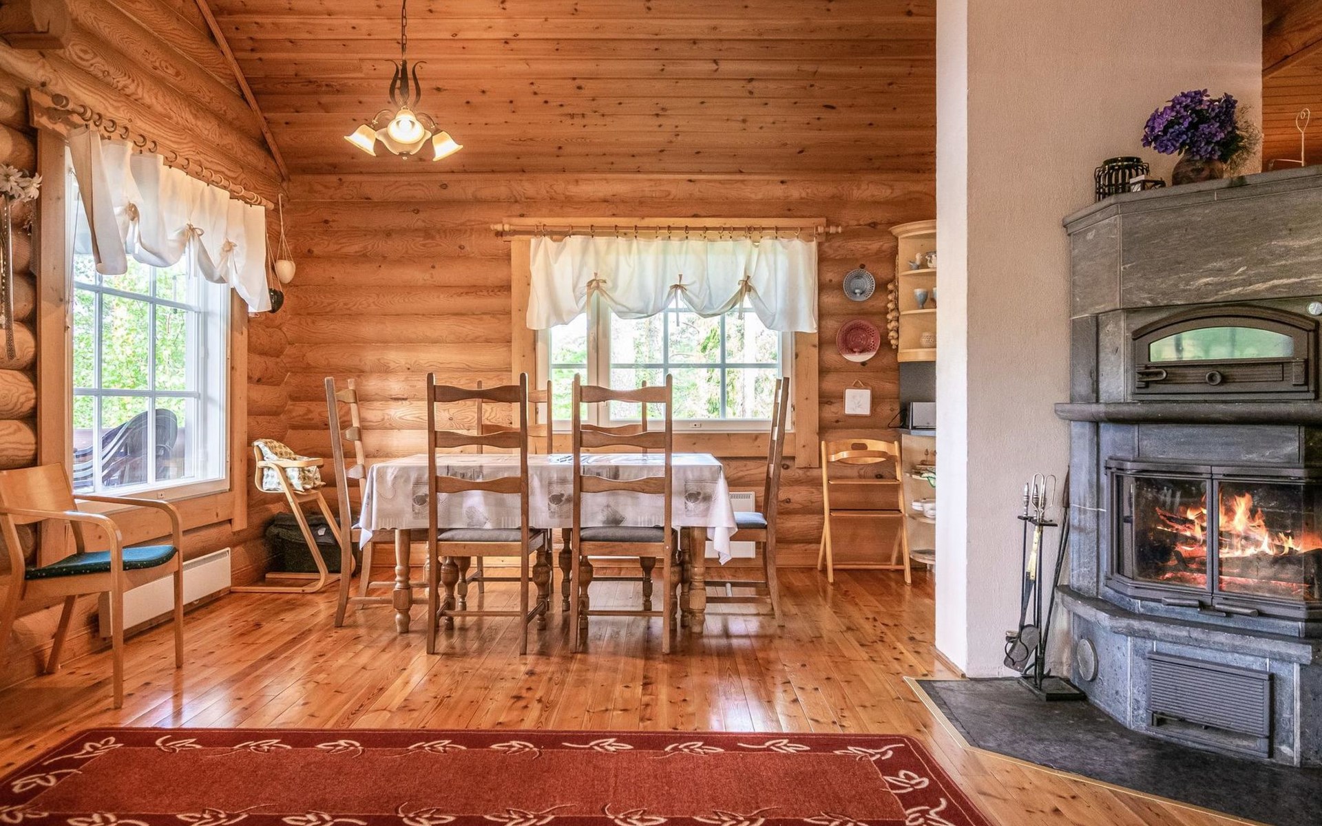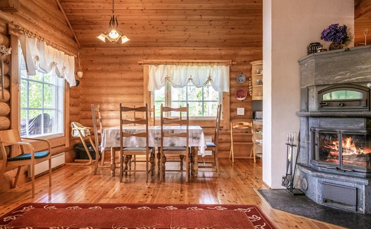 Two-storey log cottage 1999, living room/ kitchen, 2 bedrooms double bed in each, downstairs room with fireplace and sofa, washroom, sauna (elec. stove).