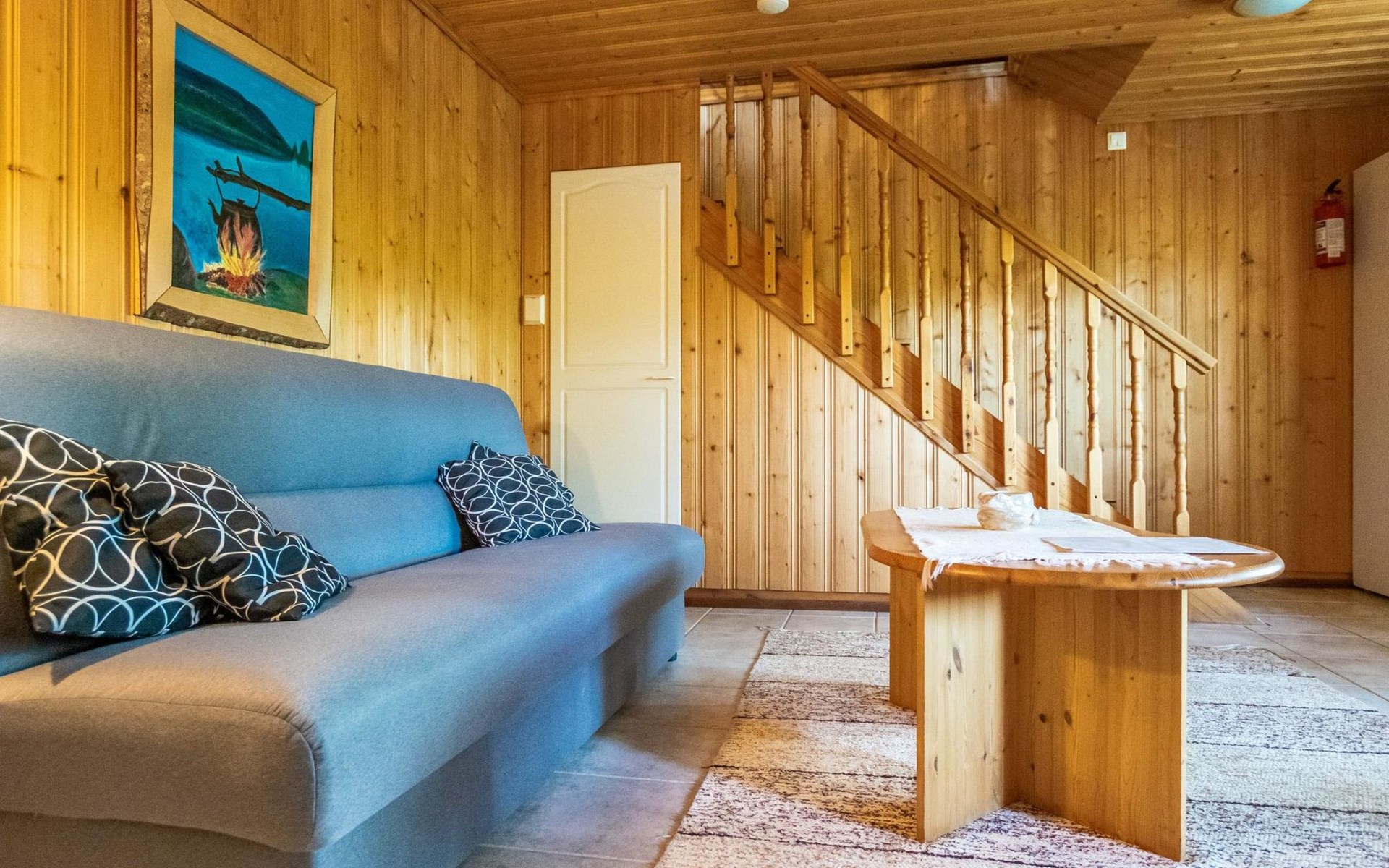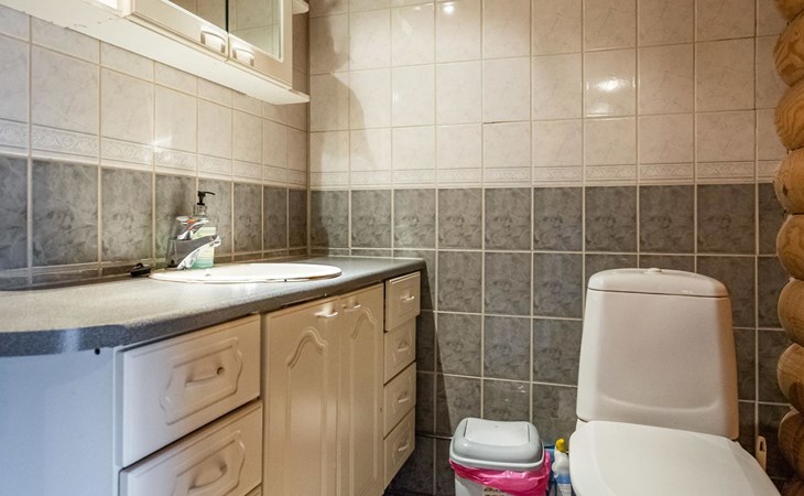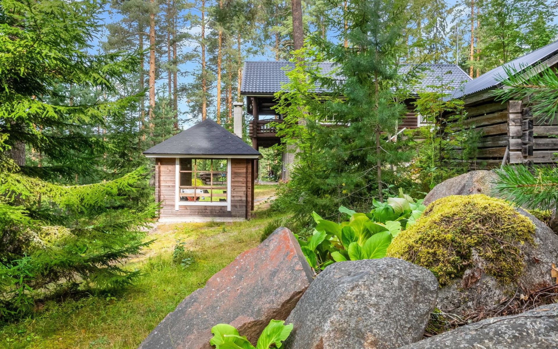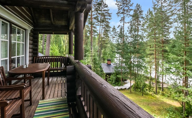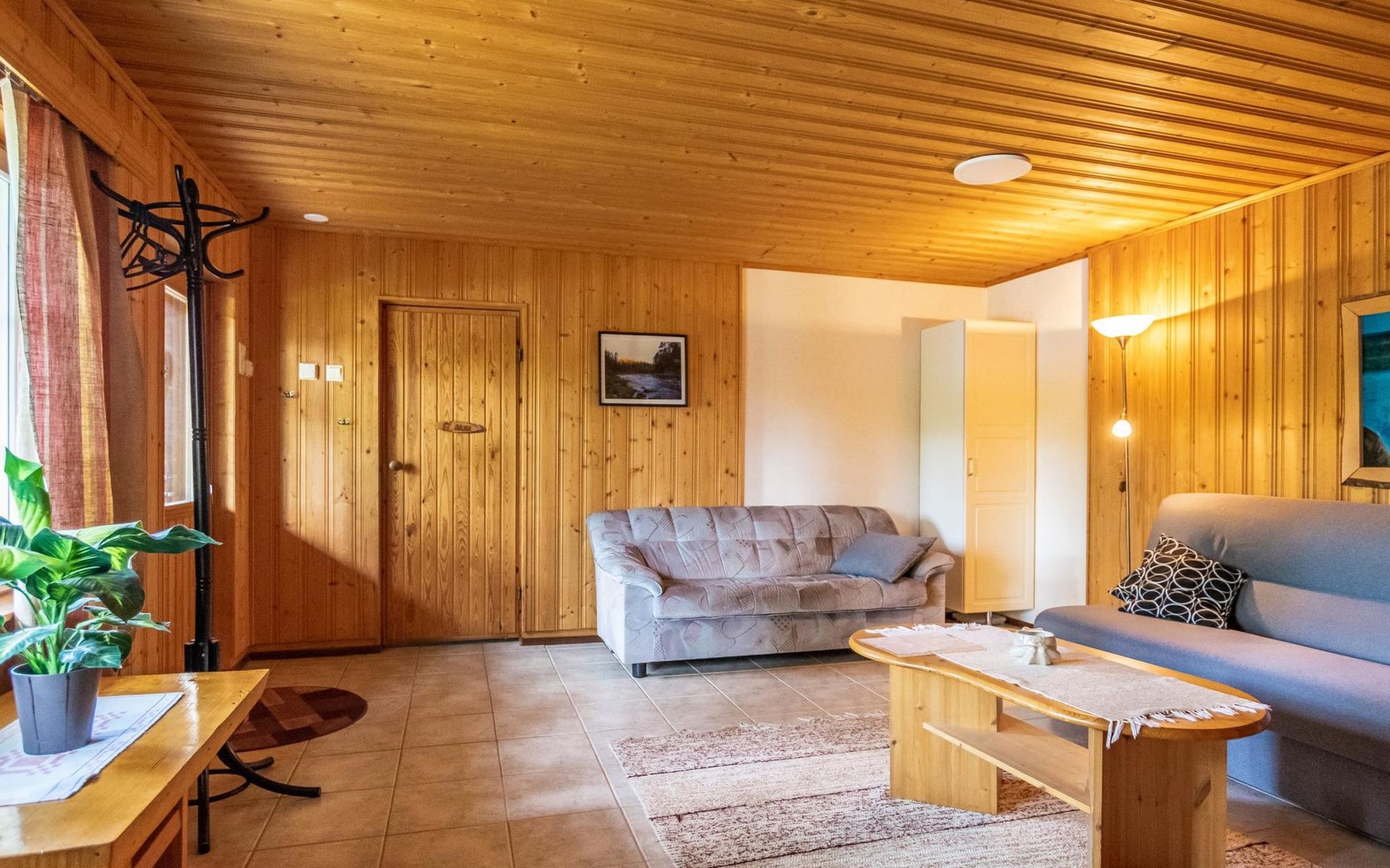 Two-storey log cottage 1999, living room/ kitchen, 2 bedrooms double bed in each, downstairs room with fireplace and sofa, washroom, sauna (elec. stove).