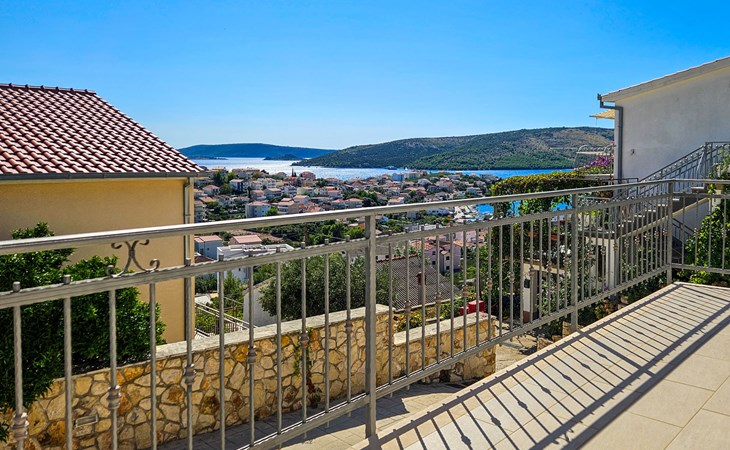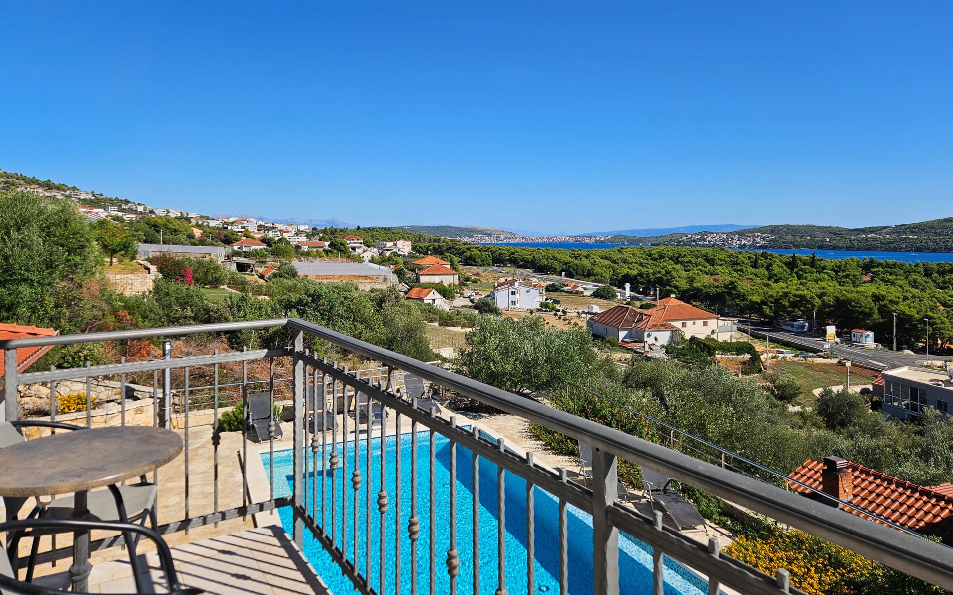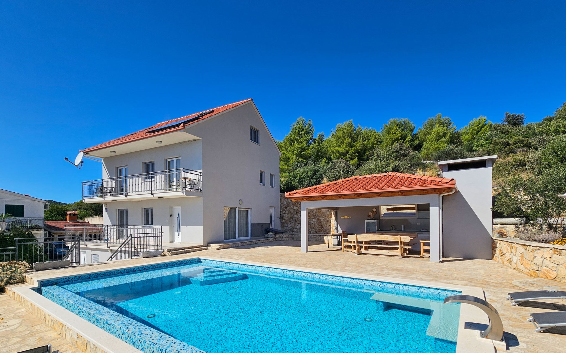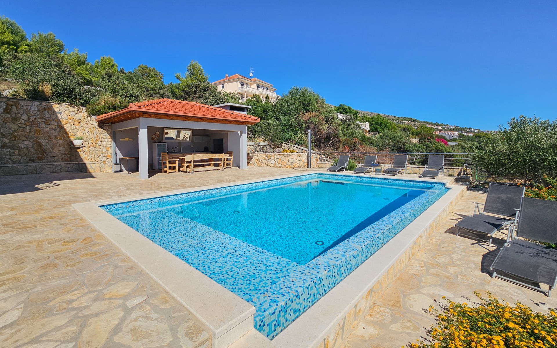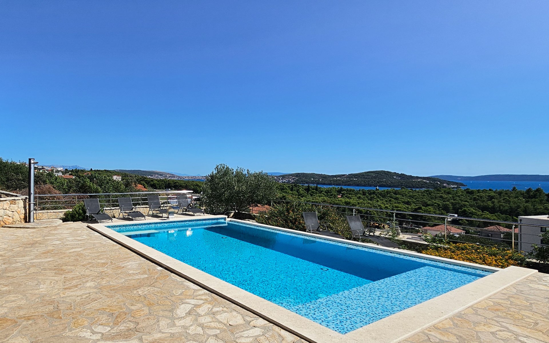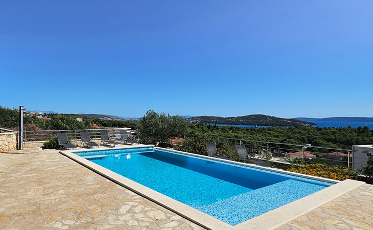 Seget Vranjica: Zeer mooi villa "Maris", van 3 verdiepingen. 5.2 km van het centrum van Trogir, rustige, zonnige ligging tegen een helling, 1.1 km van zee, 1.1 km van het strand, aan een doodlopende weg. Voor alleengebruik: terrein 400 m2 (omheind), openluchtzwembad hoekig (32 m2, seizoensgebonden beschikbaarheid: 01.Mei. - 31.Okt.) met trap. Buitendouche, hot tub, poolhouse met koelkast, barbecue, onderhoud zwembad door de eigenaar/tuinman. In het huis: internetaansluiting, fitnessruimte, wasmachine. 50 m lange steile toegangsweg tot aan het huis. Parkeerplaats (voor 4 auto's) bij het huis op het terrein. Winkel 400 m, winkelcentrum 4.6 km, restaurant 1.1 km, bushalte 260 m, kiezelstrand 1.1 km. Vliegveld 11 km van het huis.