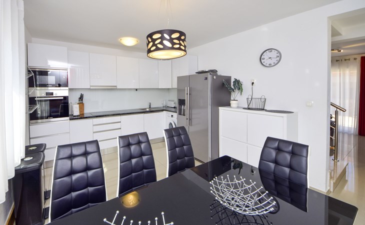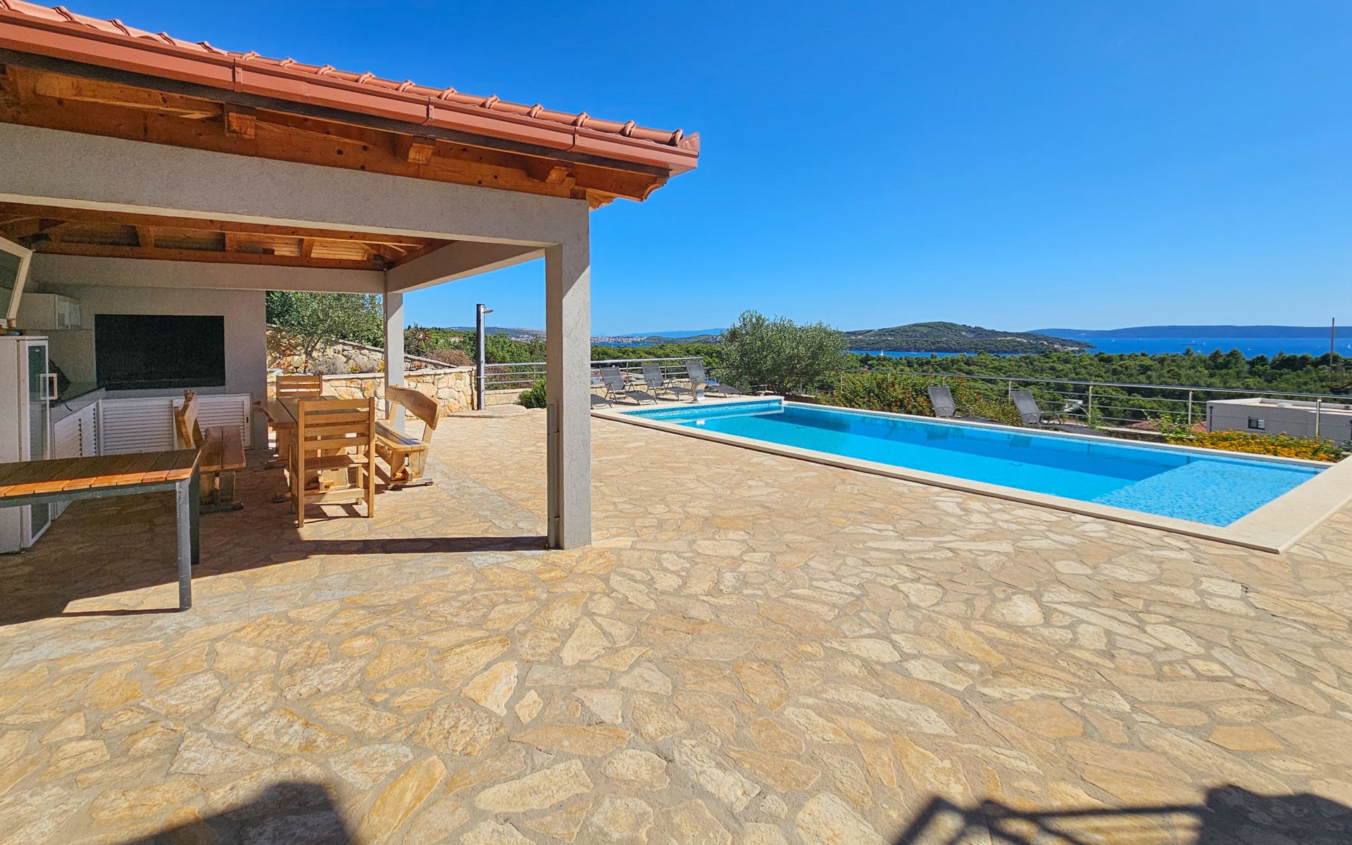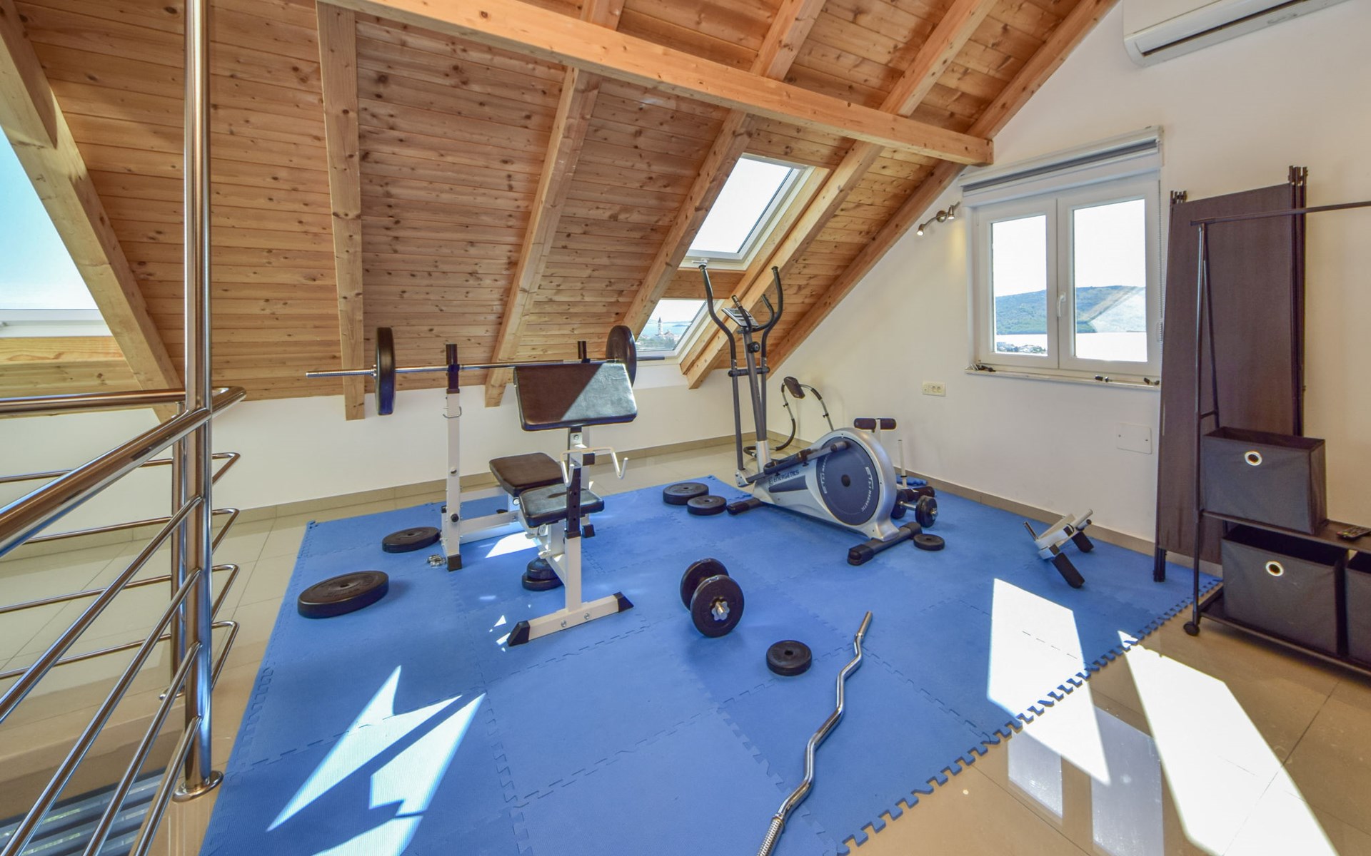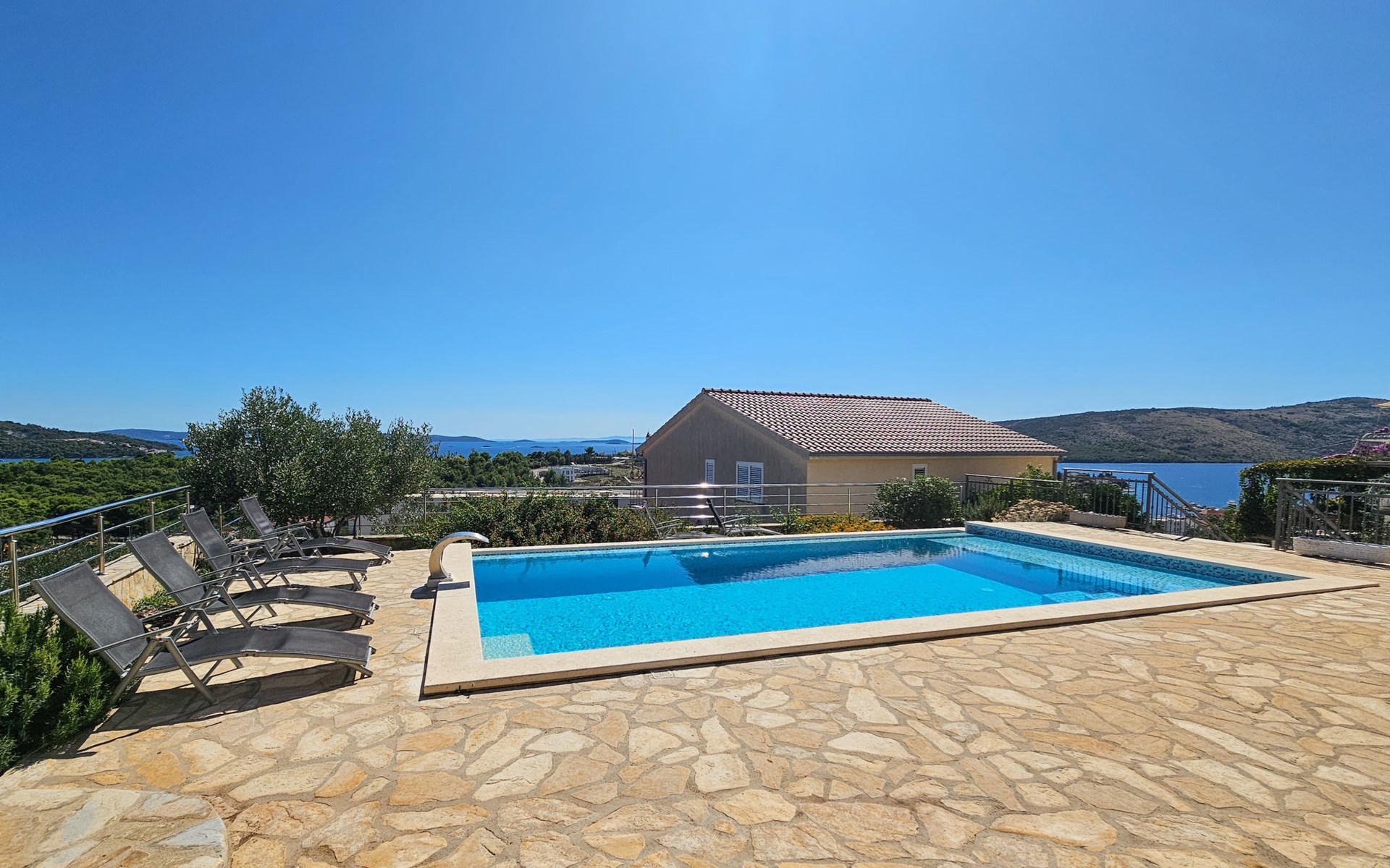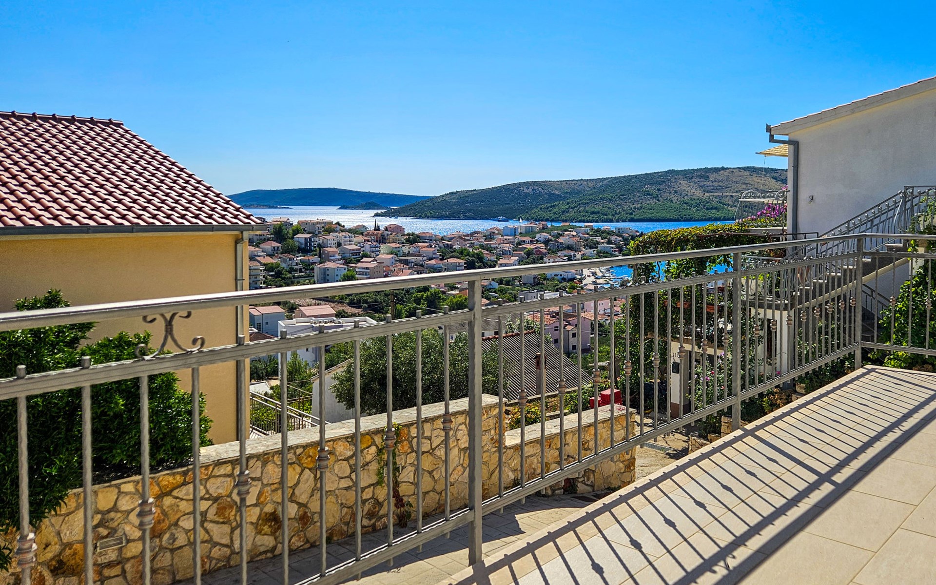 Seget Vranjica: Zeer mooi villa "Maris", van 3 verdiepingen. 5.2 km van het centrum van Trogir, rustige, zonnige ligging tegen een helling, 1.1 km van zee, 1.1 km van het strand, aan een doodlopende weg. Voor alleengebruik: terrein 400 m2 (omheind), openluchtzwembad hoekig (32 m2, seizoensgebonden beschikbaarheid: 01.Mei. - 31.Okt.) met trap. Buitendouche, hot tub, poolhouse met koelkast, barbecue, onderhoud zwembad door de eigenaar/tuinman. In het huis: internetaansluiting, fitnessruimte, wasmachine. 50 m lange steile toegangsweg tot aan het huis. Parkeerplaats (voor 4 auto's) bij het huis op het terrein. Winkel 400 m, winkelcentrum 4.6 km, restaurant 1.1 km, bushalte 260 m, kiezelstrand 1.1 km. Vliegveld 11 km van het huis.