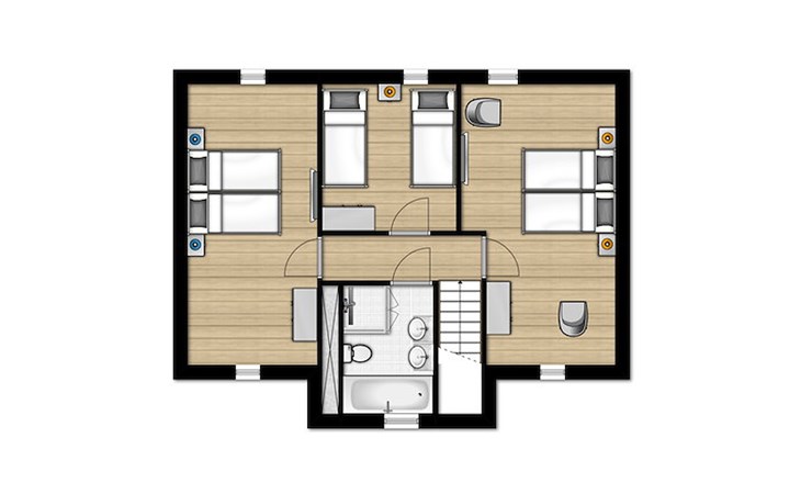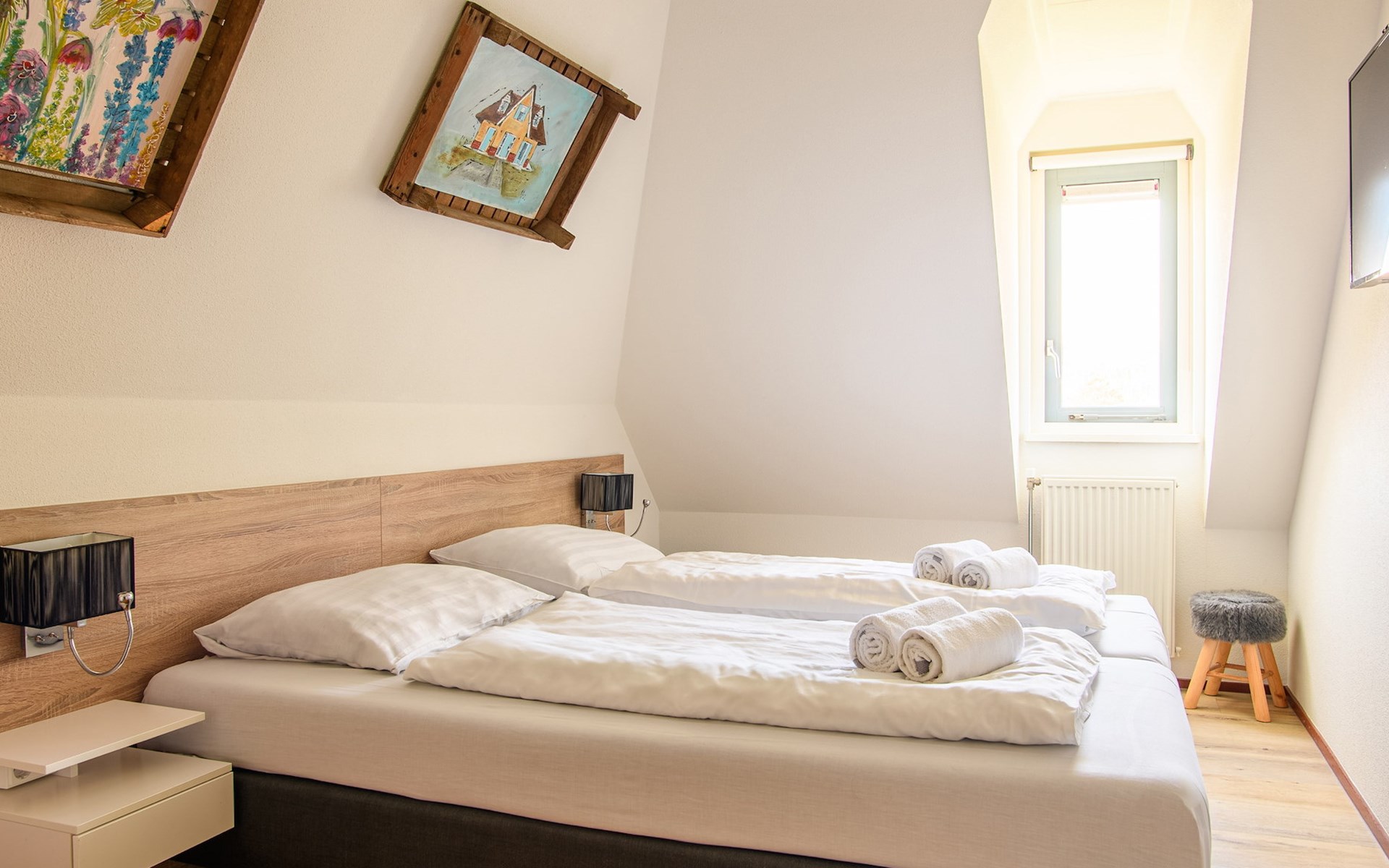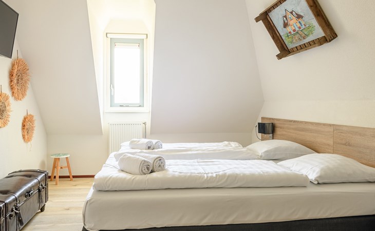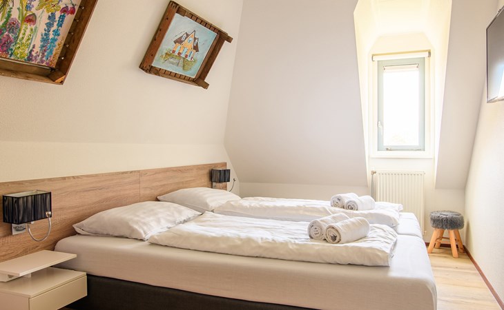 Op de eerste verdieping bevinden zich 3 slaapkamers met elk 2 éénpersoons Auping boxsprings, waarvan de bedden in 2 slaapkamers extra lang zijn (210 centimeter). Ook beschikken 2 slaapkamers over een televisie. Verder is er 1 badkamer met een ligbad, inloop regendouche, dubbele wastafel en toilet op de eerste verdieping.