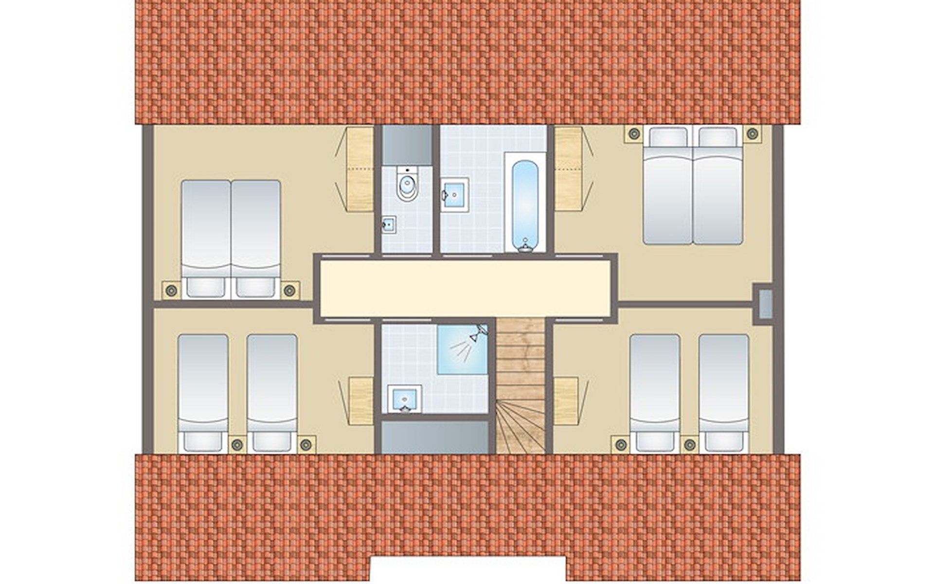 Op de eerste verdieping vind je nog 4 slaapkamers met elk 2 éénpersoons boxsprings, waarvan in 1 slaapkamer de bedden zijn opgemaakt als een tweepersoonsbed. Ook zijn er 2 badkamers waarvan 1 badkamer een ligbad met douche en wastafel heeft. De andere badkamer beschikt over een sunshower en wastafel. Ook is er een separaat toilet op de eerste verdieping.