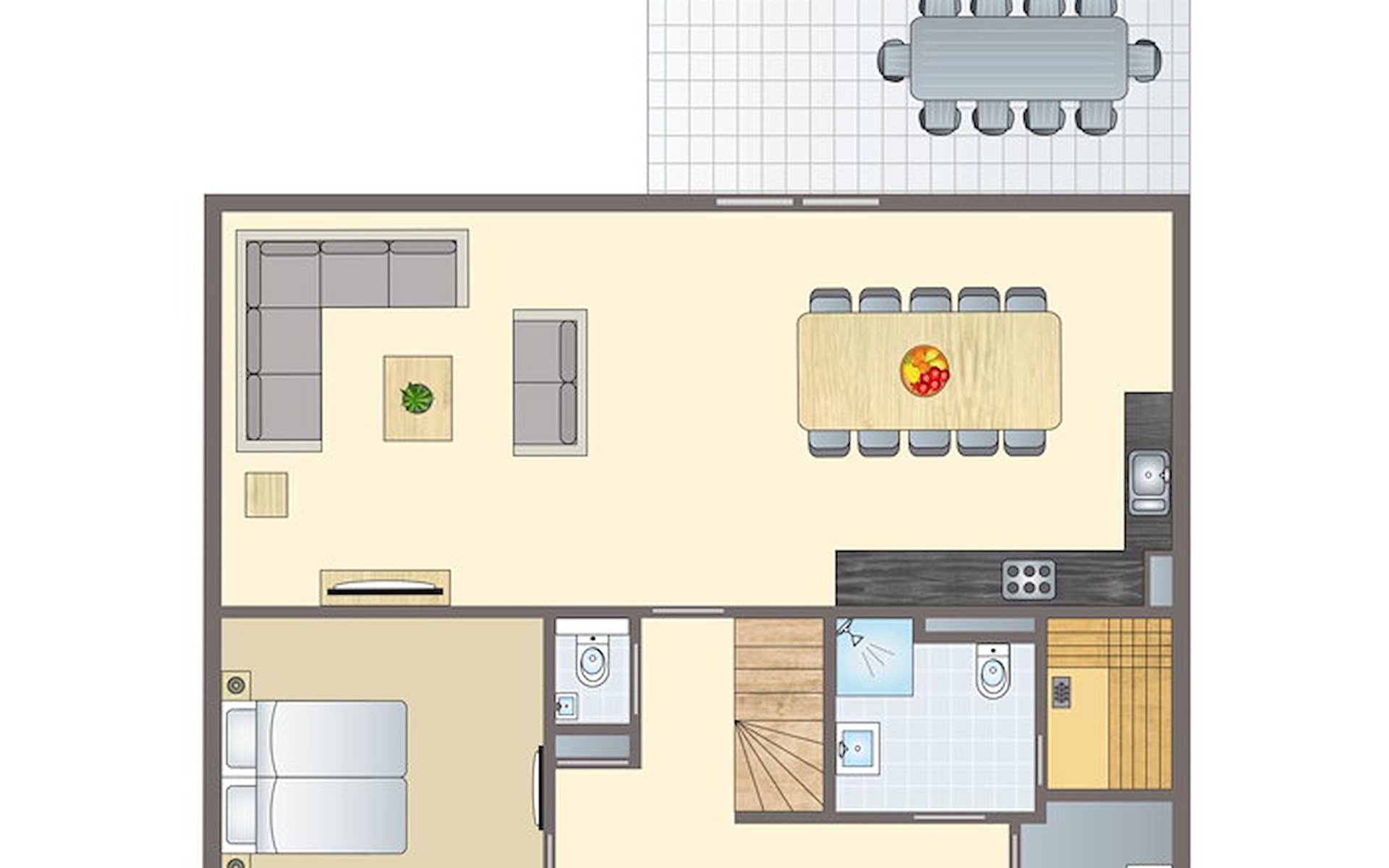 Vanuit het woon-/eetgedeelte geven de openslaande deuren je toegang tot het ruime terras, waar je goed kunt vertoeven tijdens je groepsvakantie. Bovendien vind je hier in de zomer comfortabele ligstoelen waar je lekker op kunt neerstrijken. Een fijne plek om met het hele gezelschap samen te komen en te genieten van een lekker hapje of drankje!