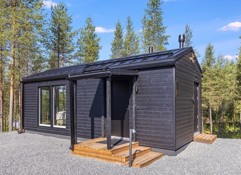 Built in 2025, the cabin has everything you need for a relaxing holiday. The combined living room/kitchen/sleeping area is practical and comfortable, and the bathroom includes a shower and WC. The sleeping area features a 160 cm wide bed for two. Large windows and a covered terrace bring the scenery into your stay. Heating is provided by underfloor heating and an air source heat pump, keeping the cabin comfortable in both winter's cold and summer heat.