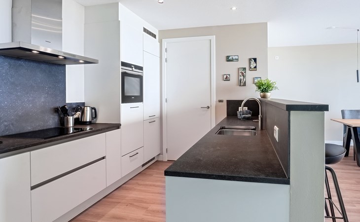De ruime woonkamer heeft een zitgedeelte met een smart-tv. Daarnaast is er een eethoek. De open keuken is volledig uitgerust met onder andere een koel-vriescombinatie, combi-oven, Nespresso apparaat en een vaatwasser.