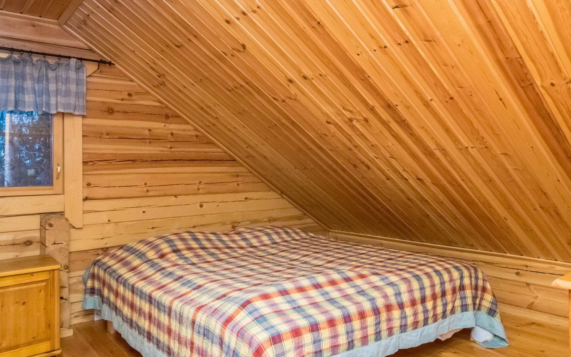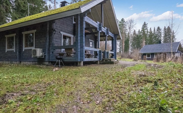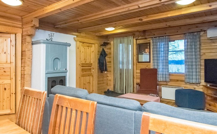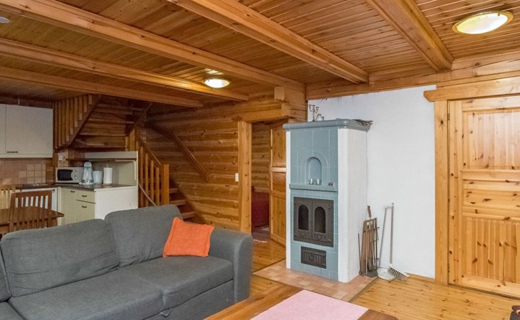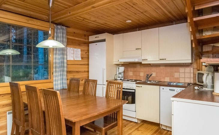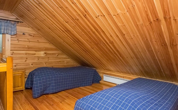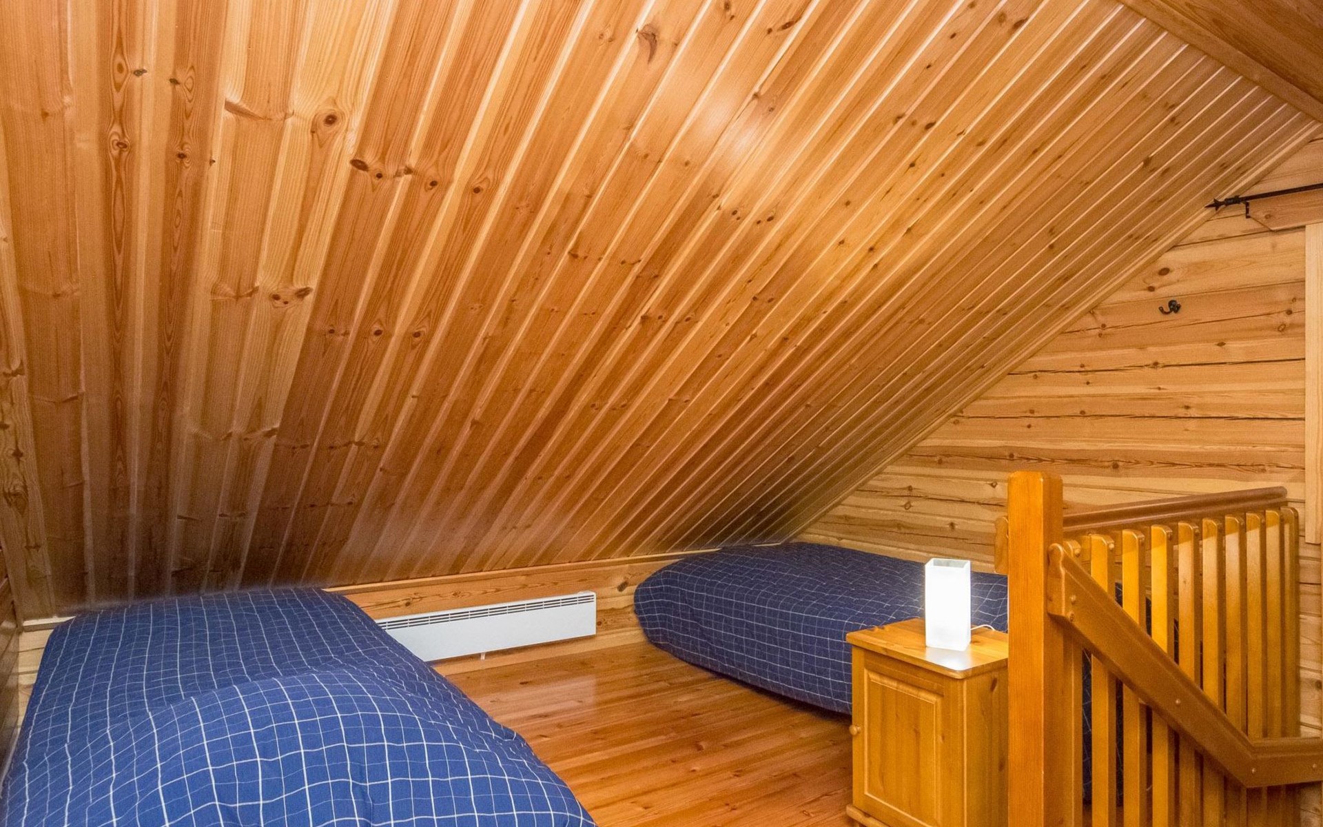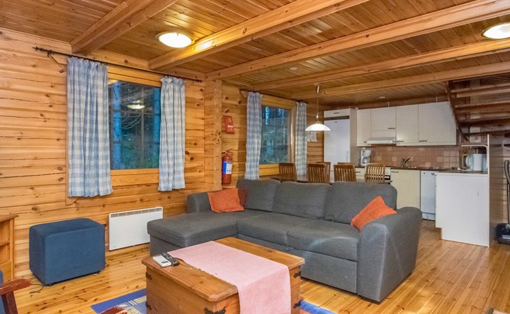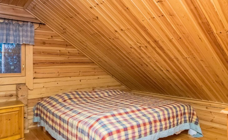 Log cabin 2006, living room / kitchen with sofa bed, 2 bedrooms with 2 beds in each (one downstairs, another upstairs), sleeping loft with 4 beds, wood-heated sauna, washroom, toilet downstairs and upstairs, covered porch.