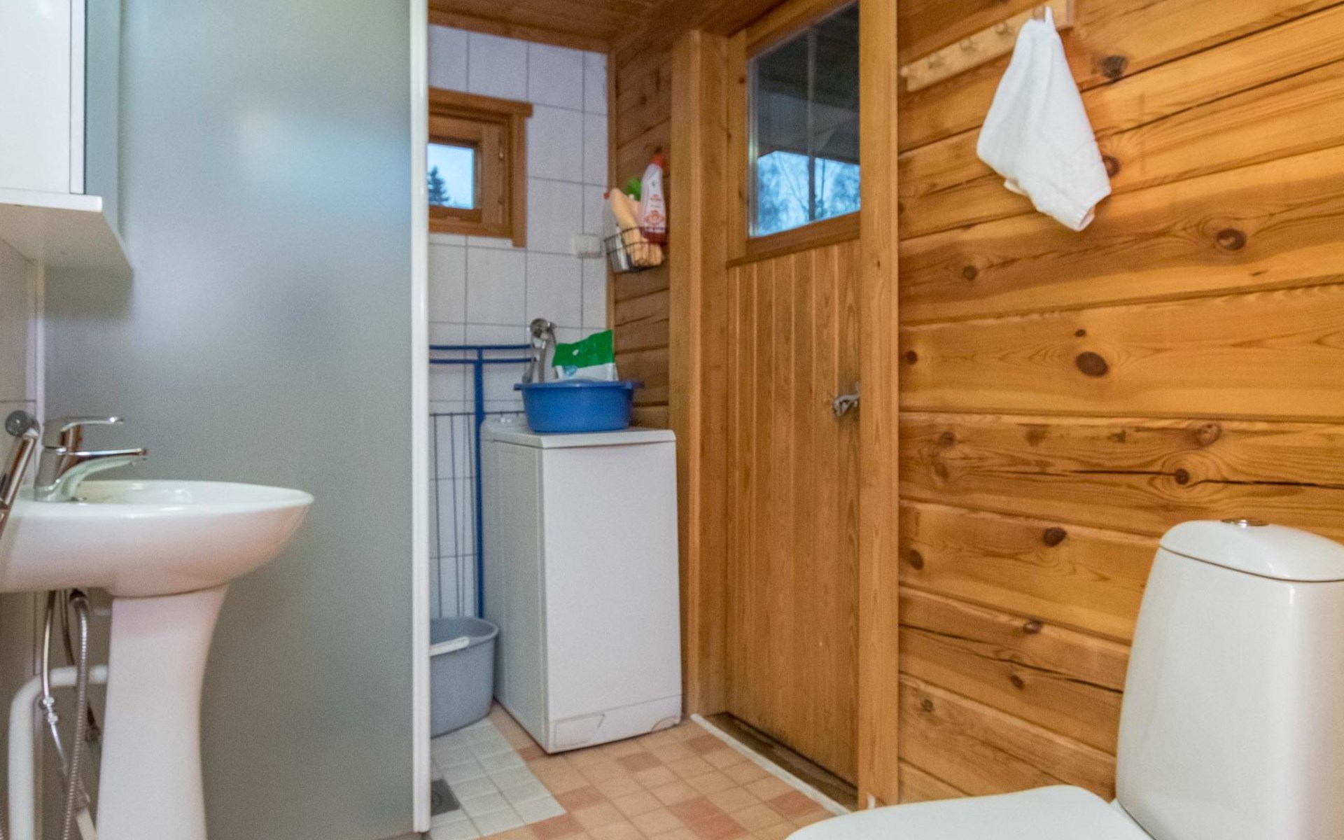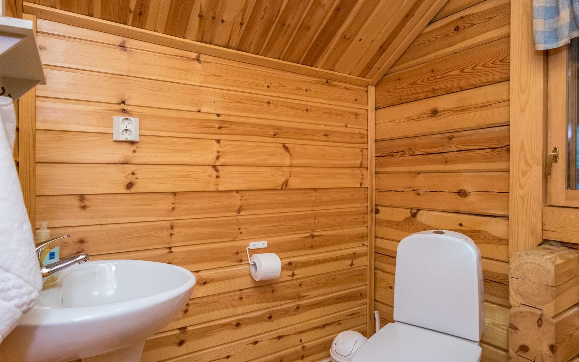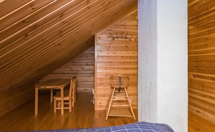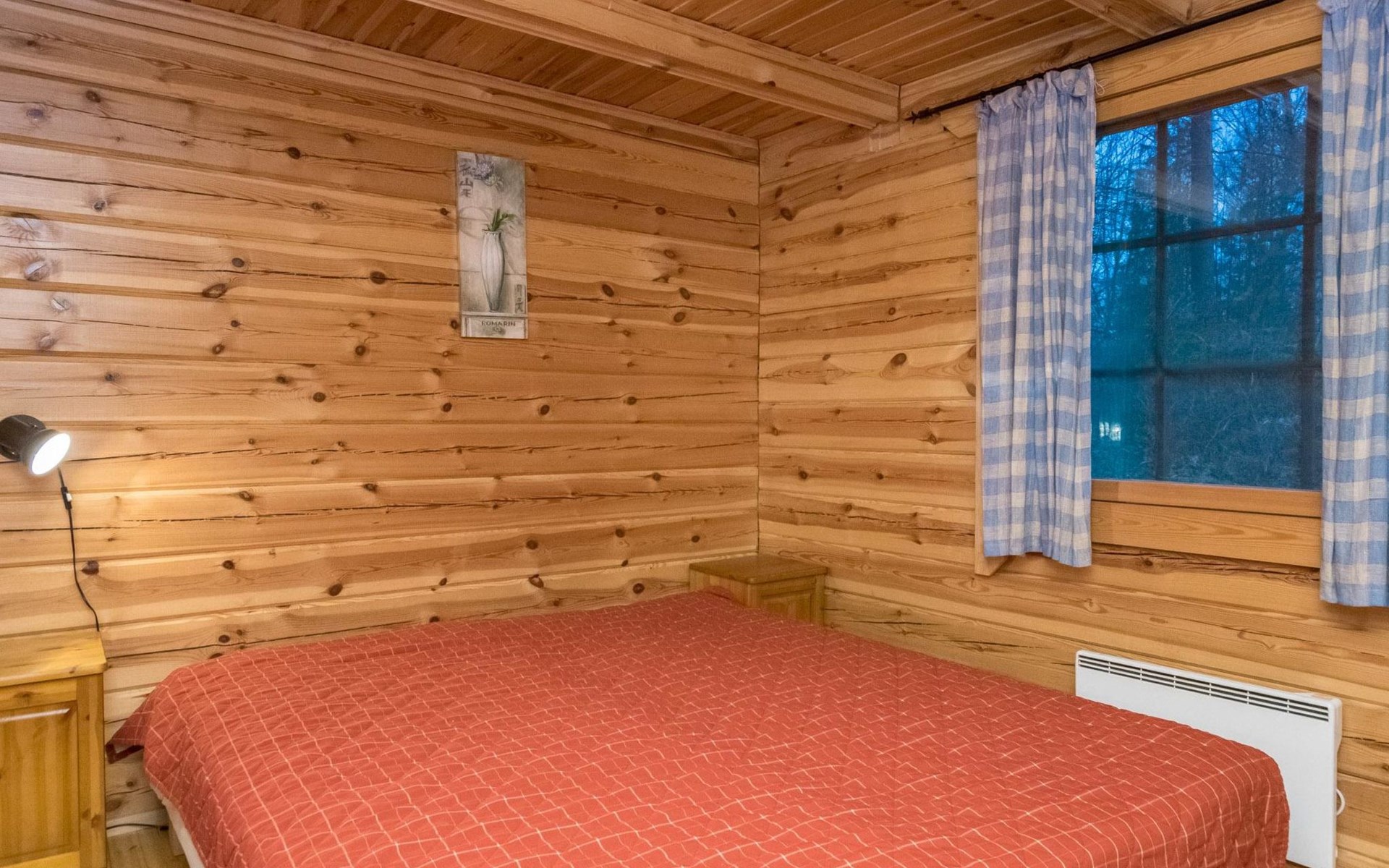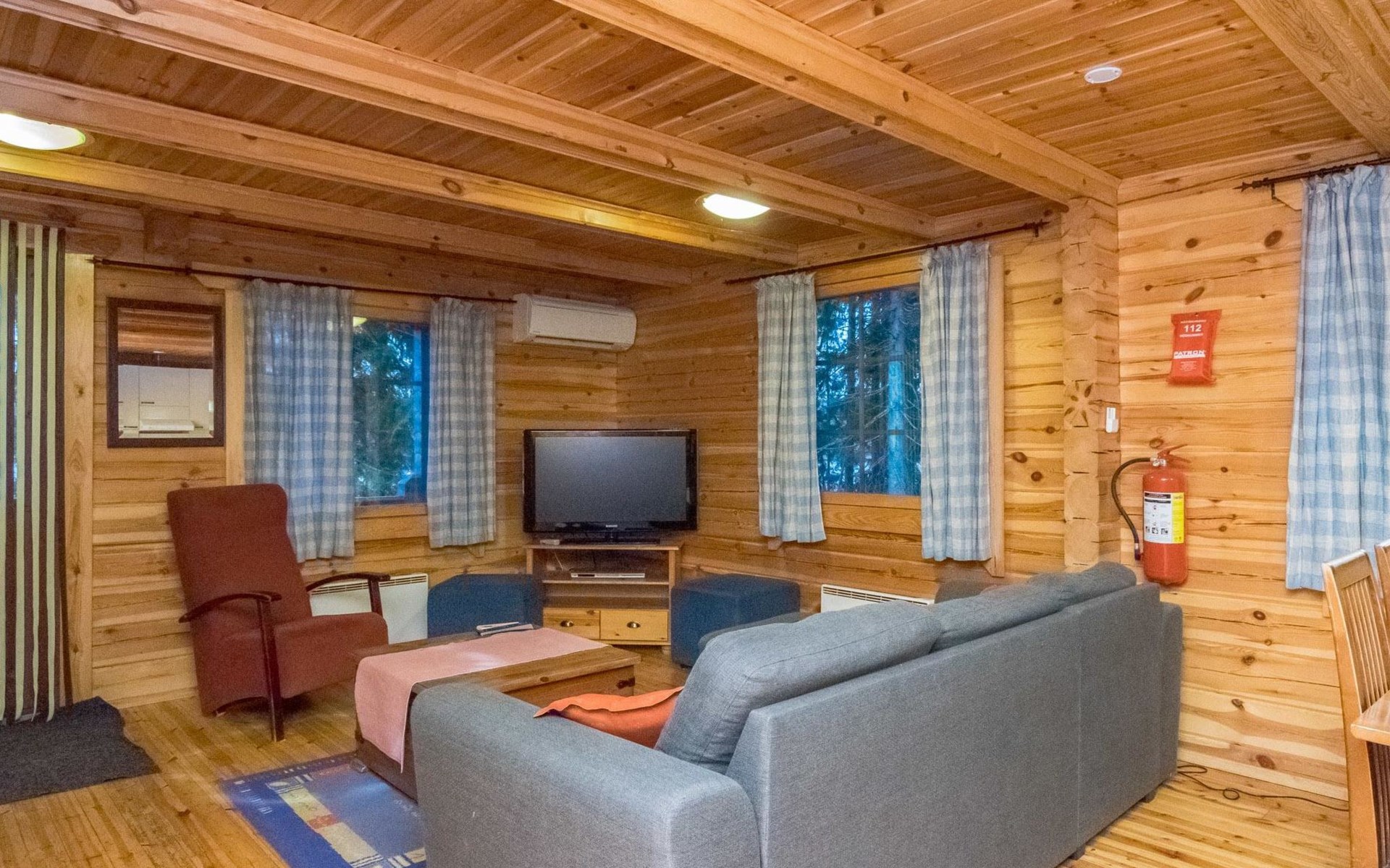 Log cabin 2006, living room / kitchen with sofa bed, 2 bedrooms with 2 beds in each (one downstairs, another upstairs), sleeping loft with 4 beds, wood-heated sauna, washroom, toilet downstairs and upstairs, covered porch.
