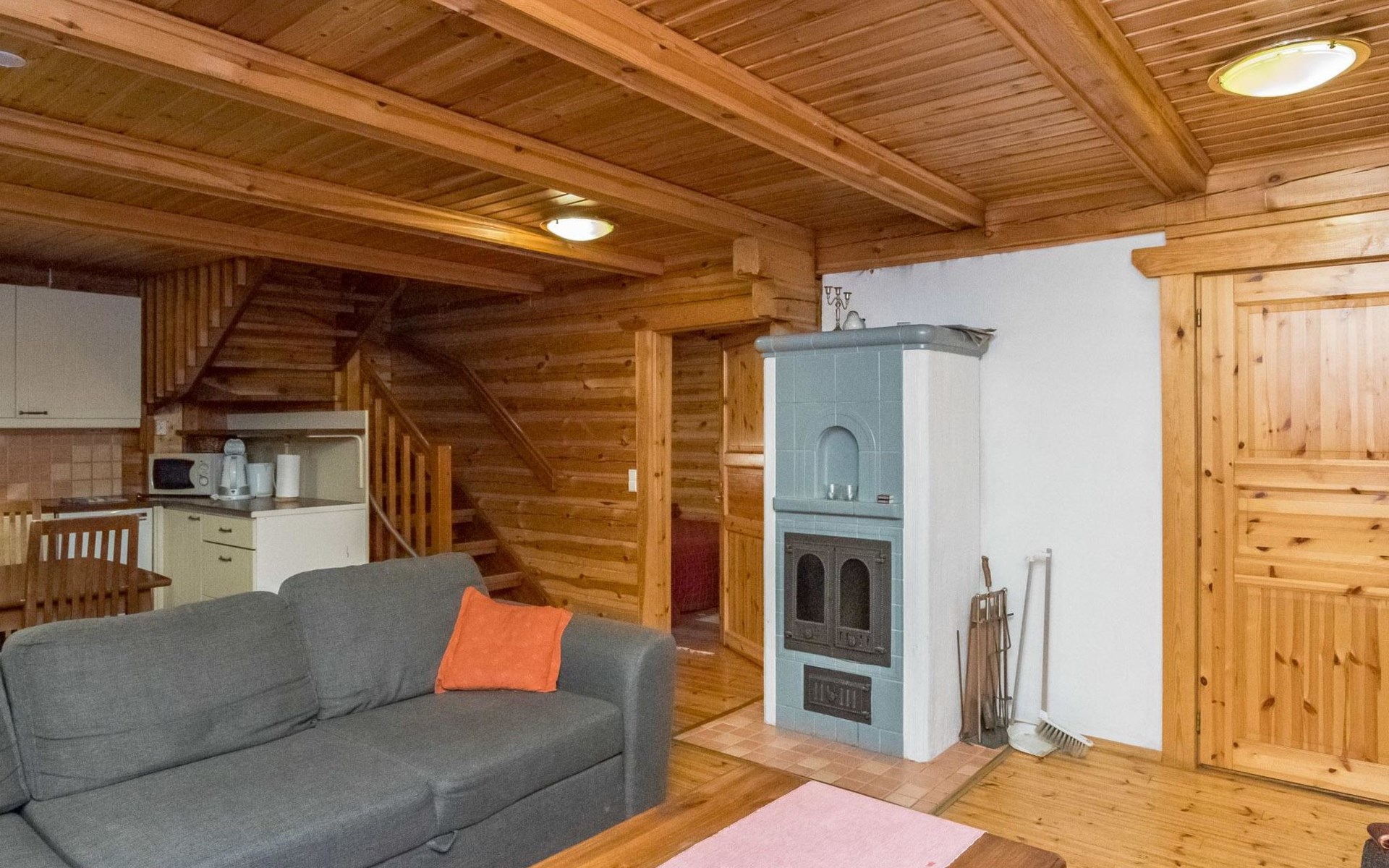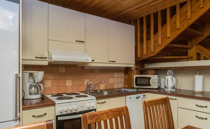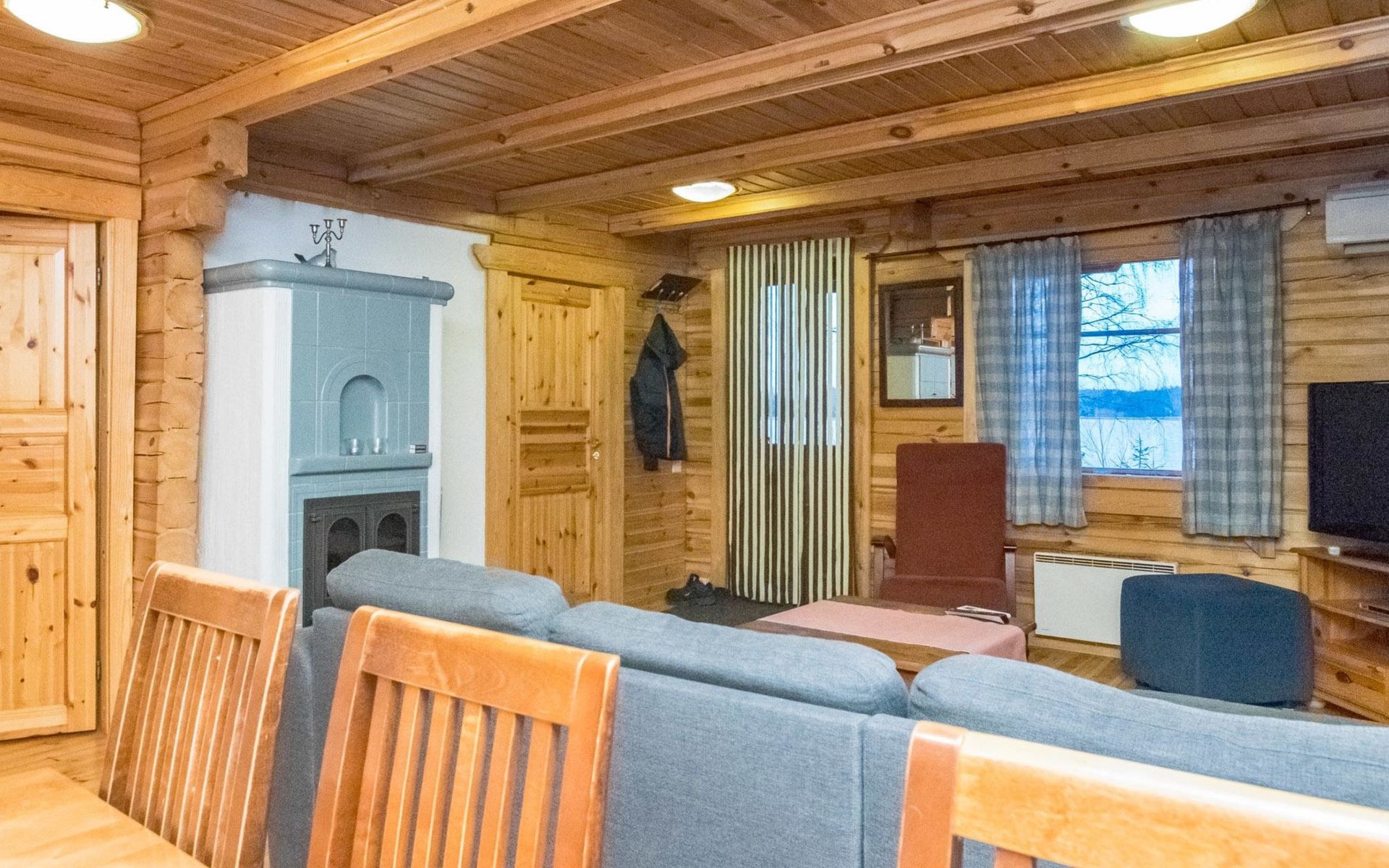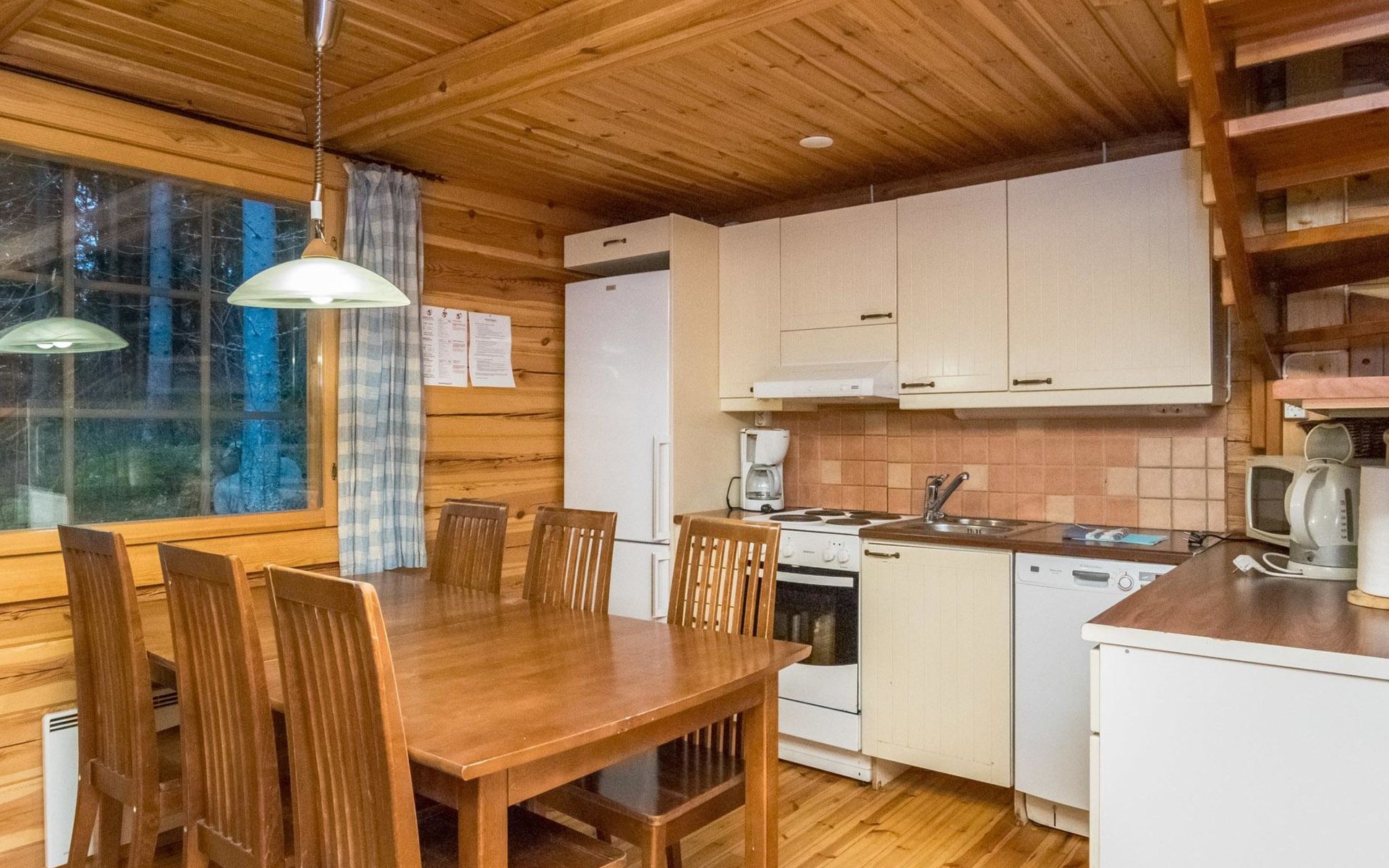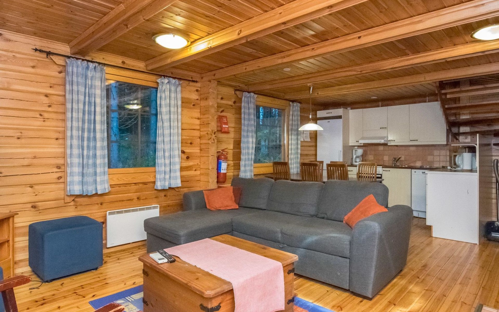 Log cabin 2006, living room / kitchen with sofa bed, 2 bedrooms with 2 beds in each (one downstairs, another upstairs), sleeping loft with 4 beds, wood-heated sauna, washroom, toilet downstairs and upstairs, covered porch.