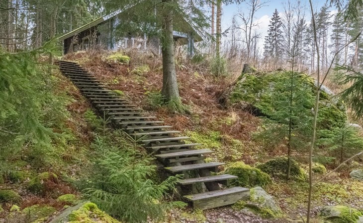 37 km to the north from Hämeenlinna, lake Iso-Roine 20 m (length 8 km, width 2 km), rocky bottom, pier. There are steep stairs starting in front of the cabin to the pier. Nature trail to the pier, where you can go swimming by stairs. Not children-friendly shore. Due to the rocky bottom, access for swimming from the beach is a bit challenging. 200 m to a fine common children-friendly sand beach (shared with neighboring cabins).