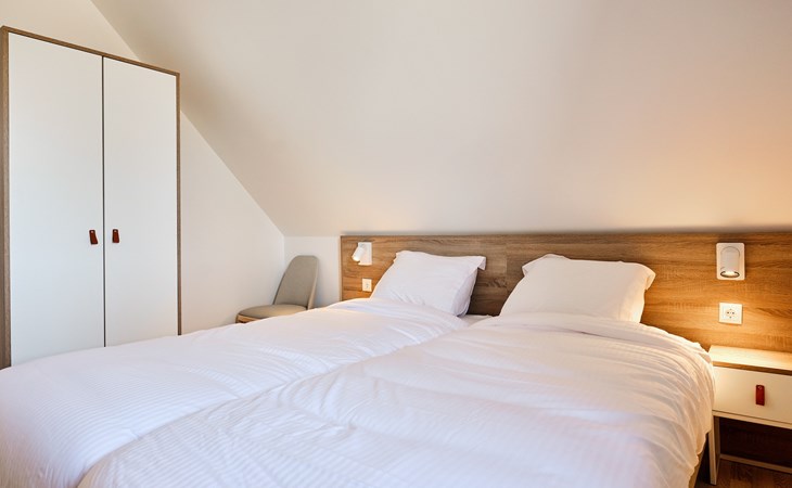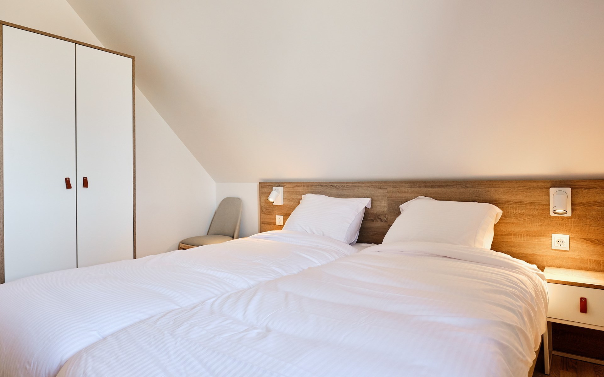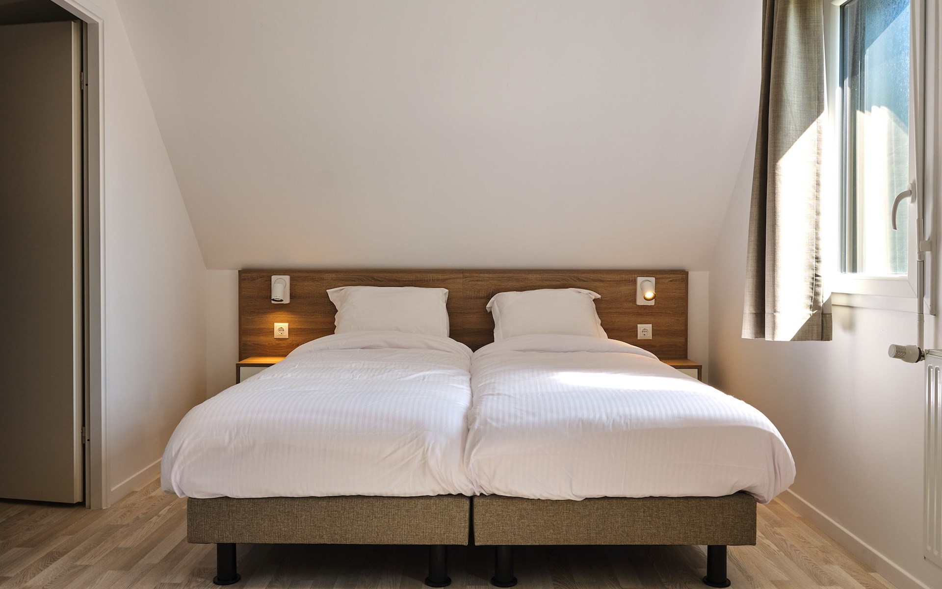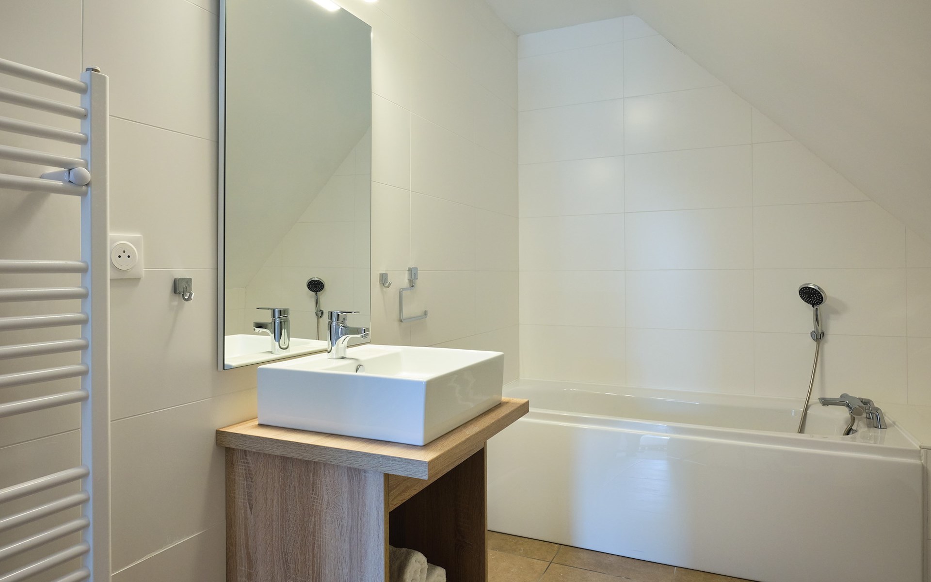 Op de eerste verdieping vind je de andere 2 tweepersoonsslaapkamers, beide met 2 éénpersoonsbedden. Ook hier is een badkamer met douche, ligbad, wastafel en toilet.