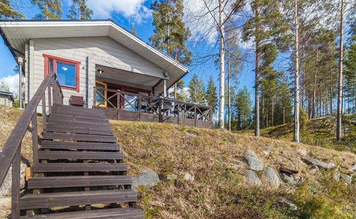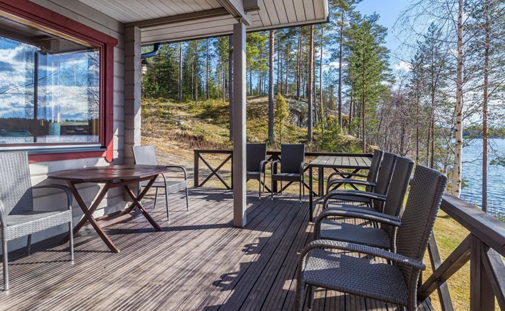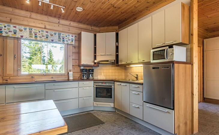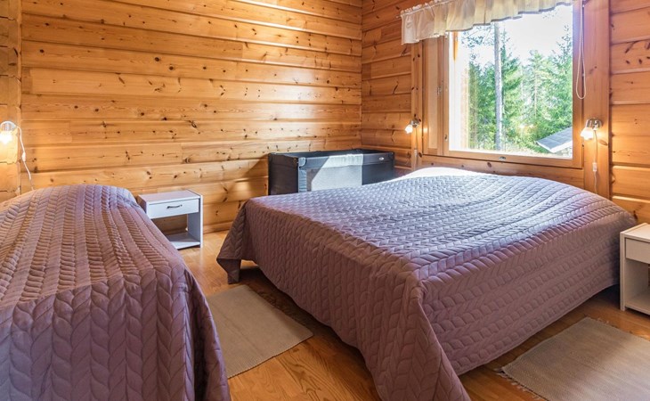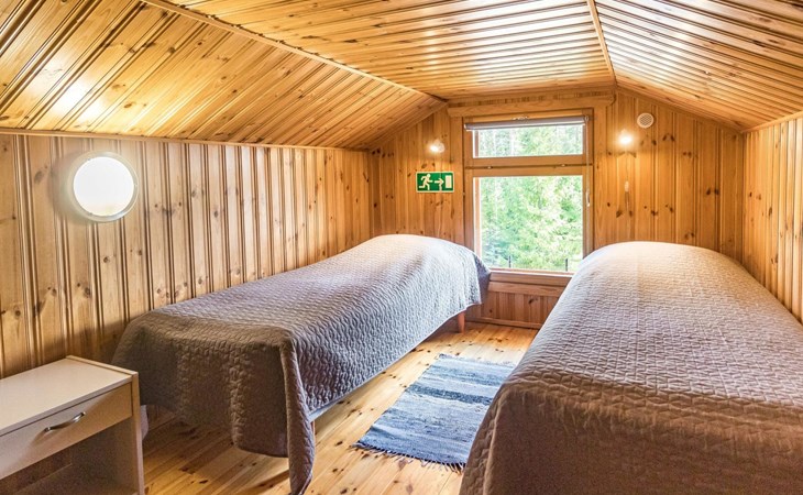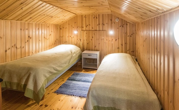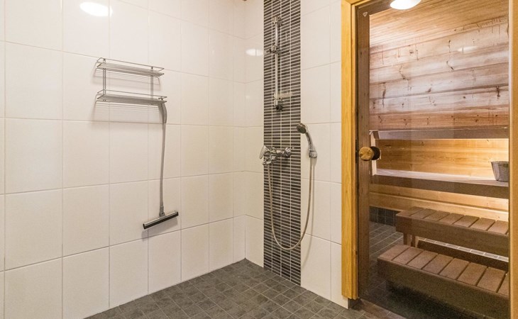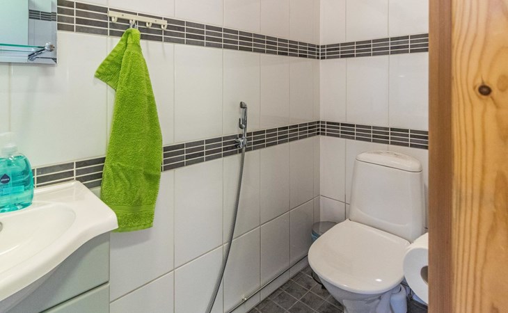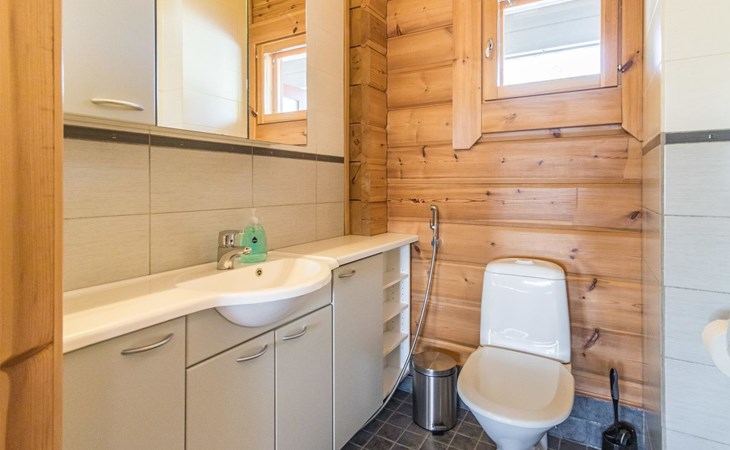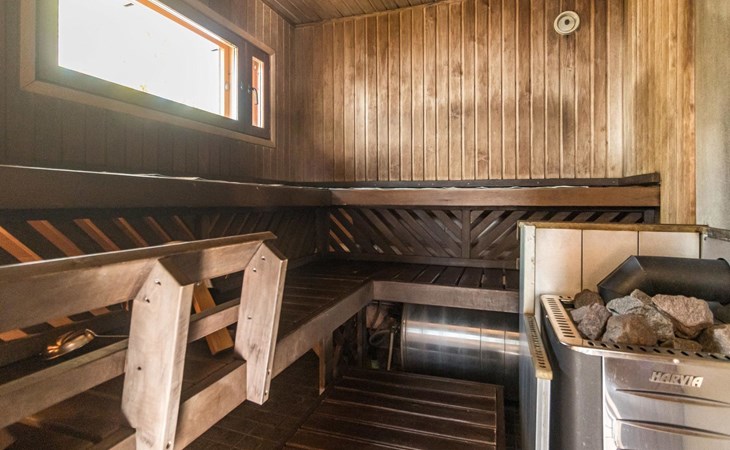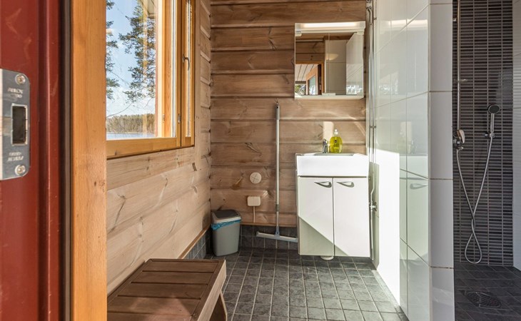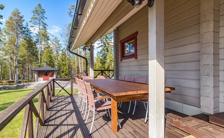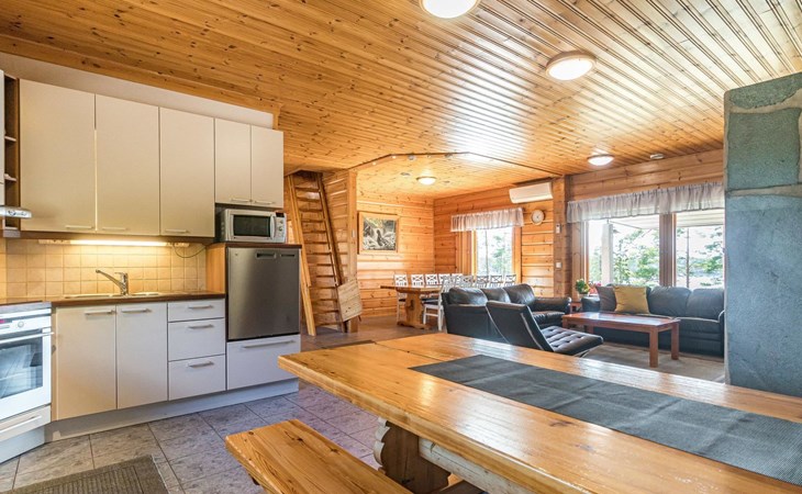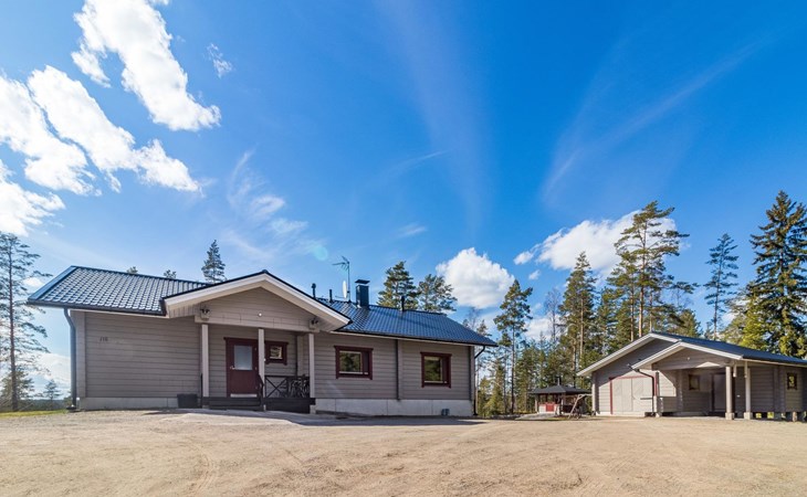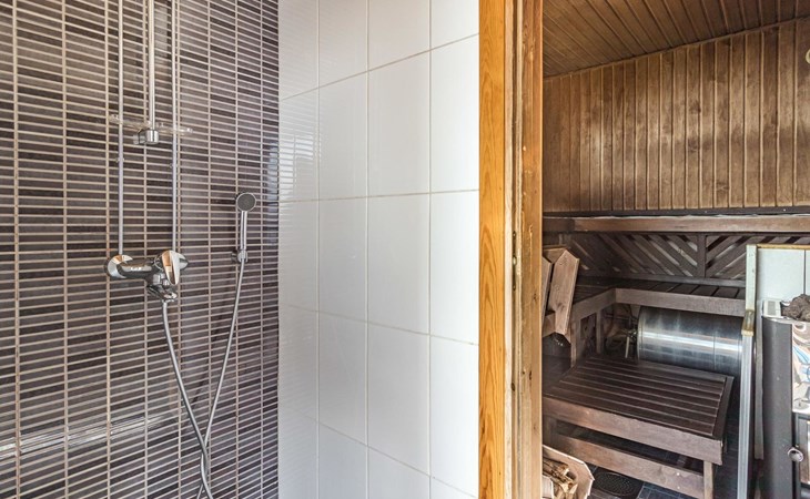 Wooden house 2007, kitchen, living room, bedroom 2 beds, 2nd bedroom 3 beds, 3rd bedroom 3 beds + cot, sleeping loft (20m²) 4 beds, utility room, washroom, sauna (electric stove) with 2 showers, roofed terrace. Steep stairs to loft. House has mechanical ventilation.