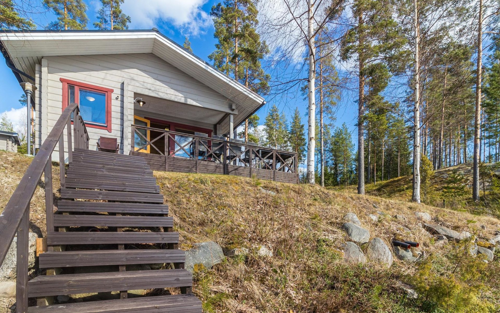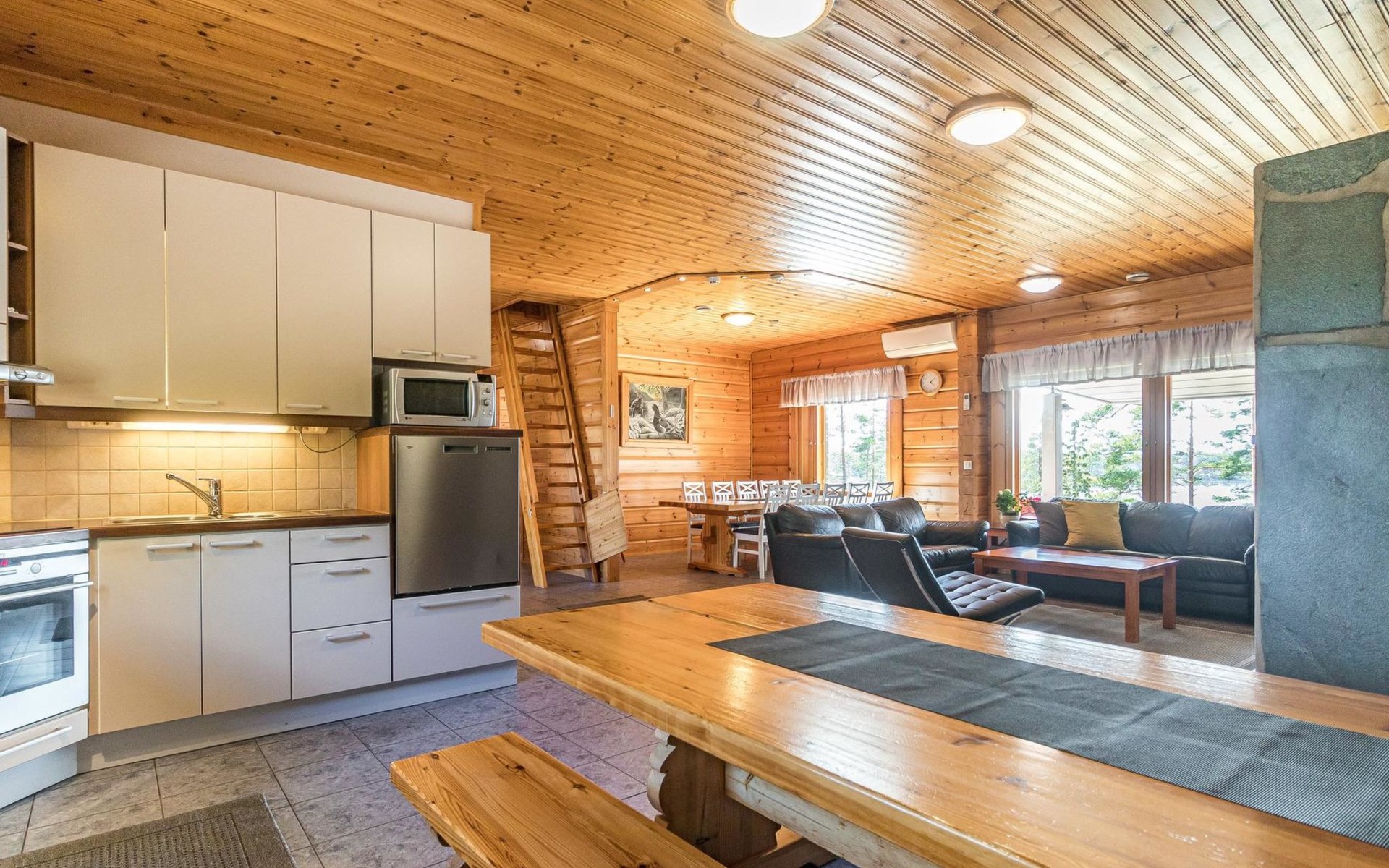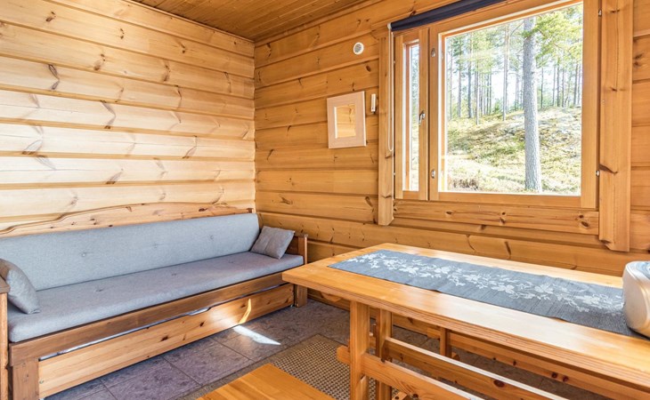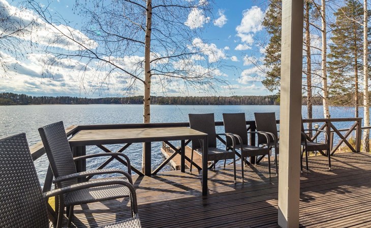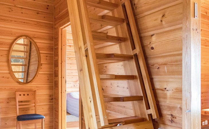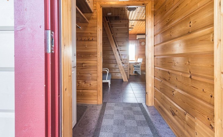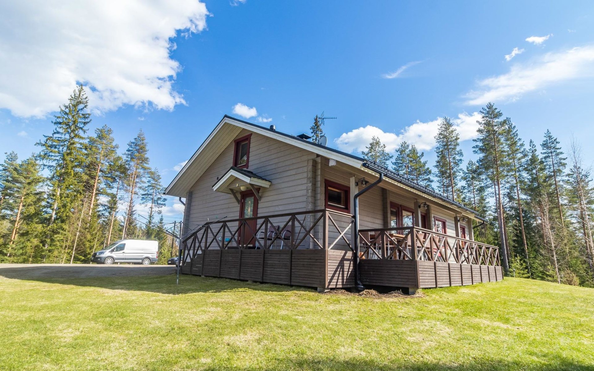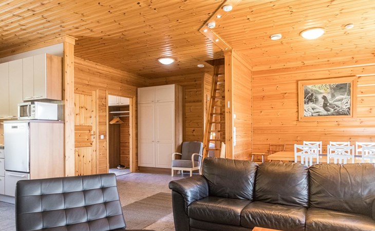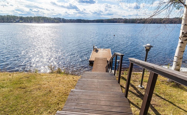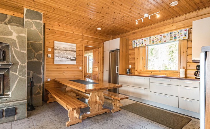 Wooden house 2007, kitchen, living room, bedroom 2 beds, 2nd bedroom 3 beds, 3rd bedroom 3 beds + cot, sleeping loft (20m²) 4 beds, utility room, washroom, sauna (electric stove) with 2 showers, roofed terrace. Steep stairs to loft. House has mechanical ventilation.