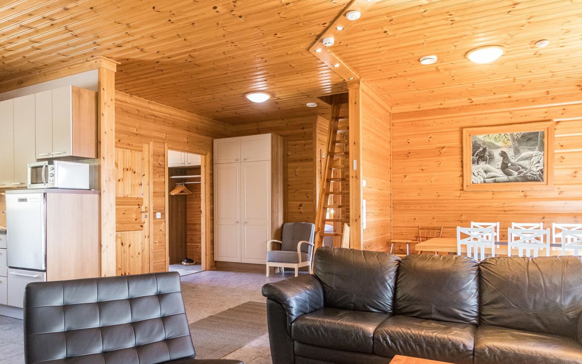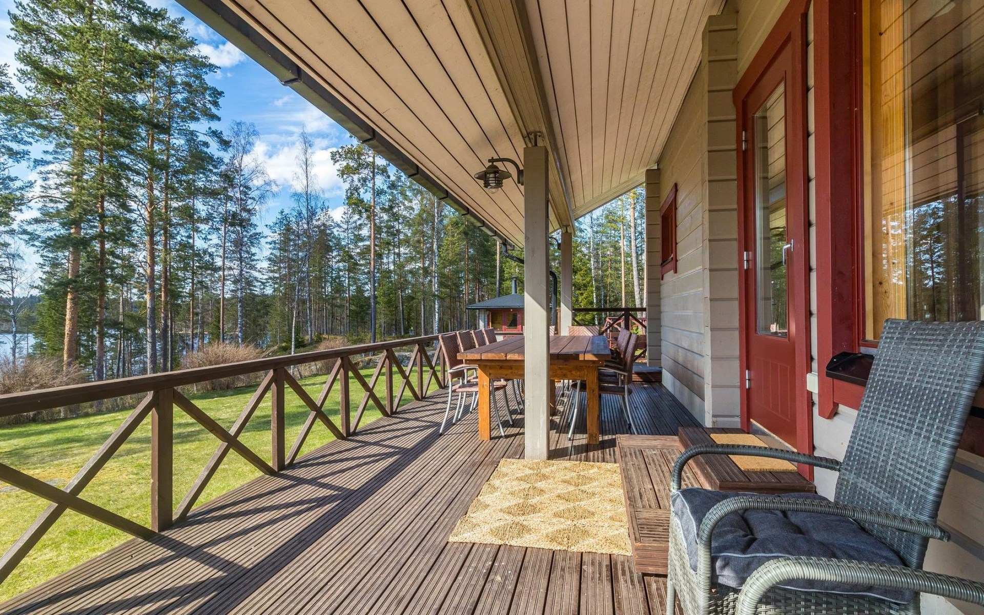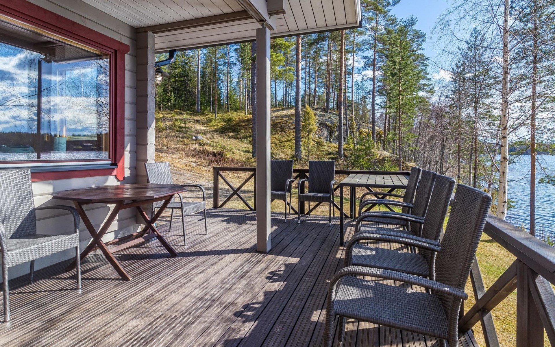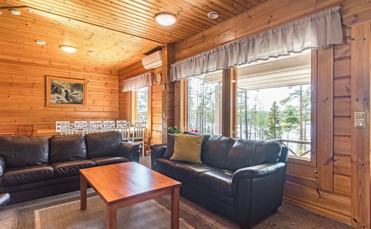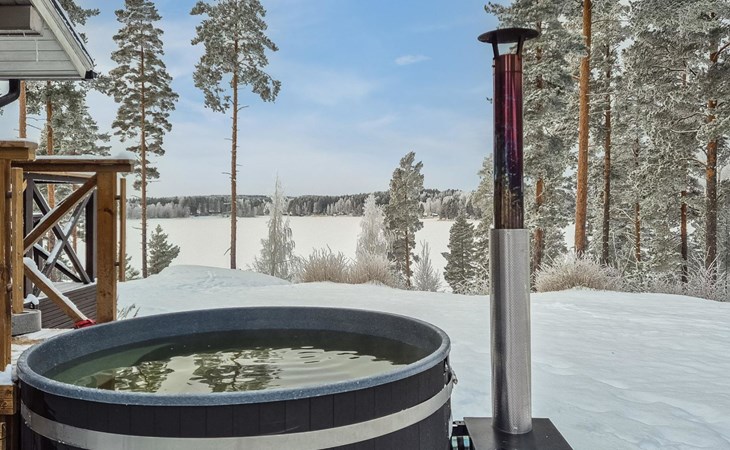 Wooden house 2007, kitchen, living room, bedroom 2 beds, 2nd bedroom 3 beds, 3rd bedroom 3 beds + cot, sleeping loft (20m²) 4 beds, utility room, washroom, sauna (electric stove) with 2 showers, roofed terrace. Steep stairs to loft. House has mechanical ventilation.