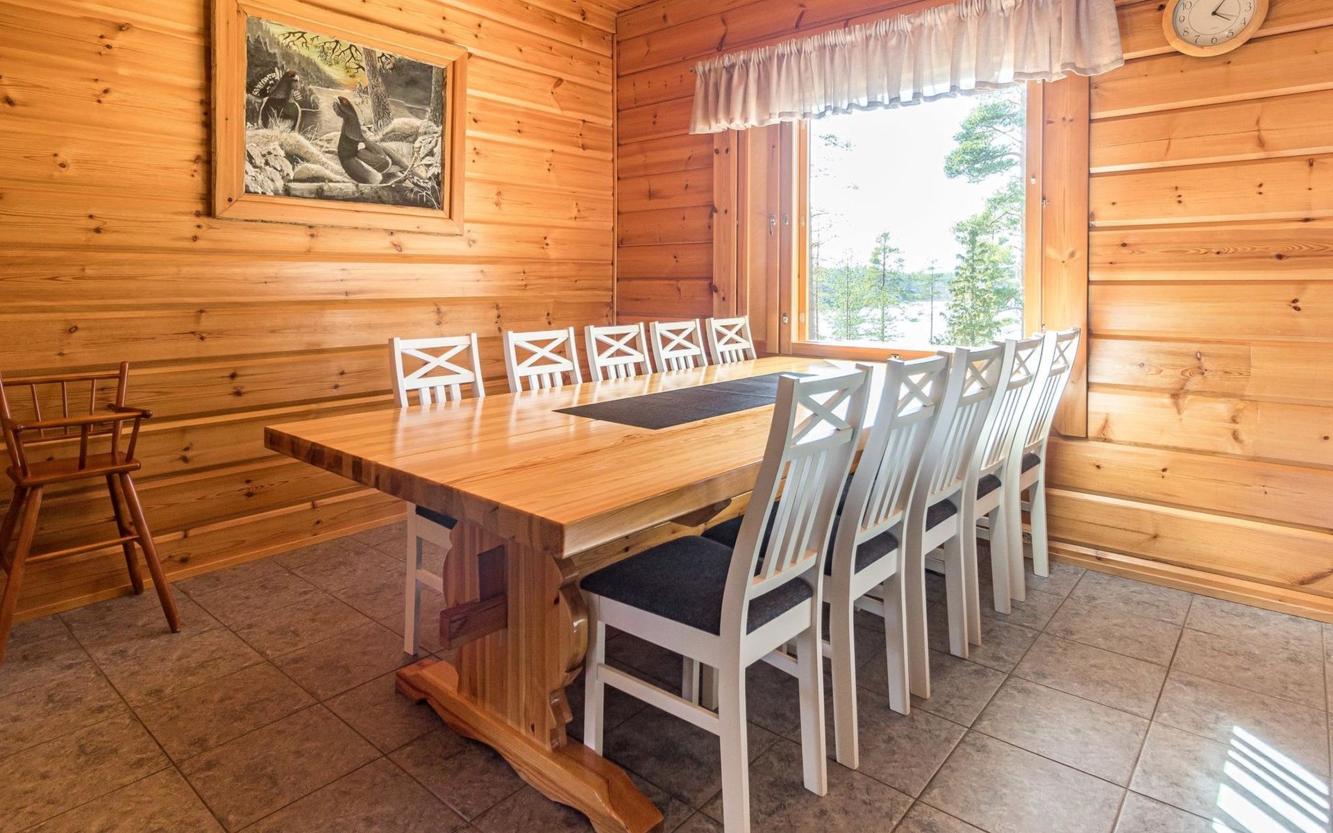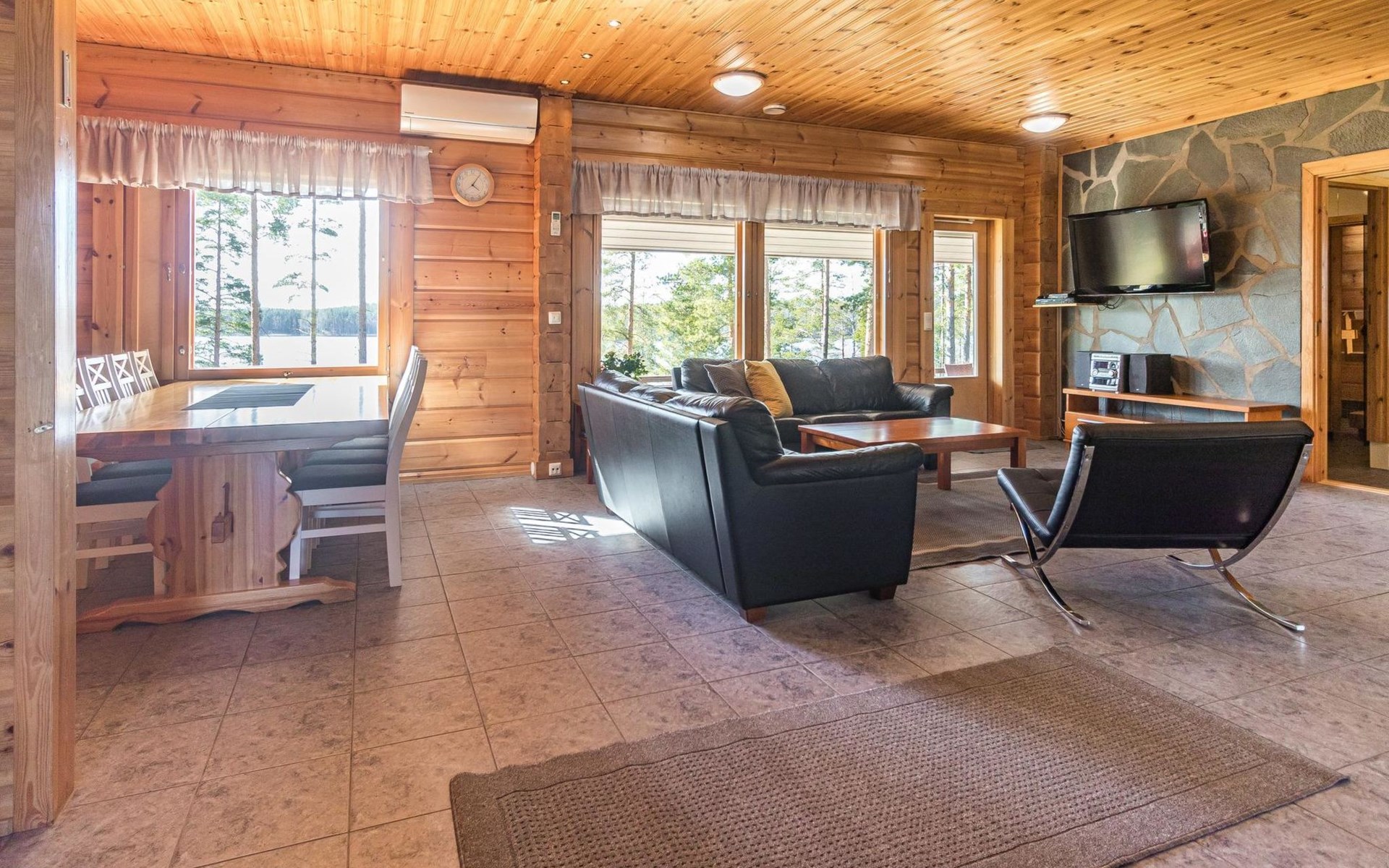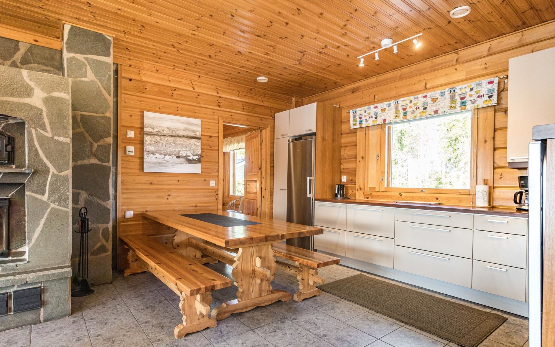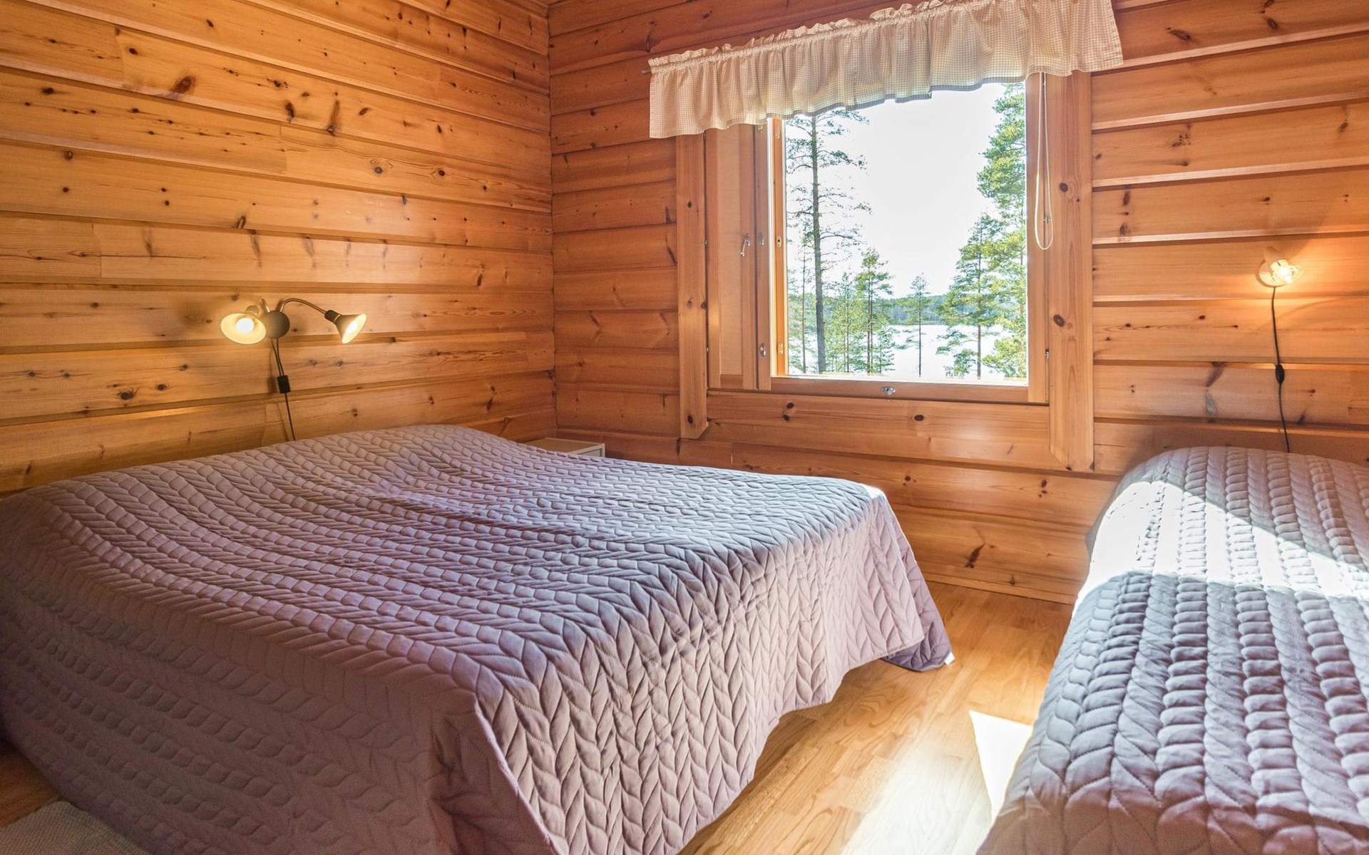 Wooden house 2007, kitchen, living room, bedroom 2 beds, 2nd bedroom 3 beds, 3rd bedroom 3 beds + cot, sleeping loft (20m²) 4 beds, utility room, washroom, sauna (electric stove) with 2 showers, roofed terrace. Steep stairs to loft. House has mechanical ventilation.