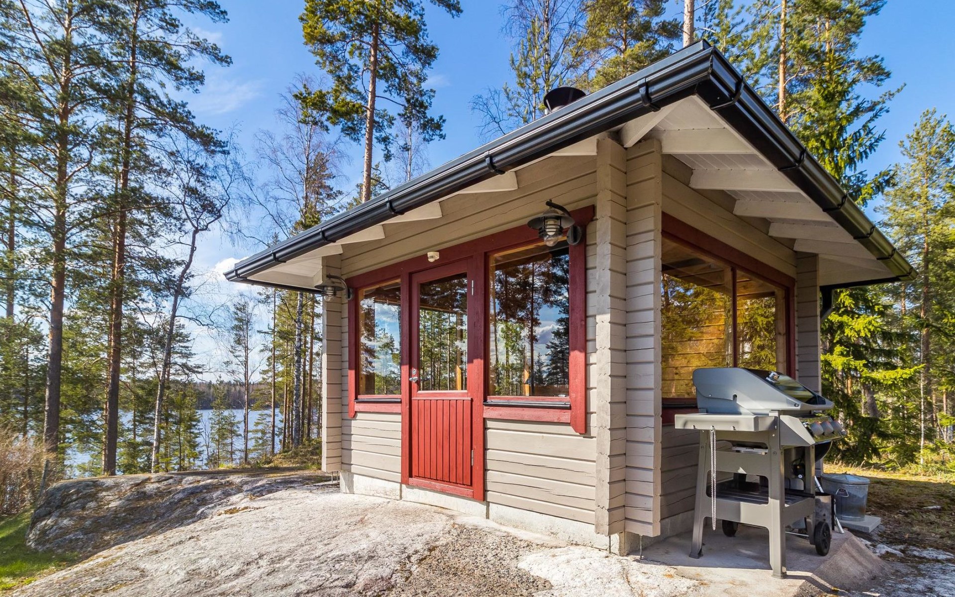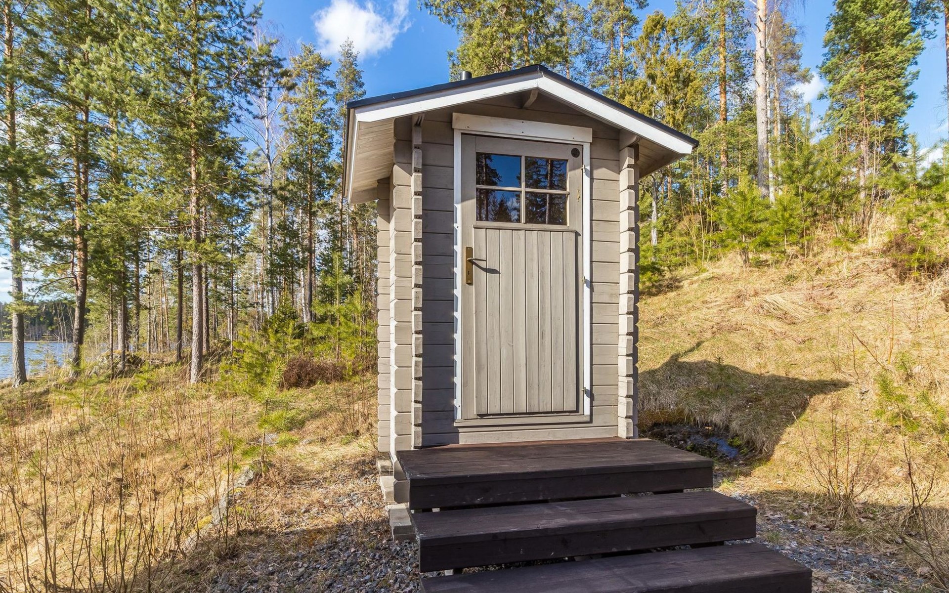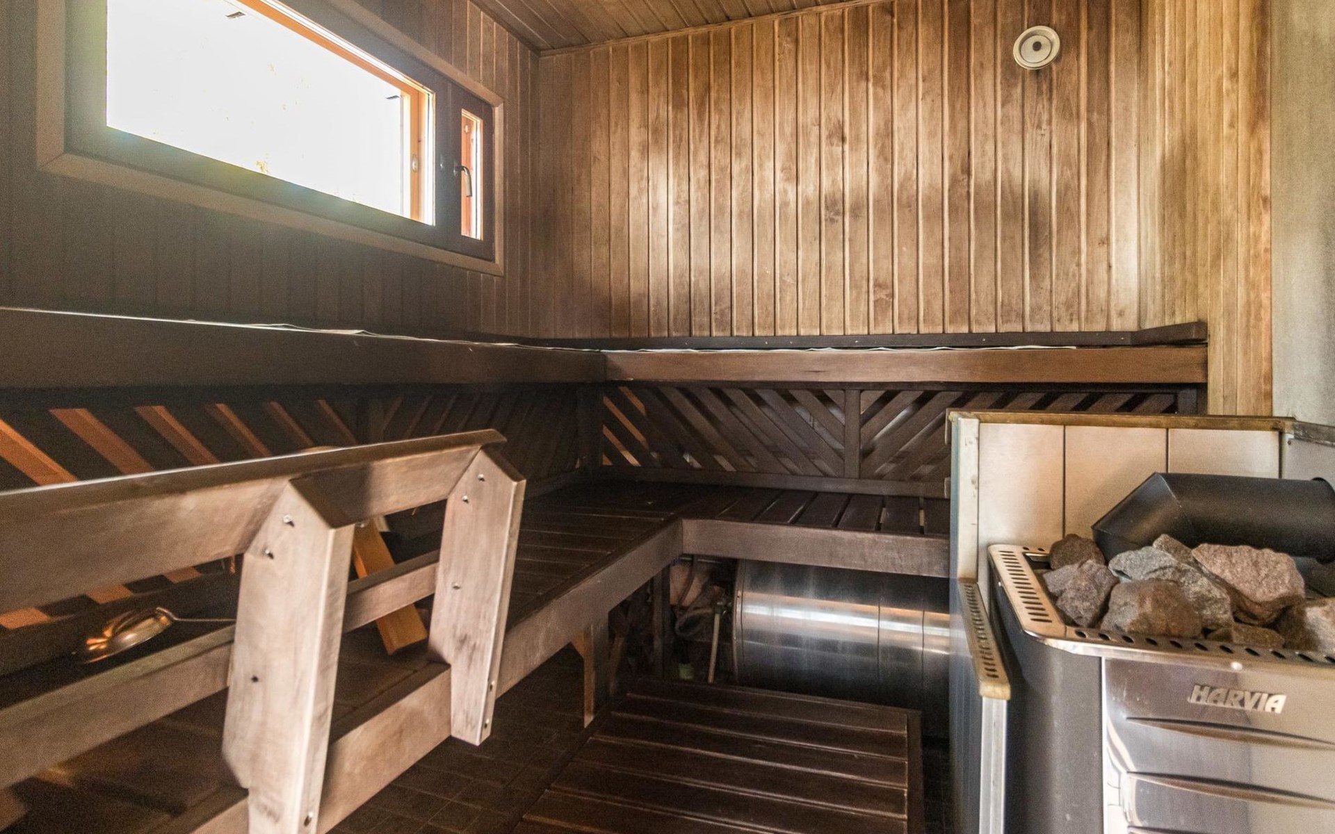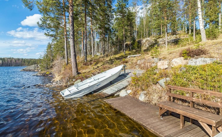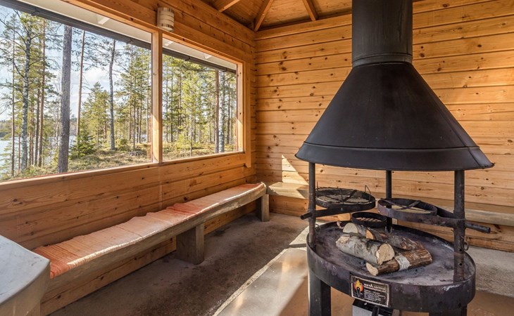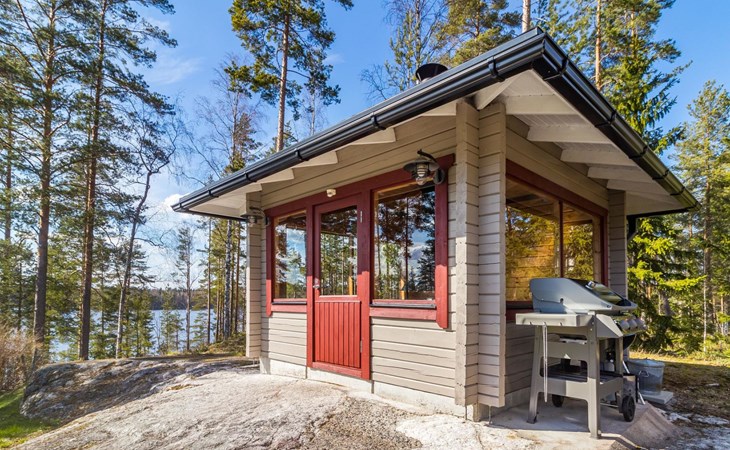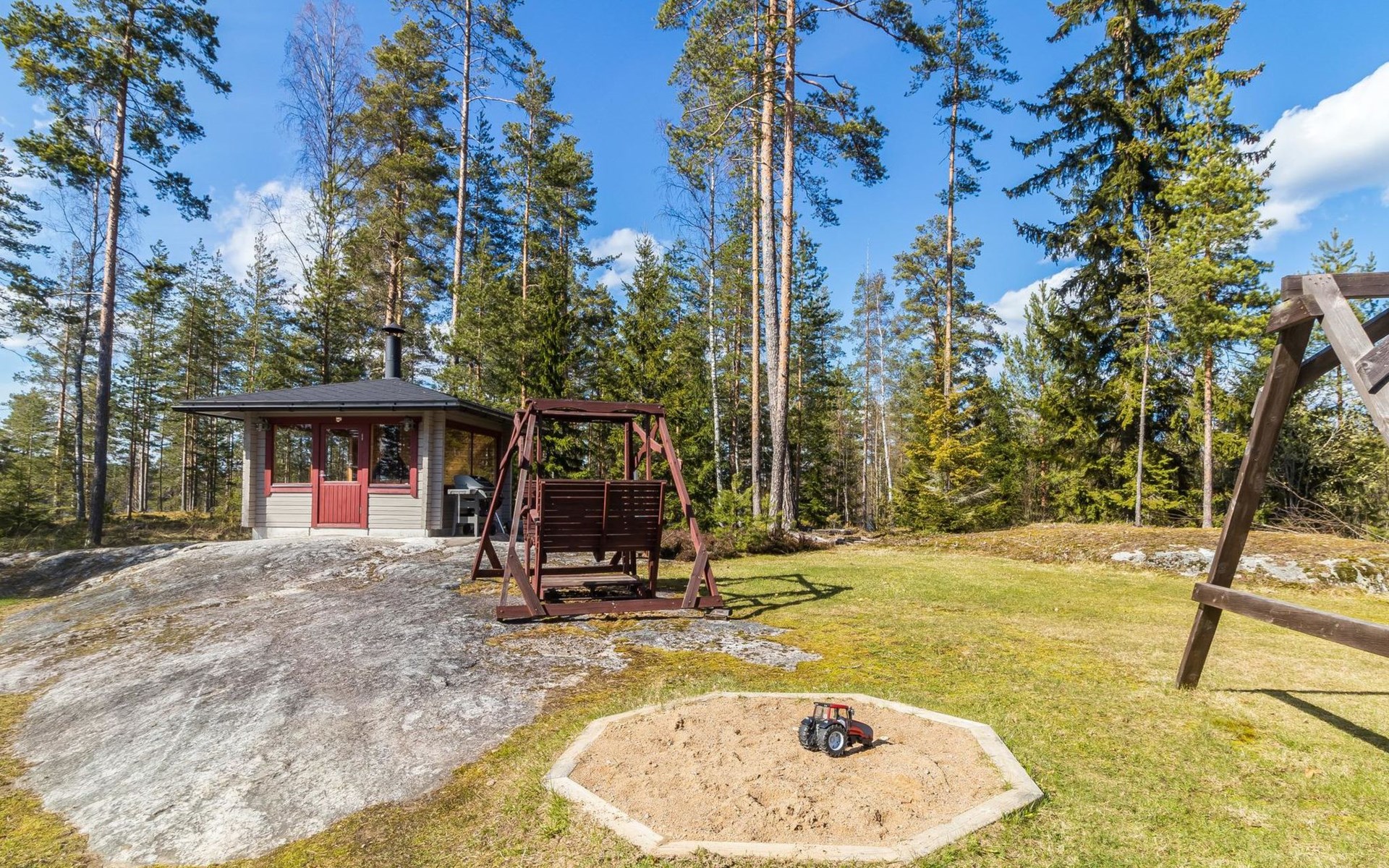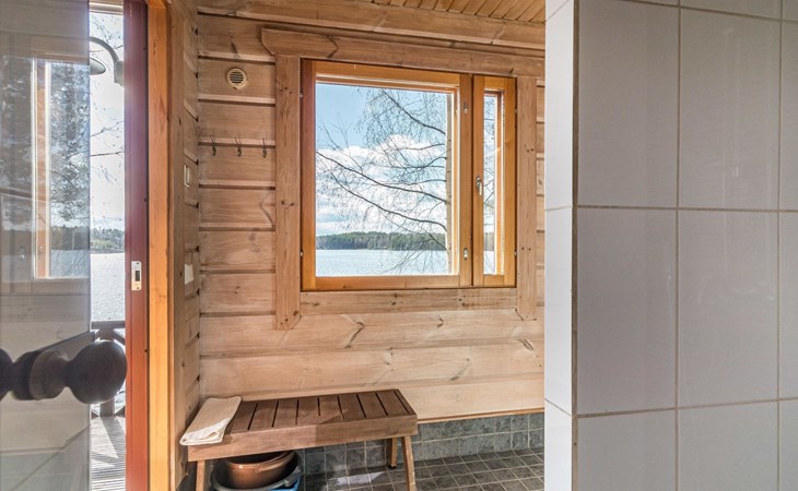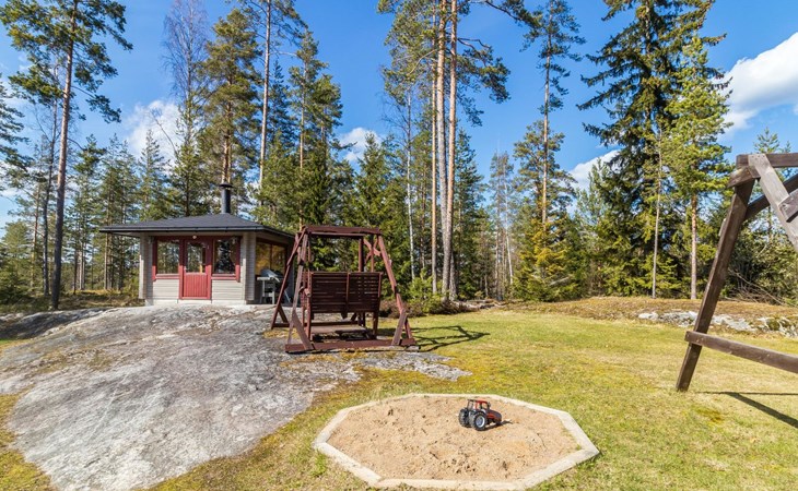 Separate sauna building (26,5m²) with wood-fired stove, cold and hot water from shower, dressing room, washroom, room with fireplace and toilet. Garage. Drying drum and satellit TV.