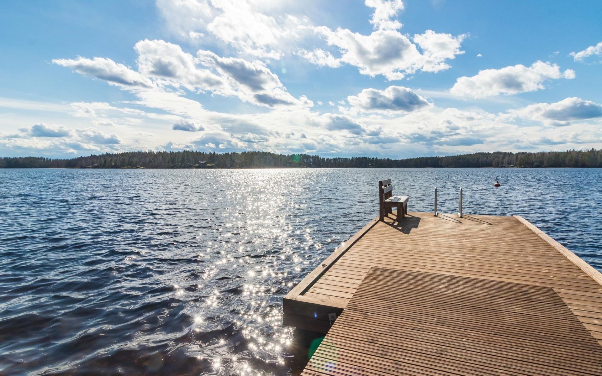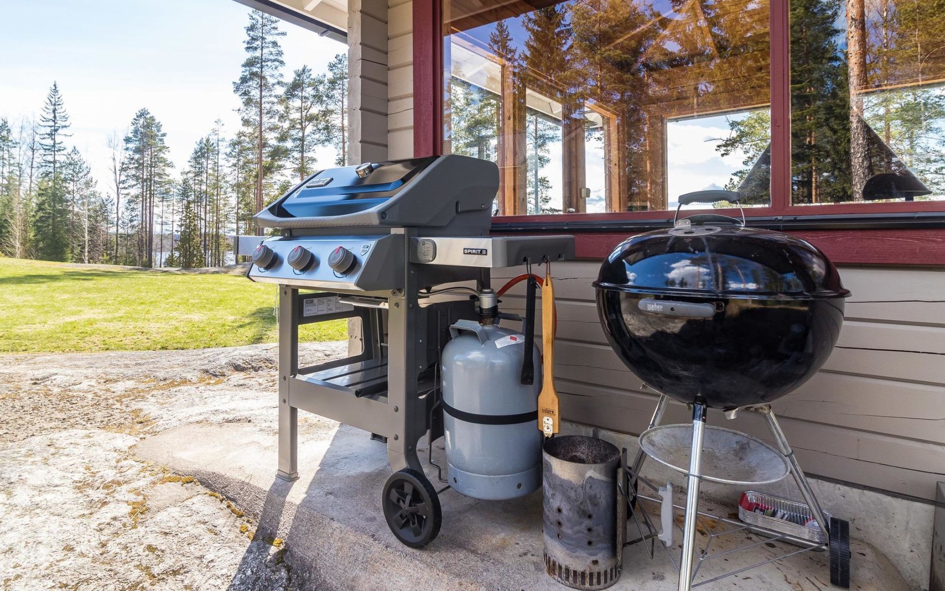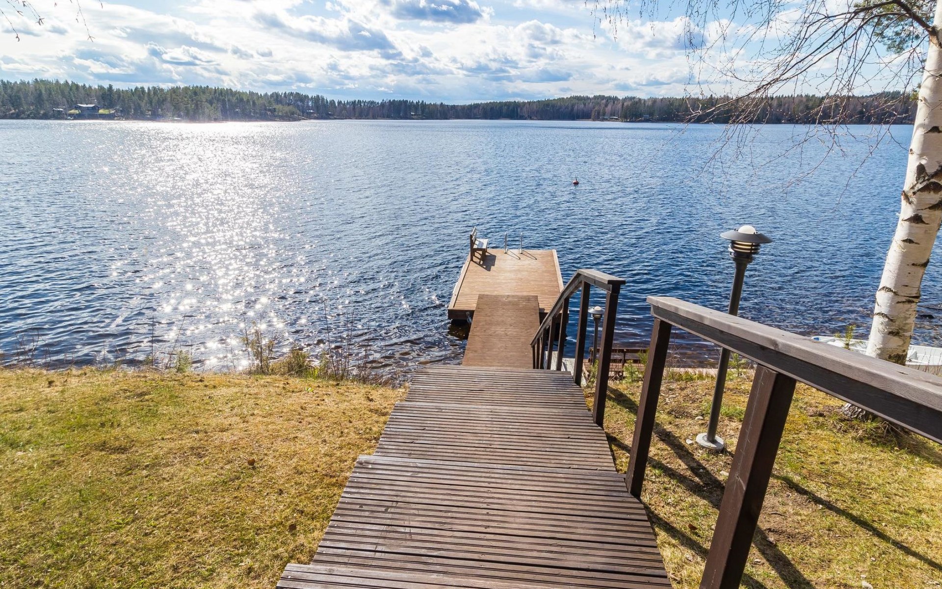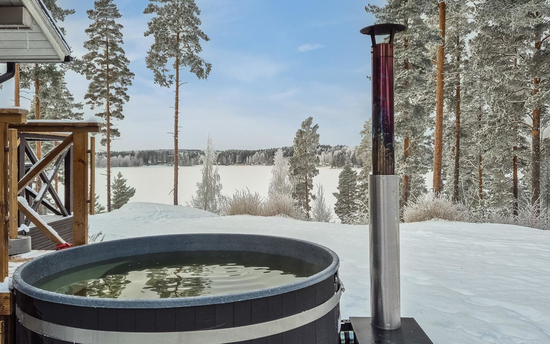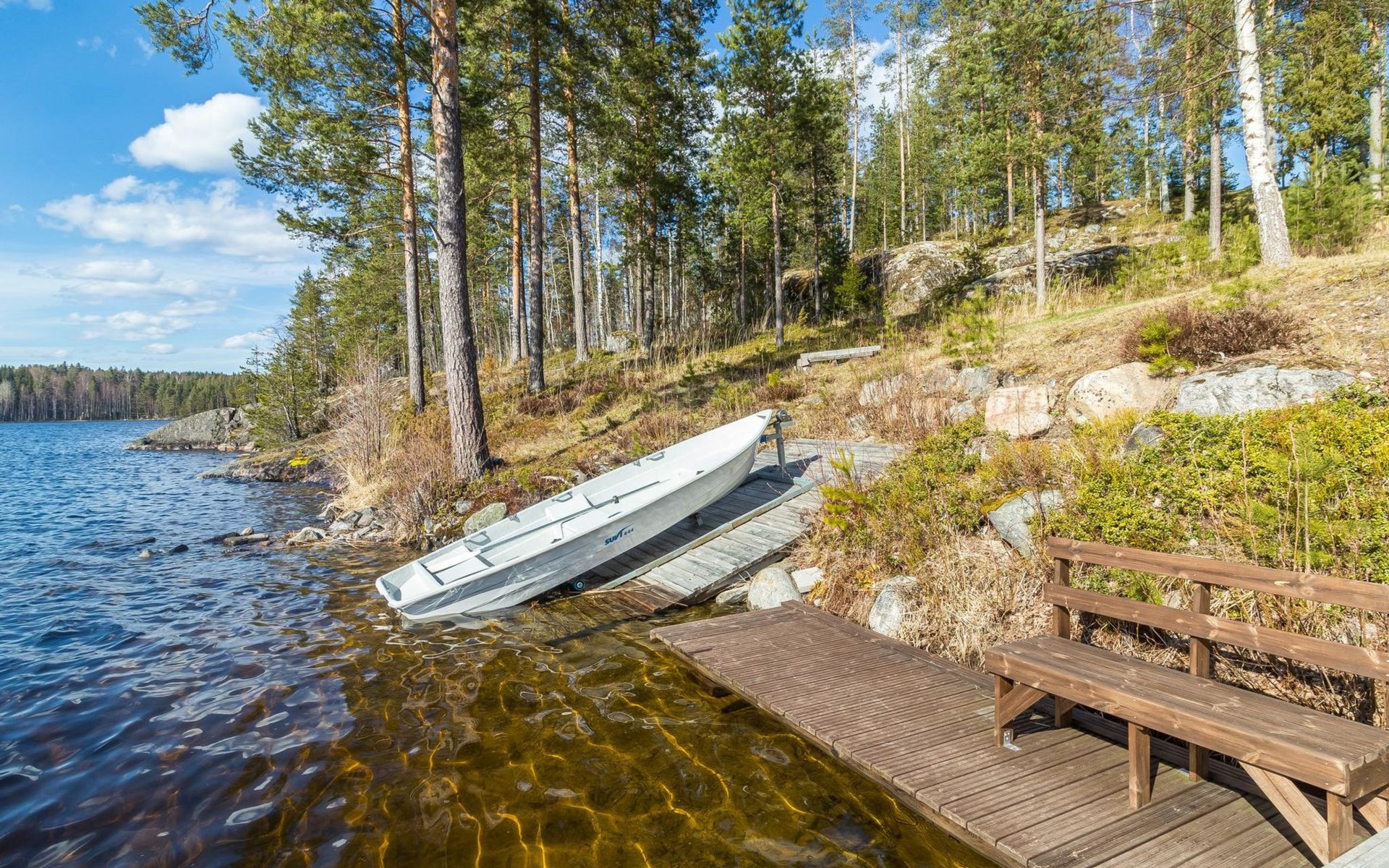 Separate sauna building (26,5m²) with wood-fired stove, cold and hot water from shower, dressing room, washroom, room with fireplace and toilet. Garage. Drying drum and satellit TV.