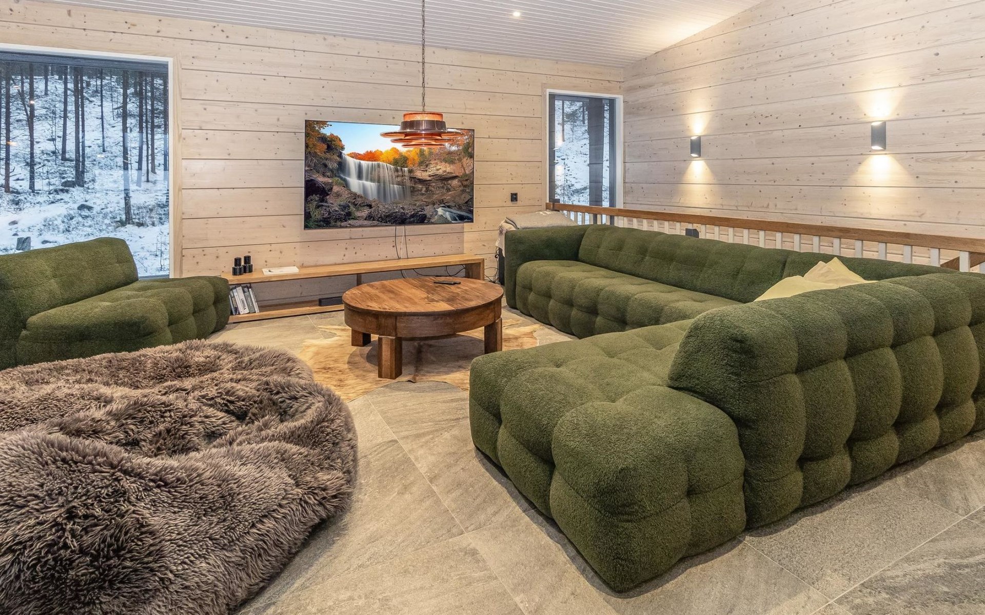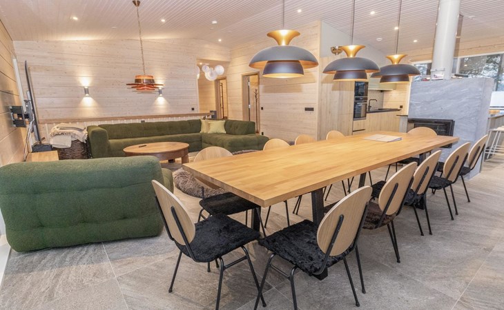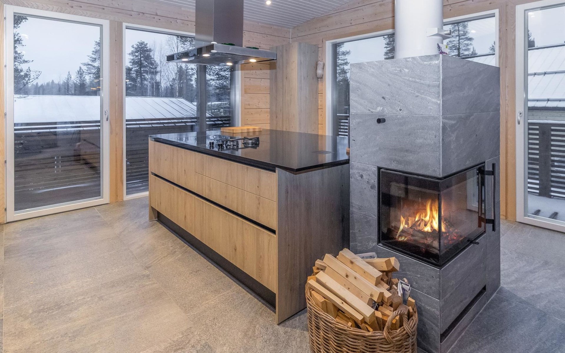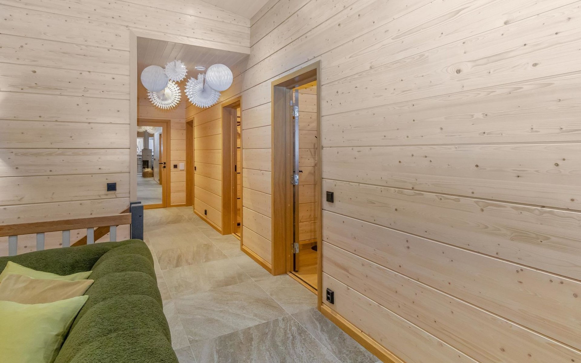 The villa’s large and bright living area offers plenty of space for relaxation and socializing, with space for up to 14 people at the dining table. This 2023 built wooden villa boasts top-notch amenities: a fully equipped kitchen and a living room with a cozy fireplace, spacious sauna and washroom facilities, and modern conveniences that make everyday life feel like a holiday.