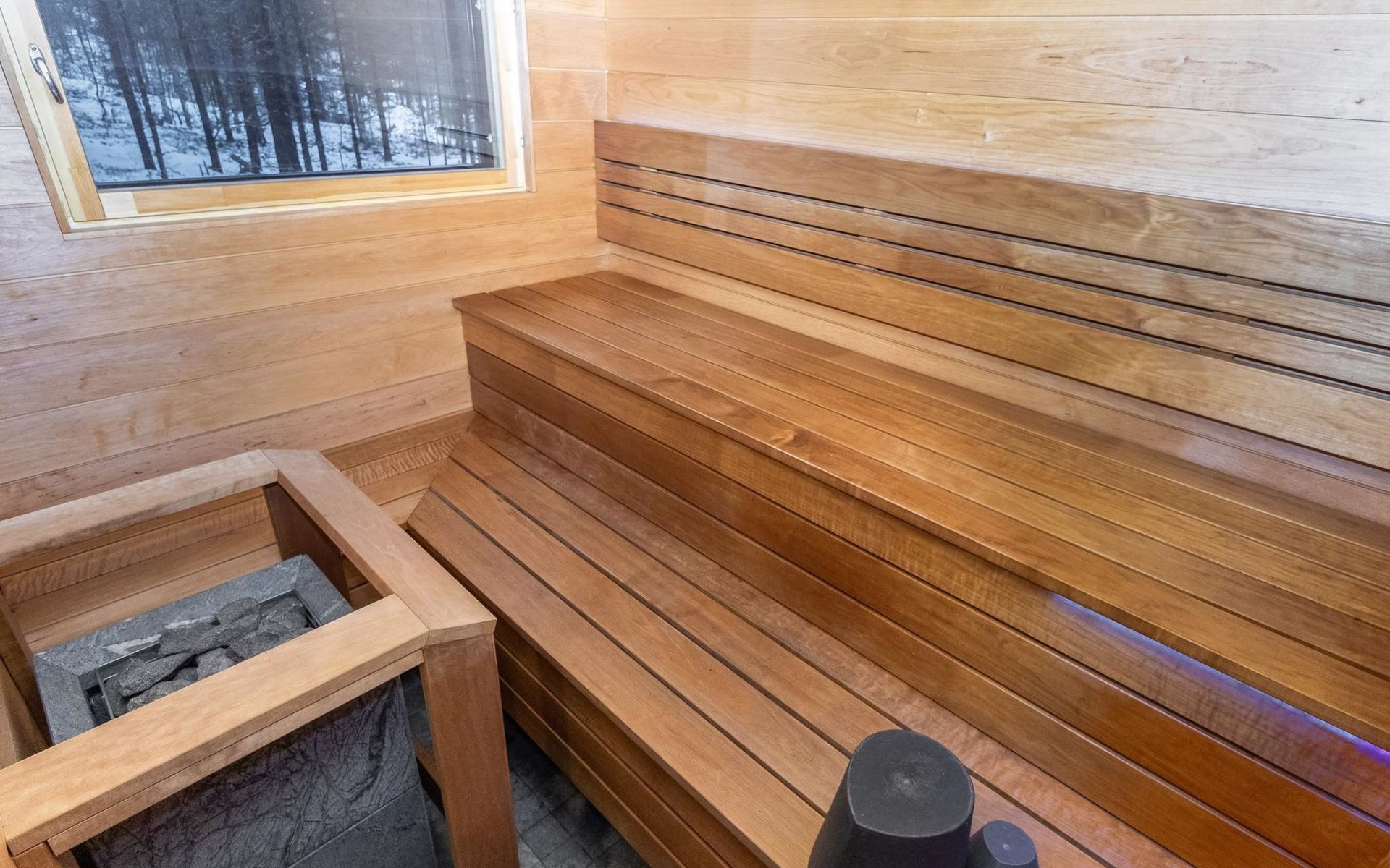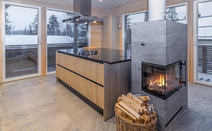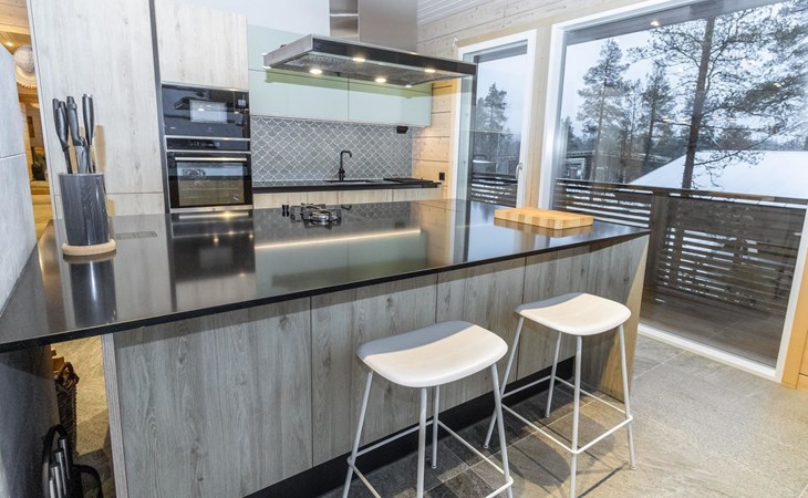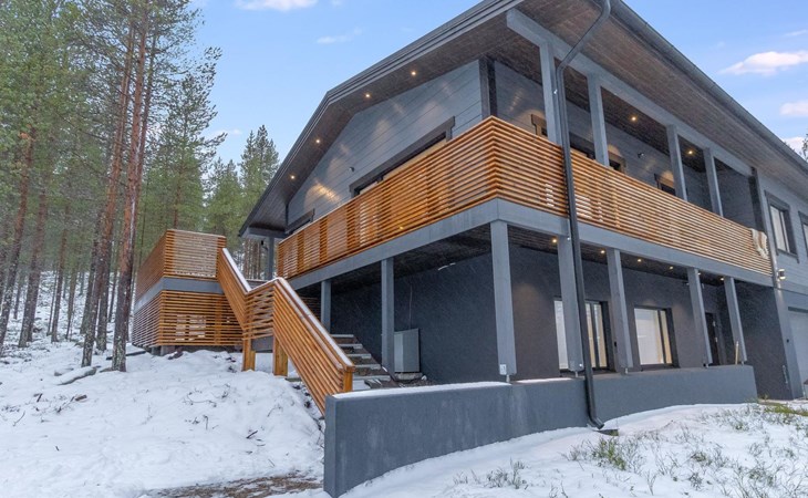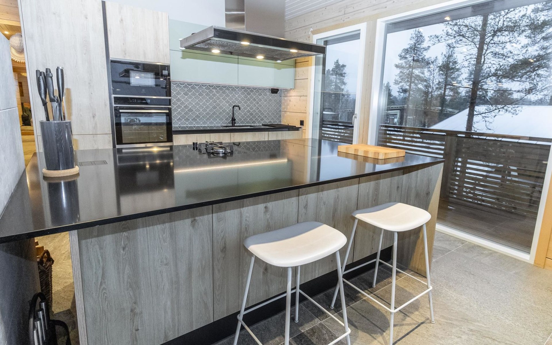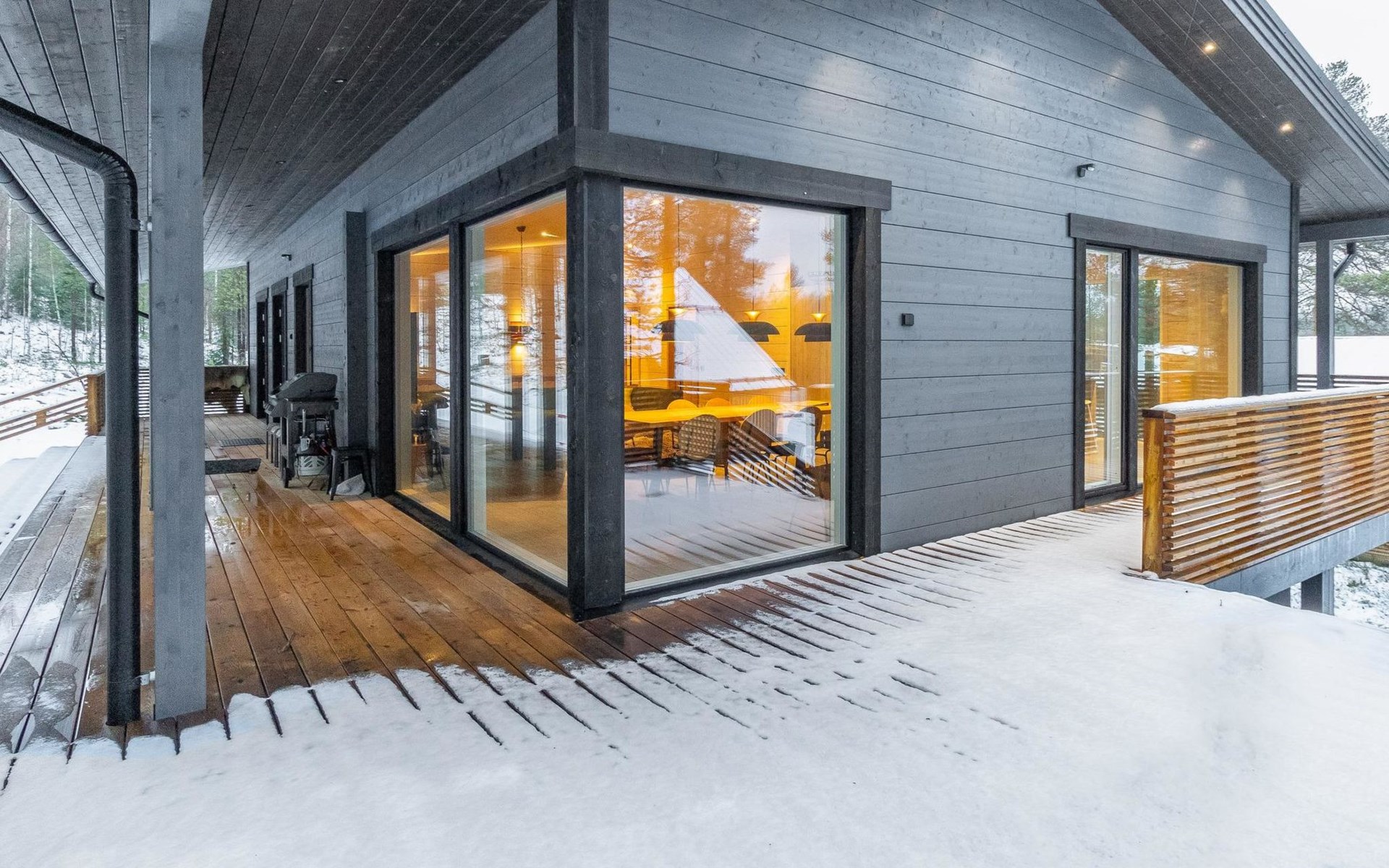 A covered terrace that wraps around three sides of the upper floor invites you to enjoy the enchanting views. You can start skiing directly from the villa, or just a 200-meter walk brings you to the ski lifts and slopes of Pyhä Ski Resort.
