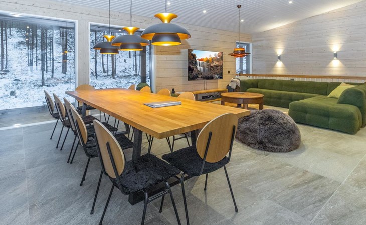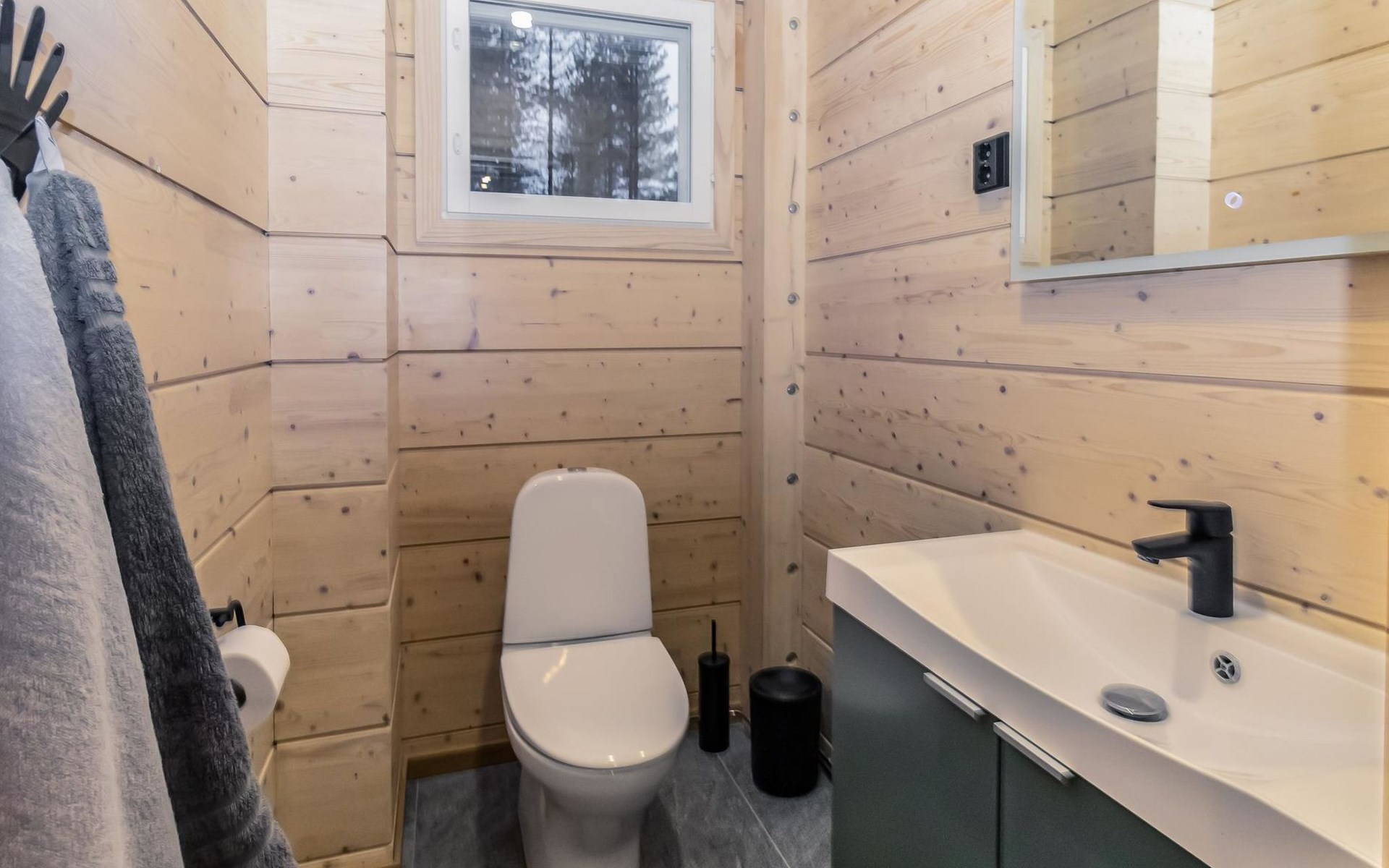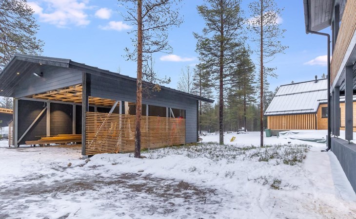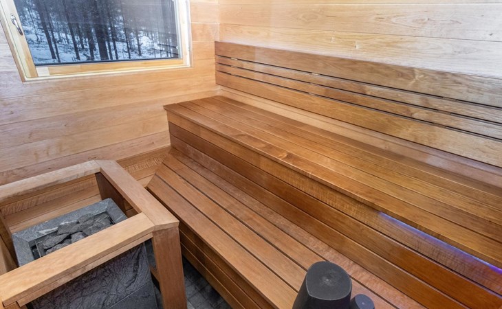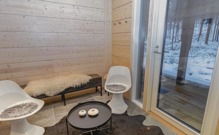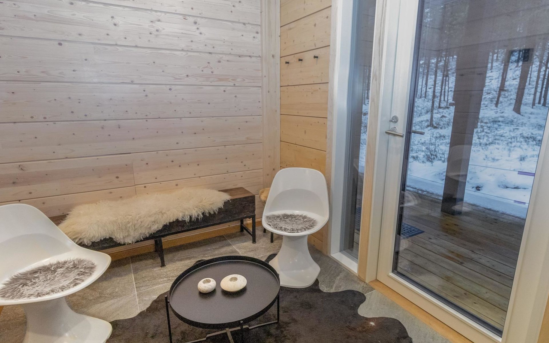 A covered terrace that wraps around three sides of the upper floor invites you to enjoy the enchanting views. You can start skiing directly from the villa, or just a 200-meter walk brings you to the ski lifts and slopes of Pyhä Ski Resort.