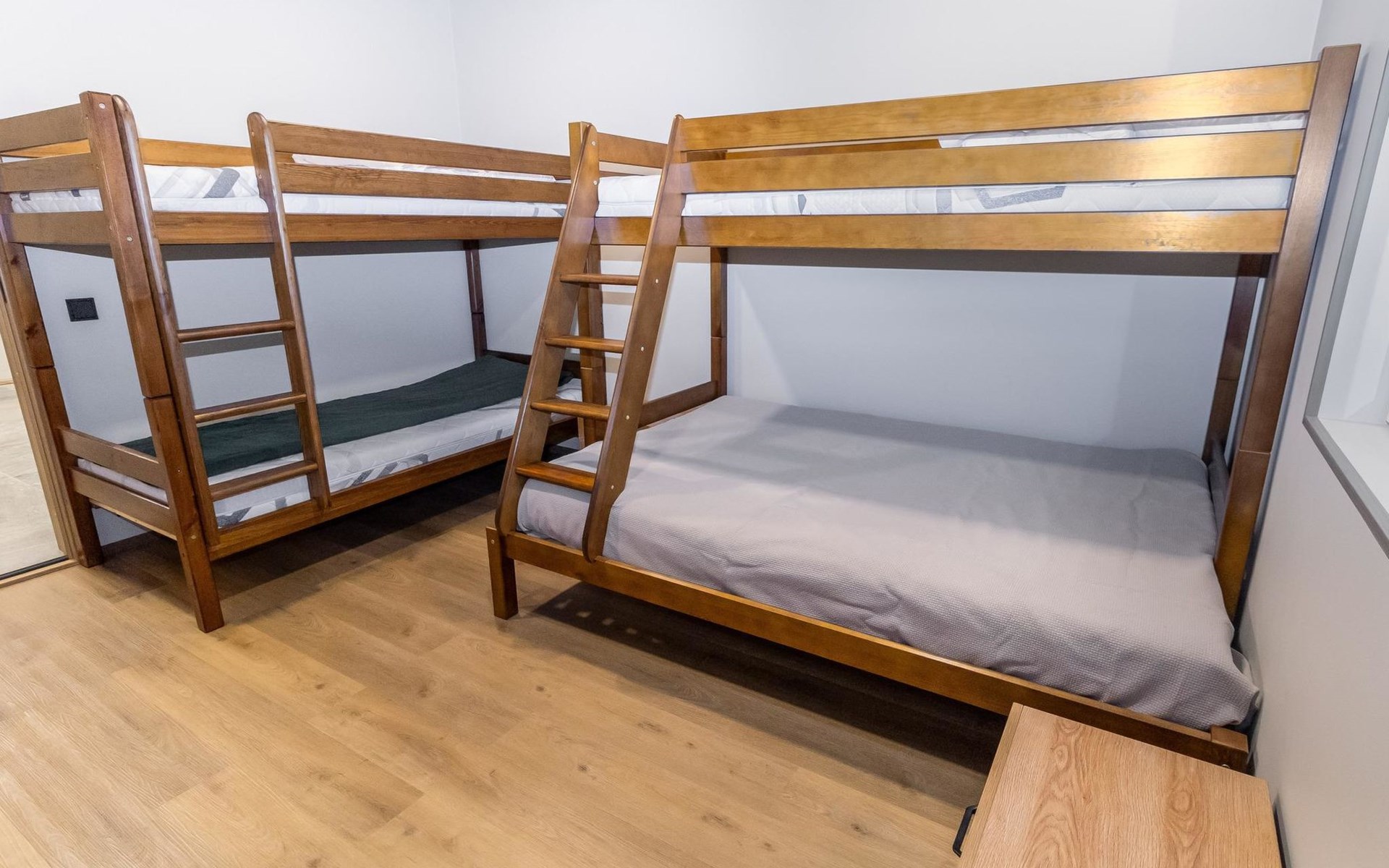 The villa has the following bedrooms: upstairs, there are three bedrooms, each with a double bed, and downstairs, there are two rooms – one with two bunk beds and the other with a double bed and a bunk bed. There’s enough privacy and space for everyone!