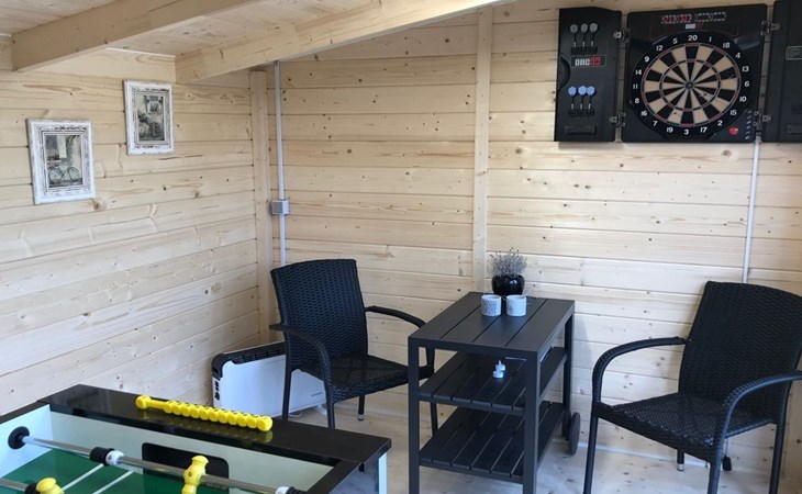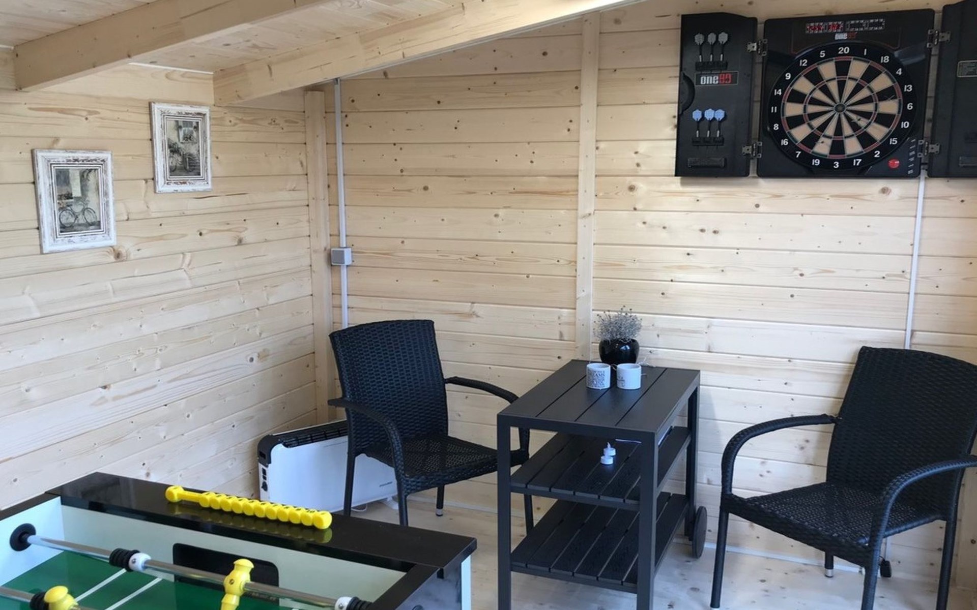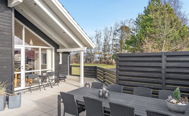 Eengezinswoning, bouwjaar 2018. 400 m van zee. Voor alleengebruik: terrein 1.008 m2, verzorgde tuin. Terras (78 m2), barbecue. In het huis: sauna, tafelvoetbal, trampoline, wasmachine, droger. Parkeerplaats bij het huis. Levensmiddelenwinkel 3 km. Golfterrein 6 km. De eigenaar accepteert geen jeugdgroepen.