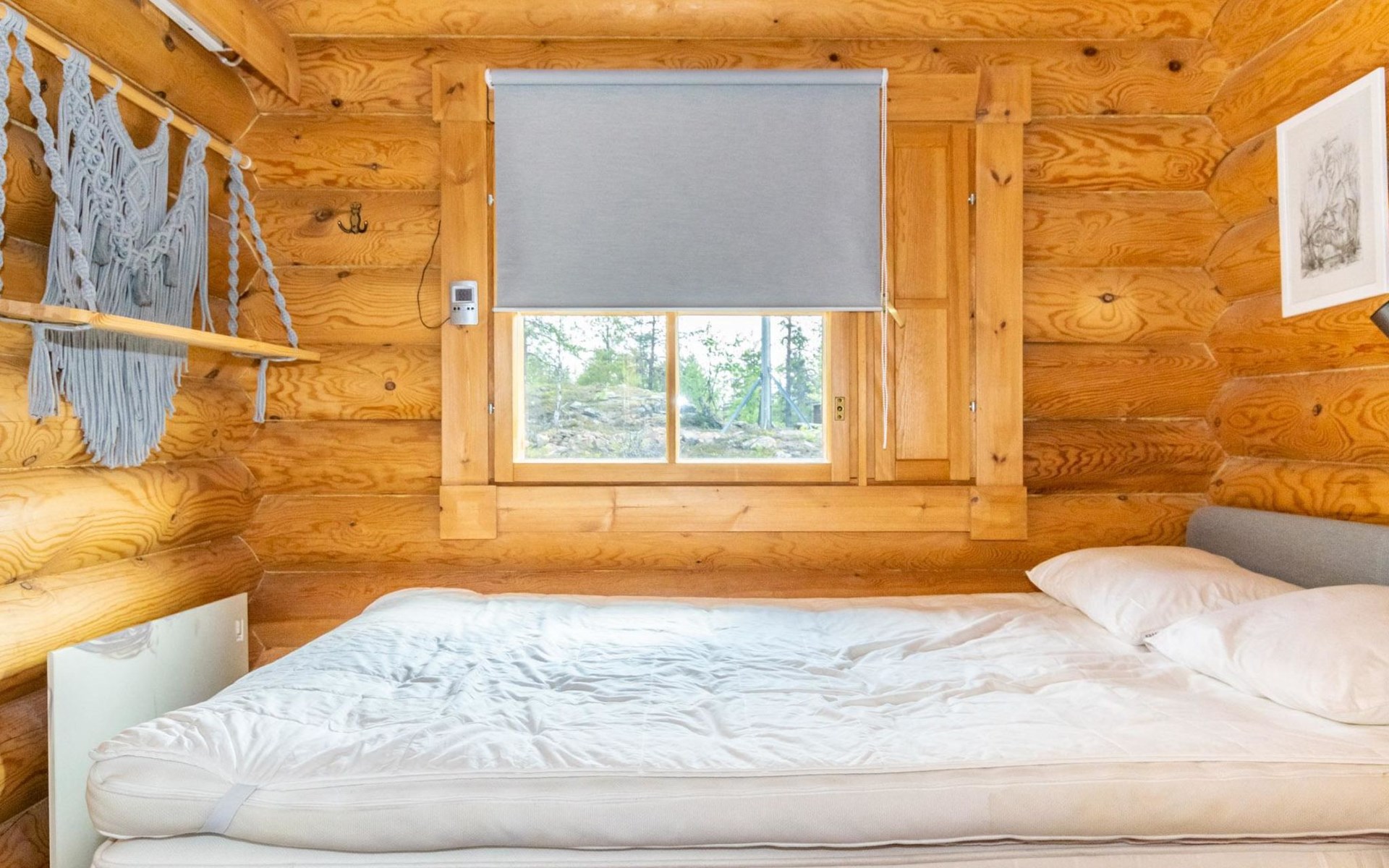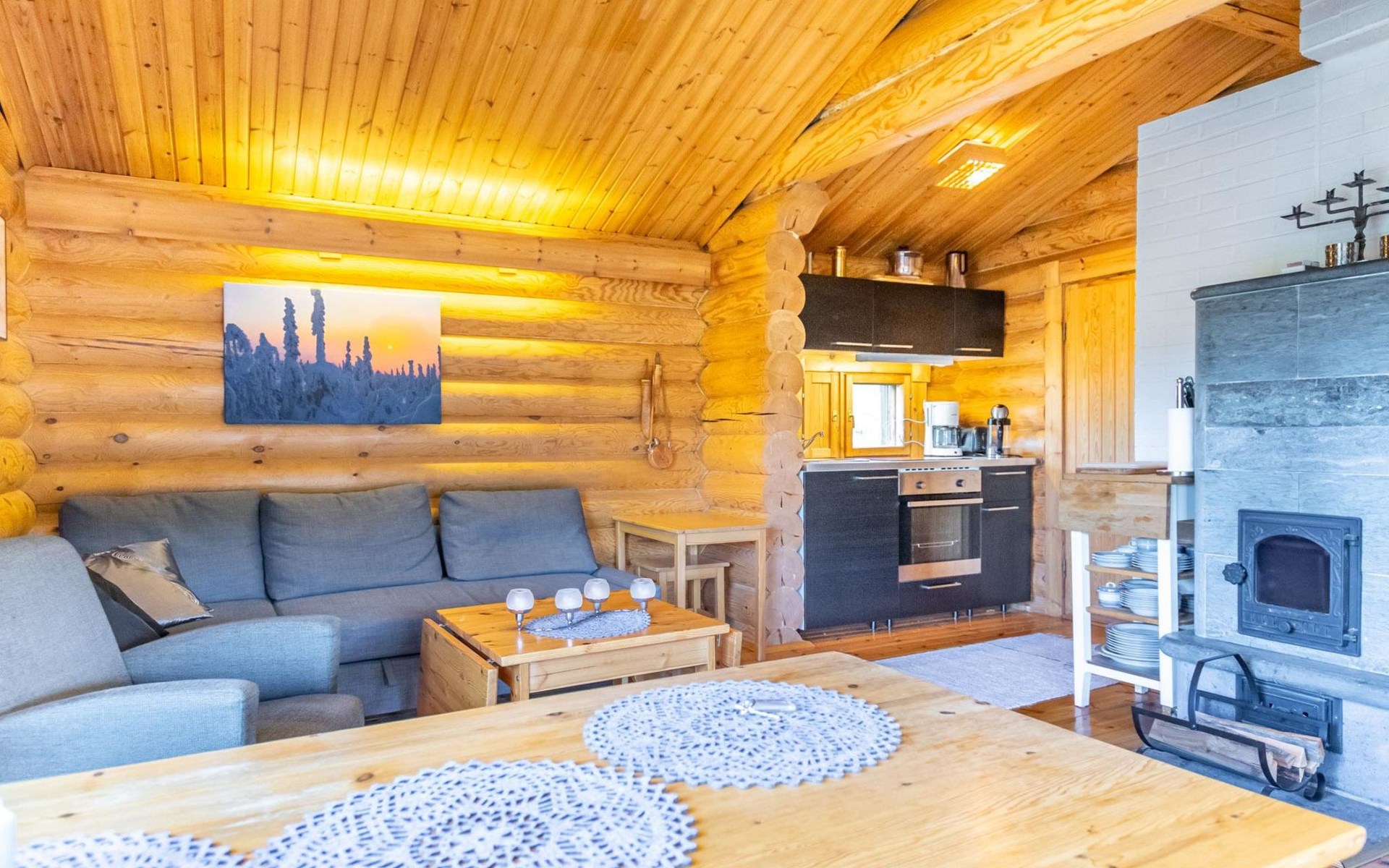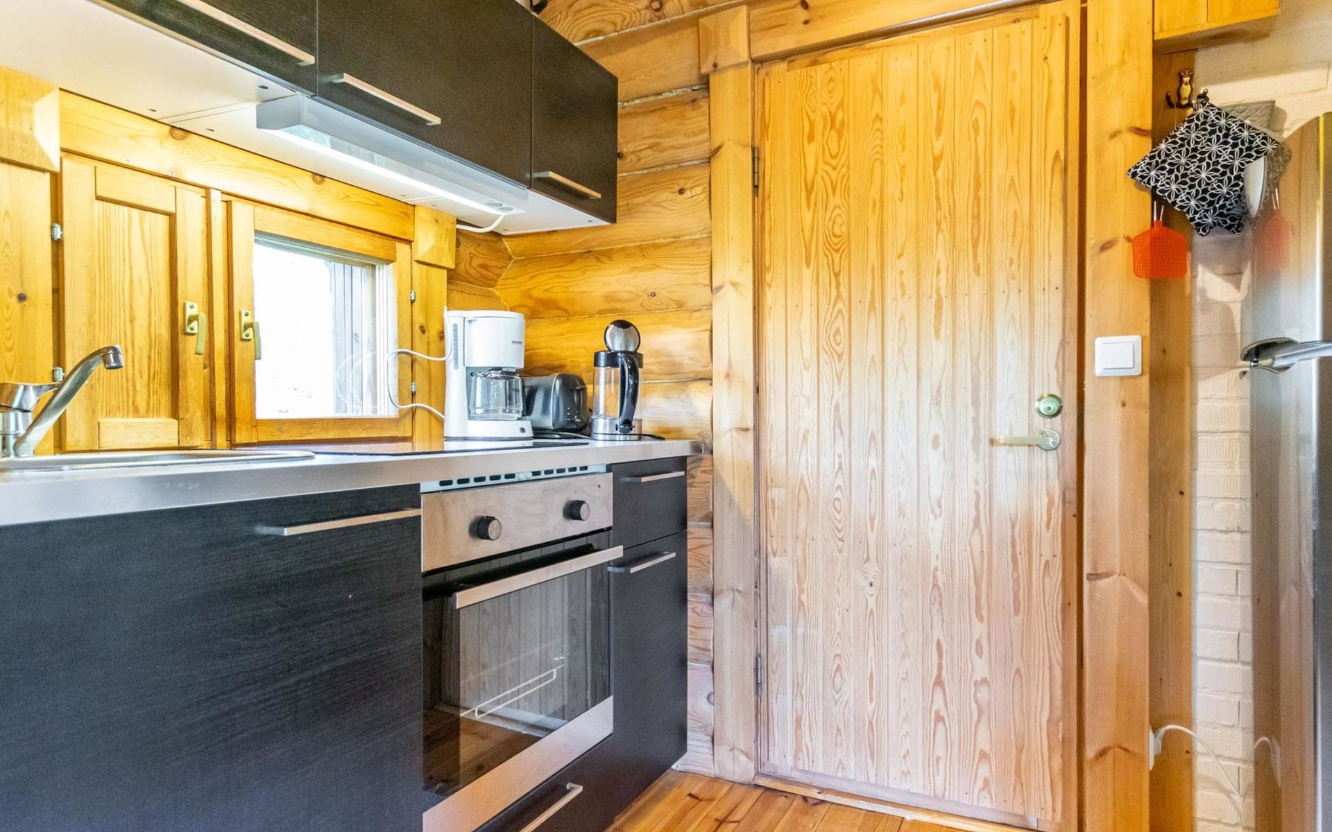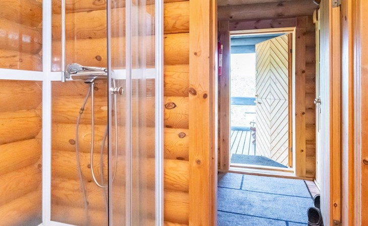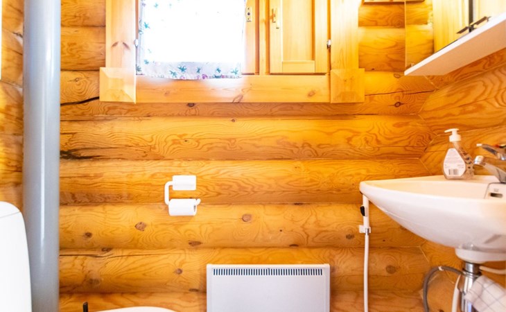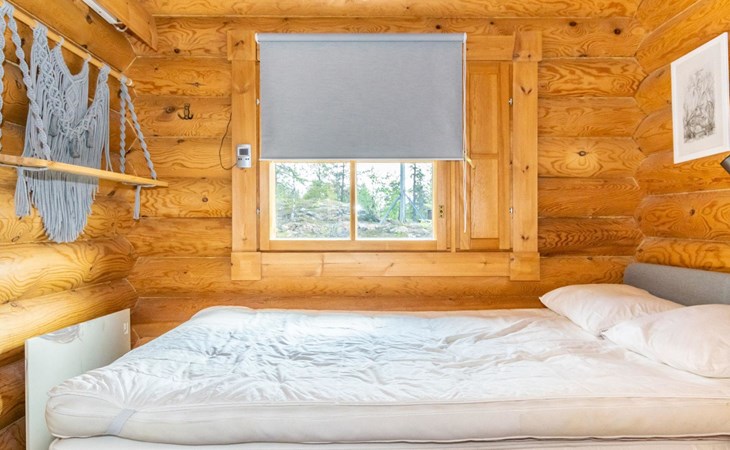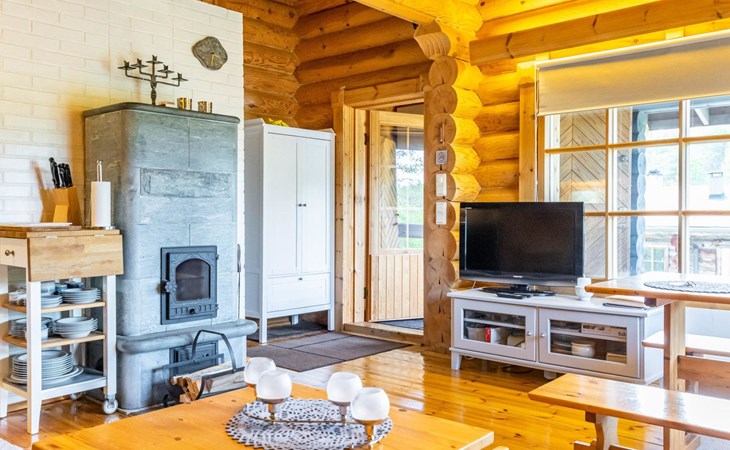 The 50-square-meter cabin has a kitchen/living room, a bedroom, a washroom, a wood-heated sauna, a toilet and a terrace. A shared beach, fireplace (only on summer) and wood storage with another cottage in the courtyard, Kelokoto. The car's heating plug is in the wall of the adjacent cabin, a long extension cord is used.