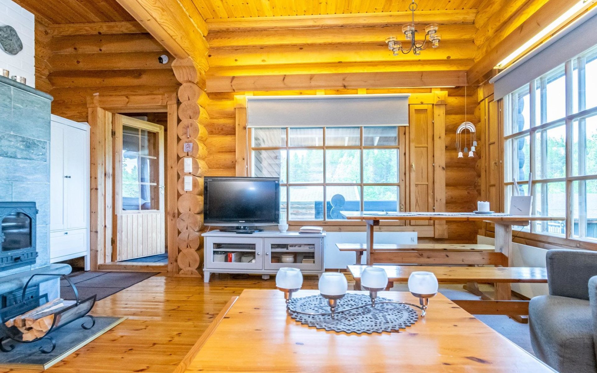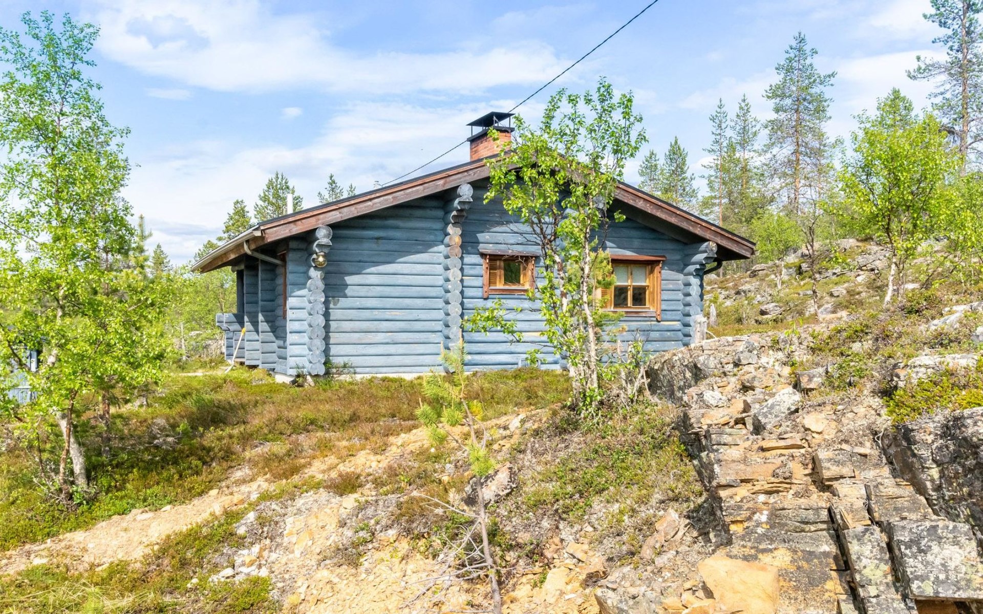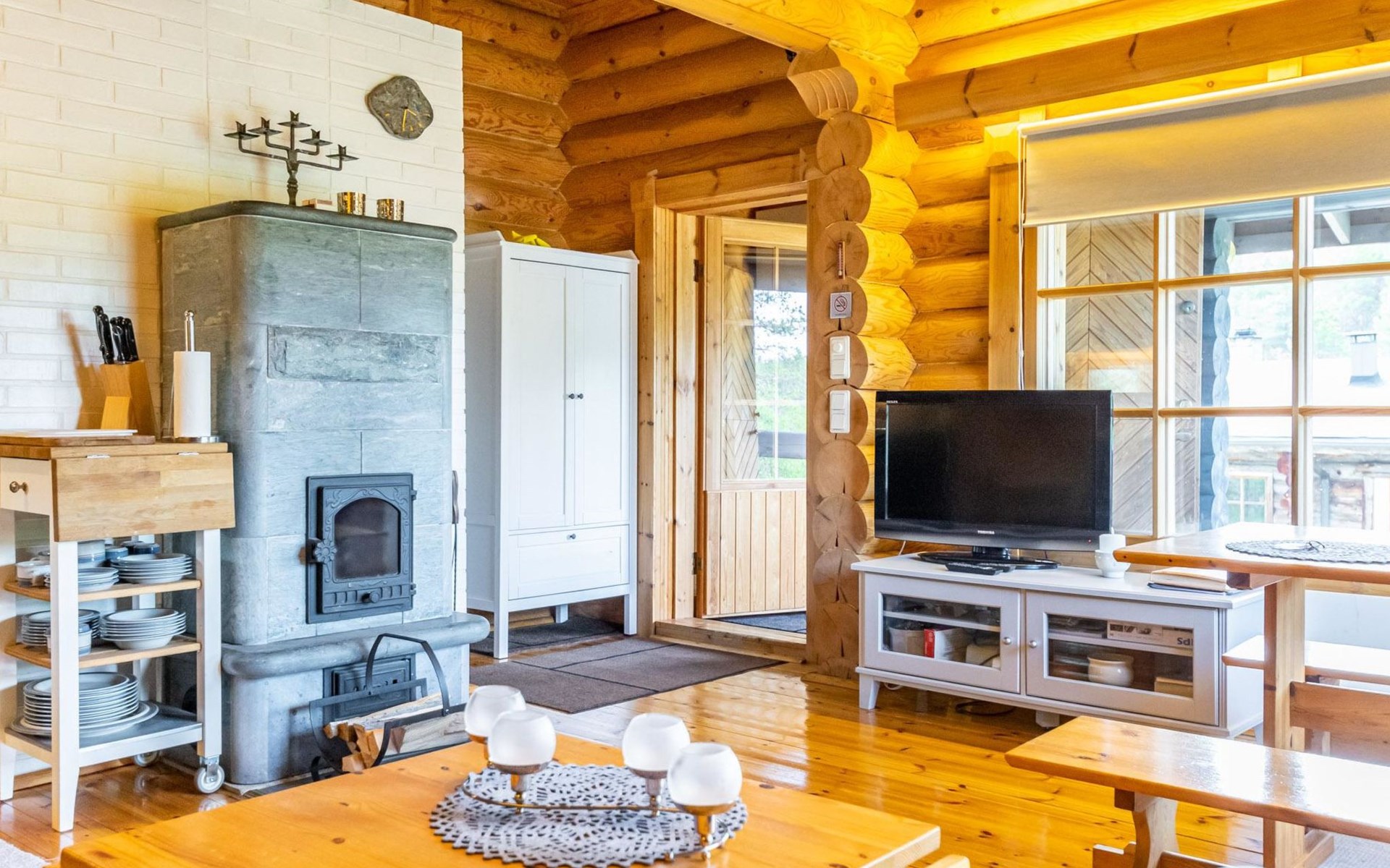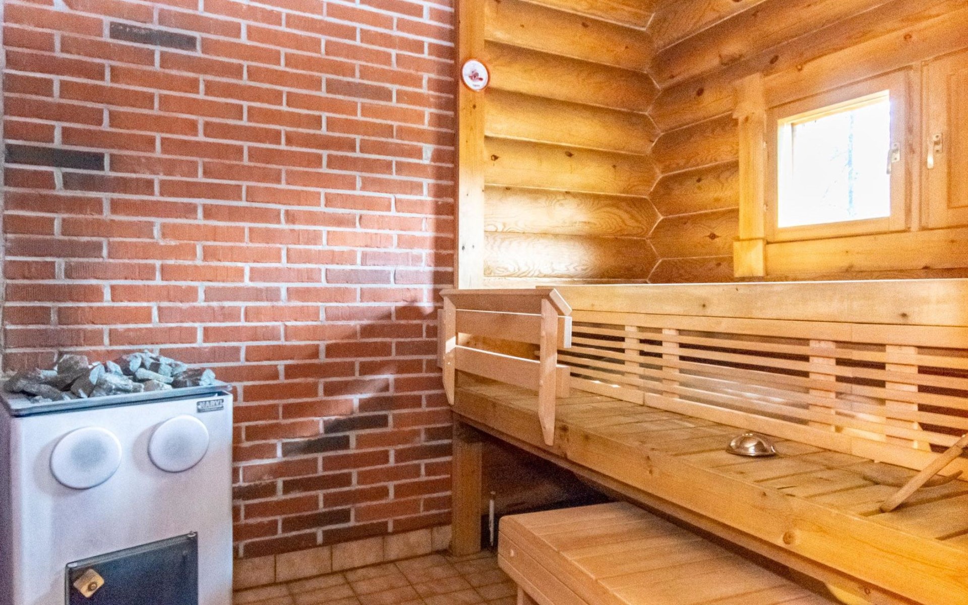 The 50-square-meter cabin has a kitchen/living room, a bedroom, a washroom, a wood-heated sauna, a toilet and a terrace. A shared beach, fireplace (only on summer) and wood storage with another cottage in the courtyard, Kelokoto. The car's heating plug is in the wall of the adjacent cabin, a long extension cord is used.