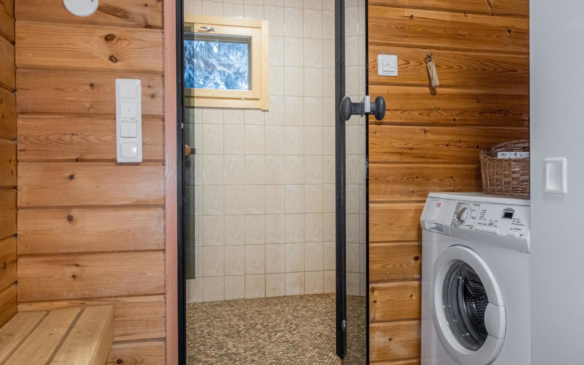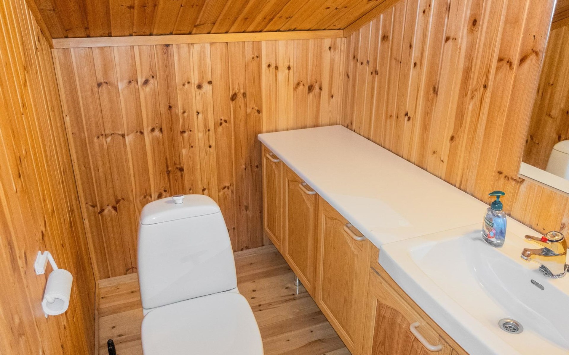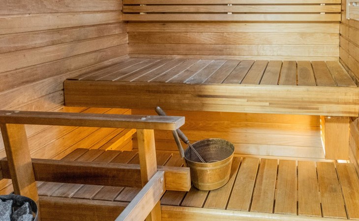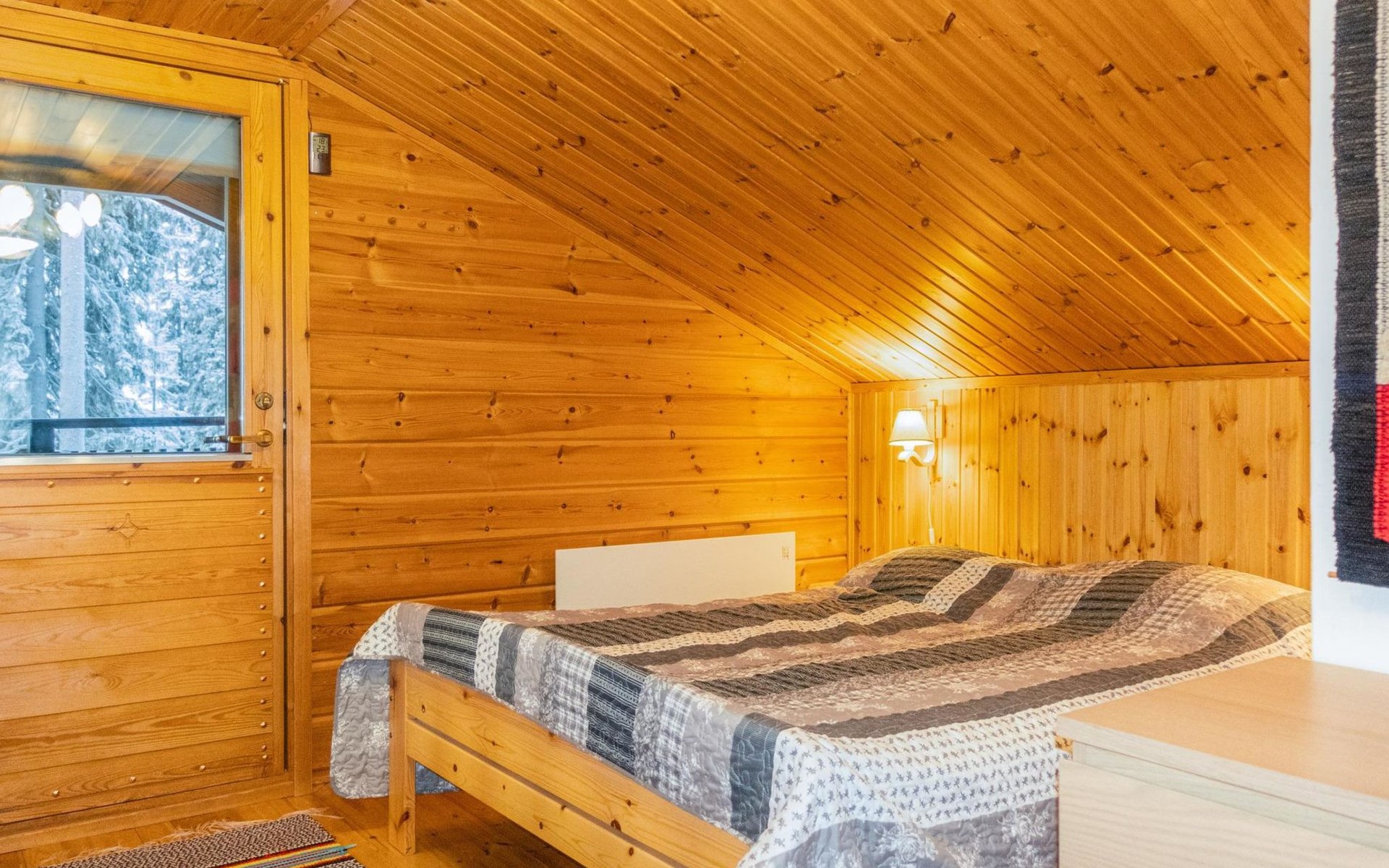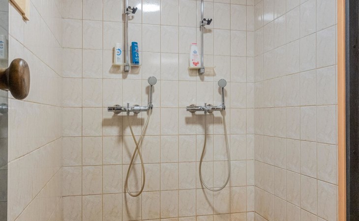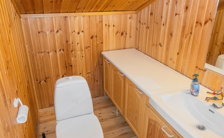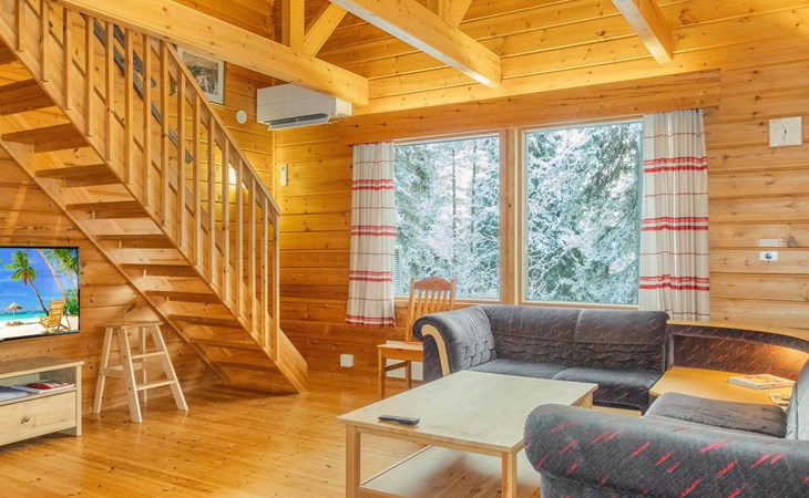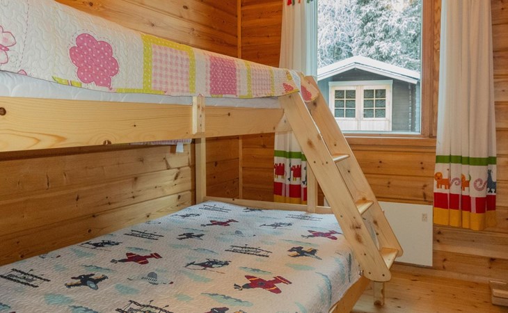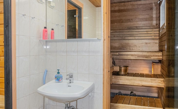 The ground floor comprises a living room and kitchen, creating a cozy environment for togetherness. There are also two bedrooms on the ground floor: one with a double bed and the other with a bunk bed, where the lower bed is 120 cm wide. Additionally, the ground floor features a sauna, a bathroom, a utility room/dressing area, and a covered terrace for outdoor enjoyment. There's a walk-in closet attached to one bedroom, and another accessible from the hallway. The cabin has two separate WCs, one downstairs and another upstairs.