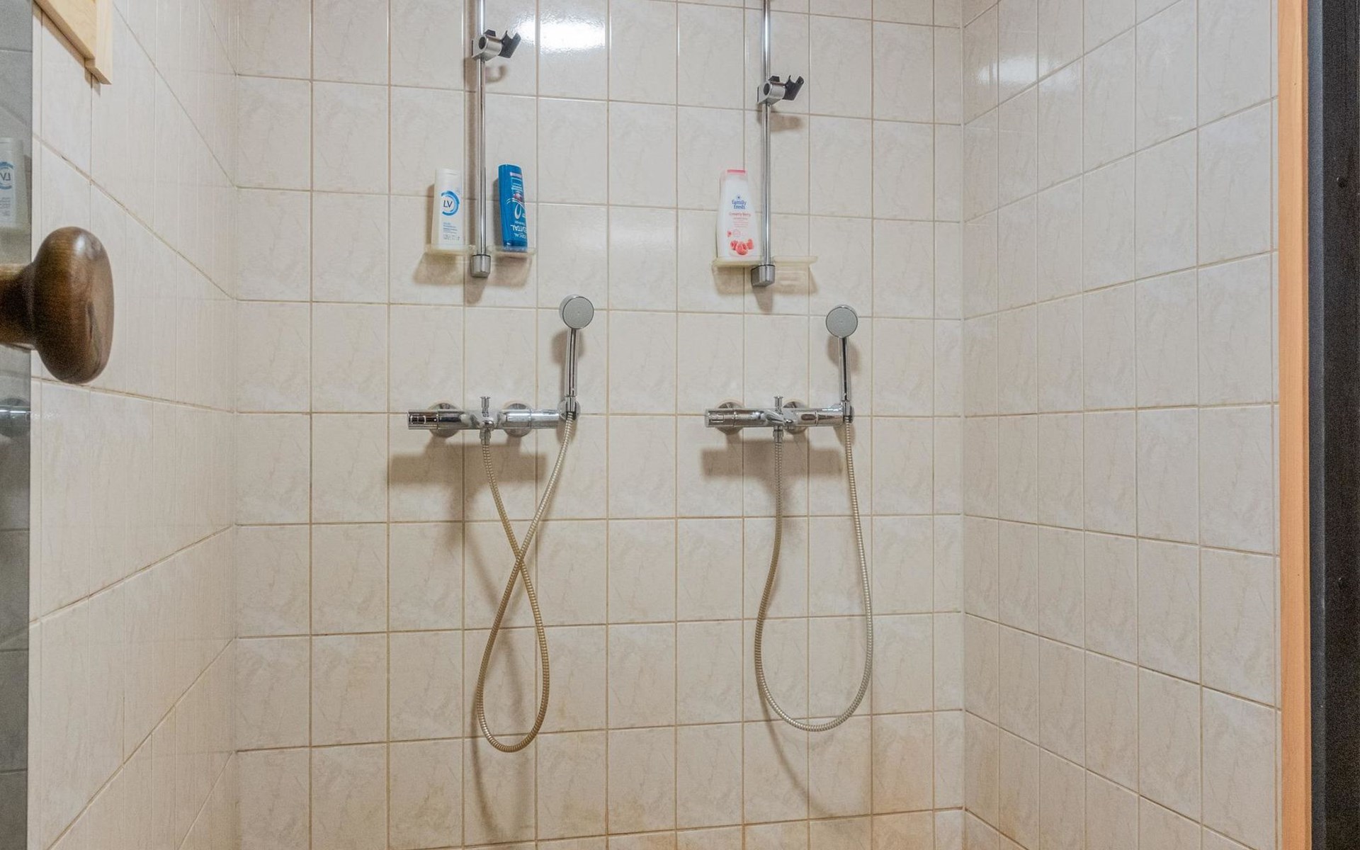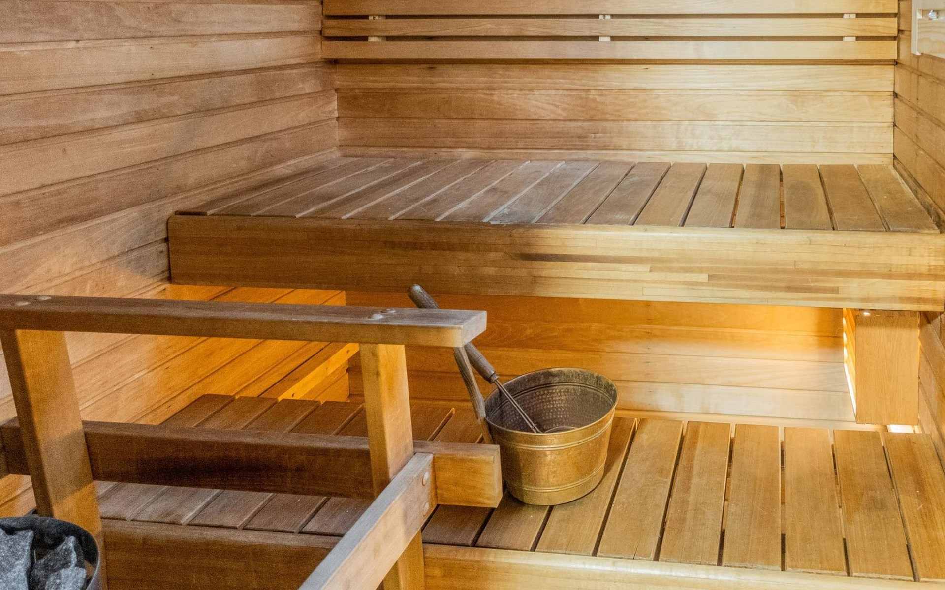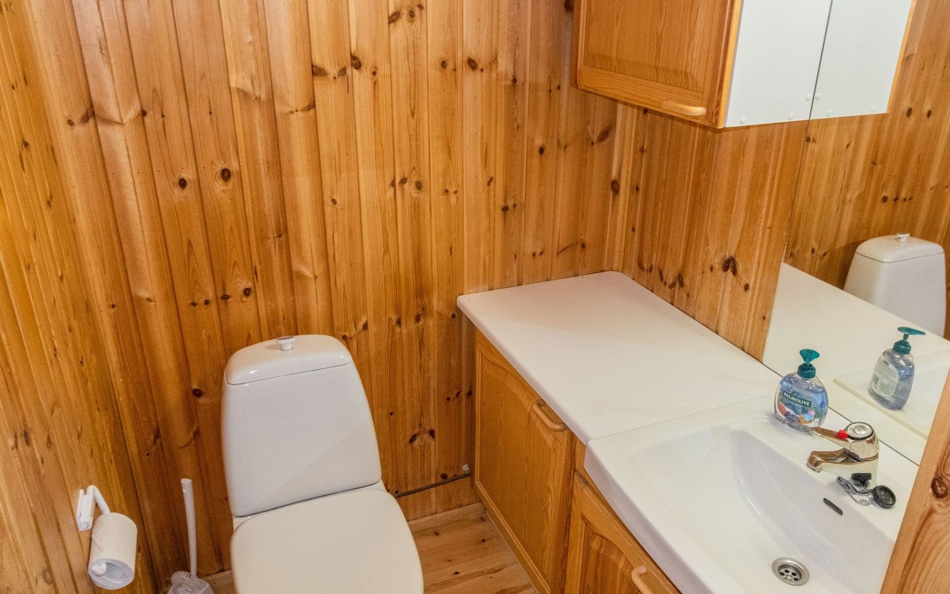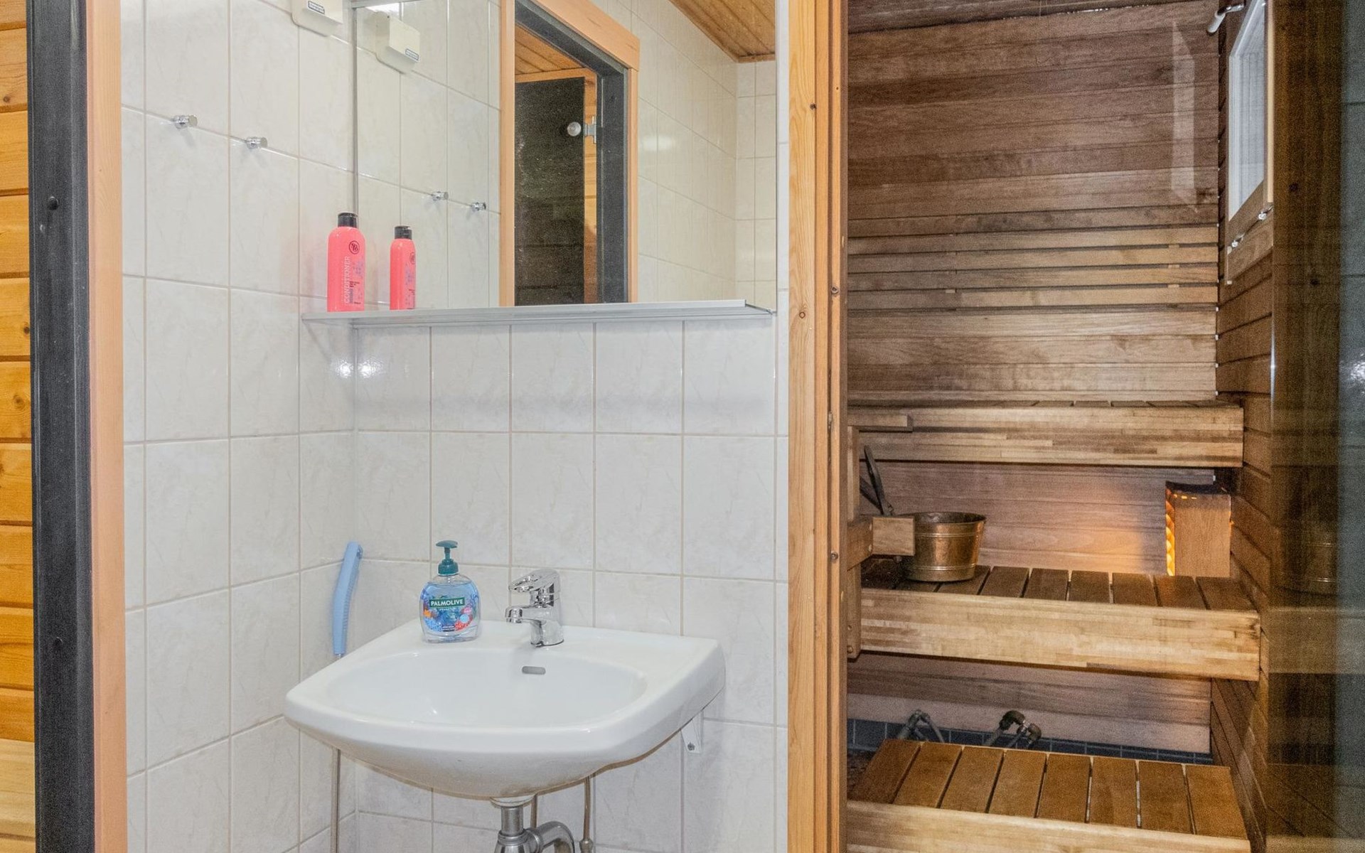 The ground floor comprises a living room and kitchen, creating a cozy environment for togetherness. There are also two bedrooms on the ground floor: one with a double bed and the other with a bunk bed, where the lower bed is 120 cm wide. Additionally, the ground floor features a sauna, a bathroom, a utility room/dressing area, and a covered terrace for outdoor enjoyment. There's a walk-in closet attached to one bedroom, and another accessible from the hallway. The cabin has two separate WCs, one downstairs and another upstairs.