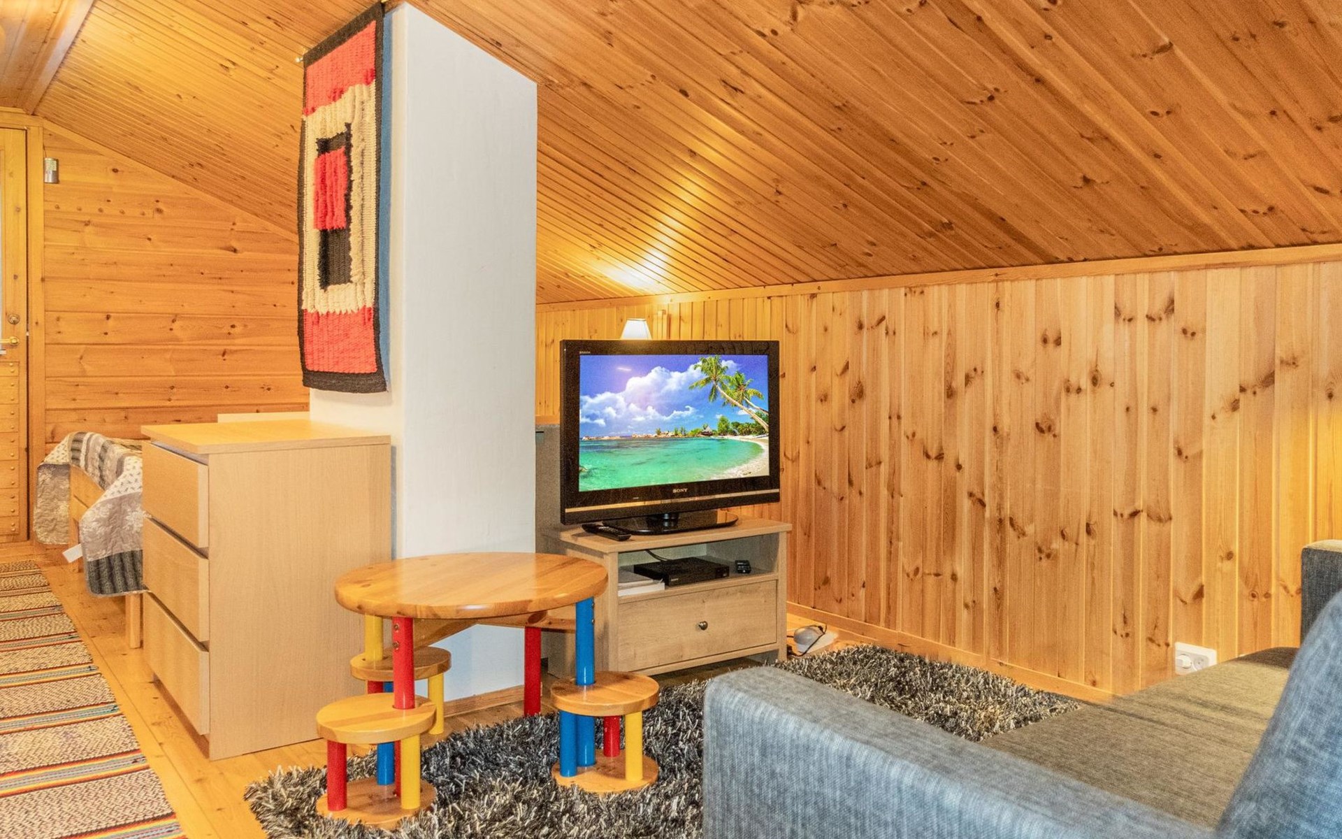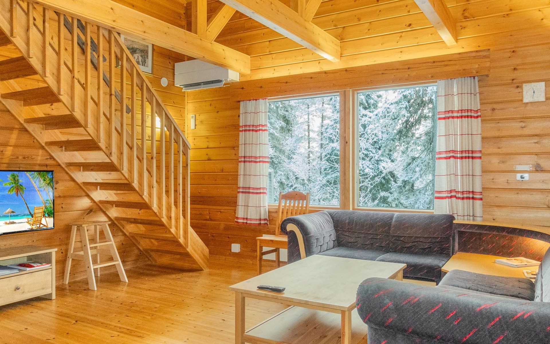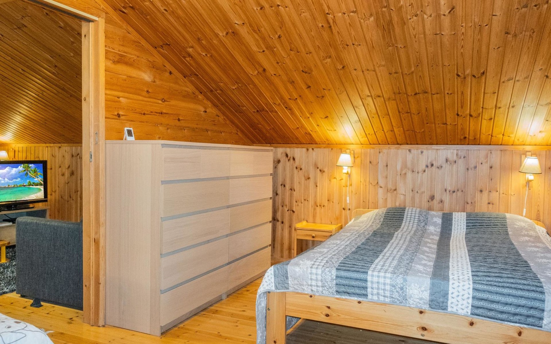 The upper floor offers more sleeping space: a bedroom with a double bed and two single beds. In addition, there's a loft area with a double bed, a TV space with a pull-out sofa bed, and a balcony offering scenic views of the surrounding nature.