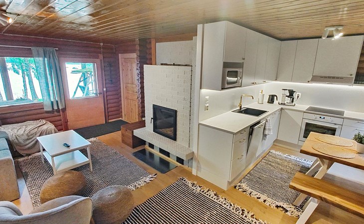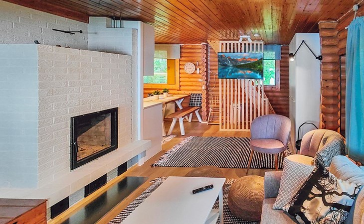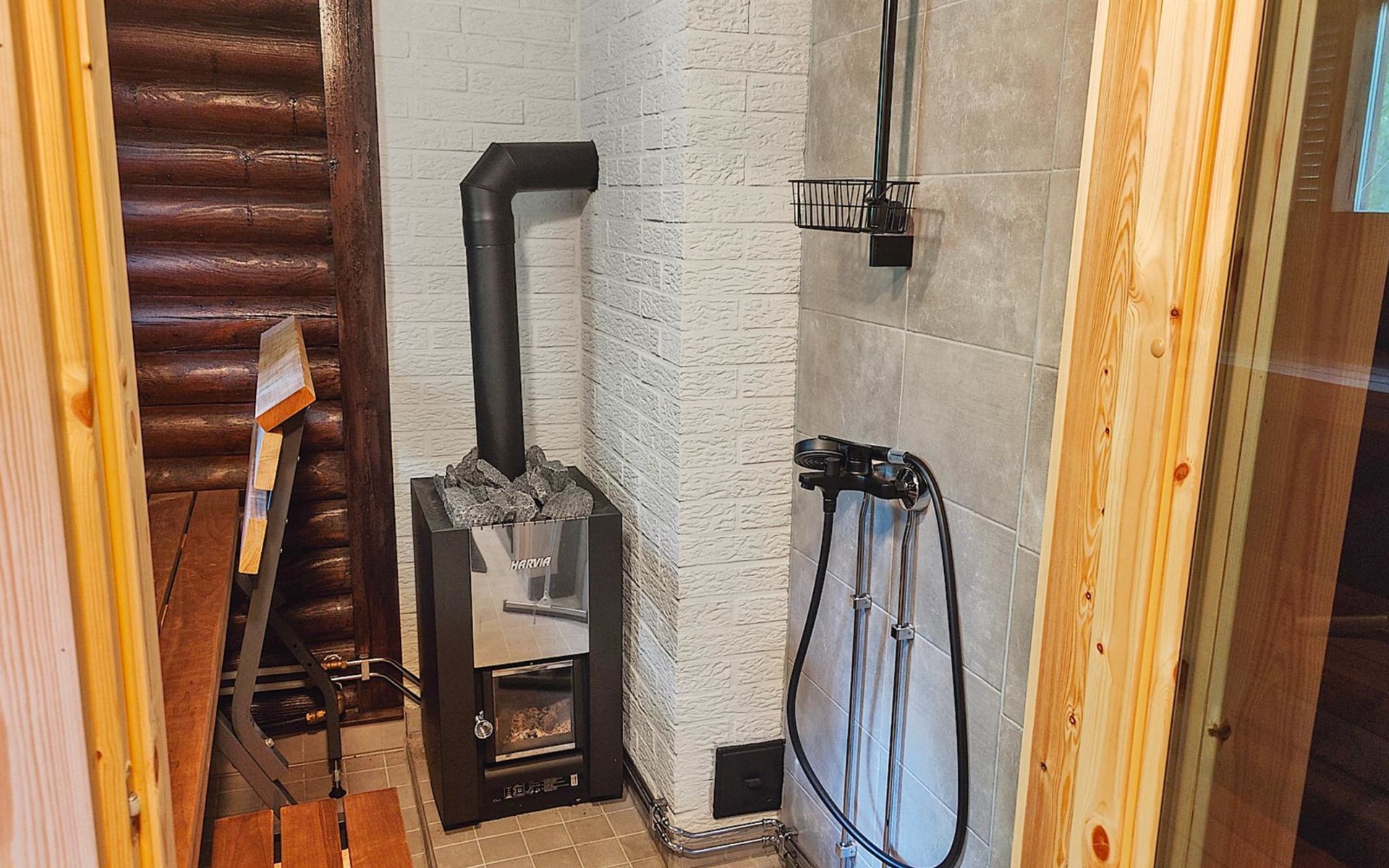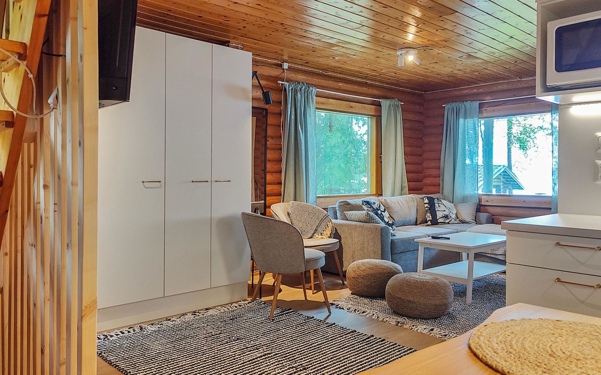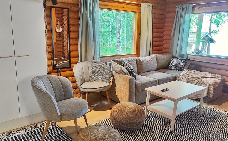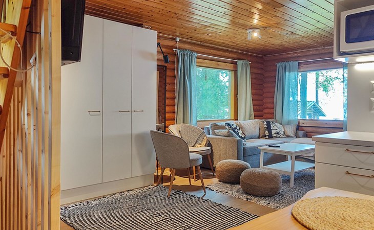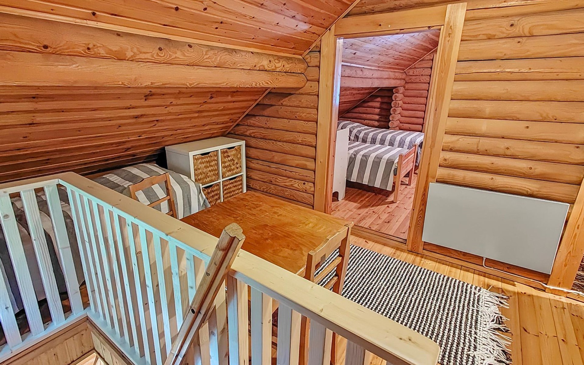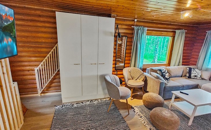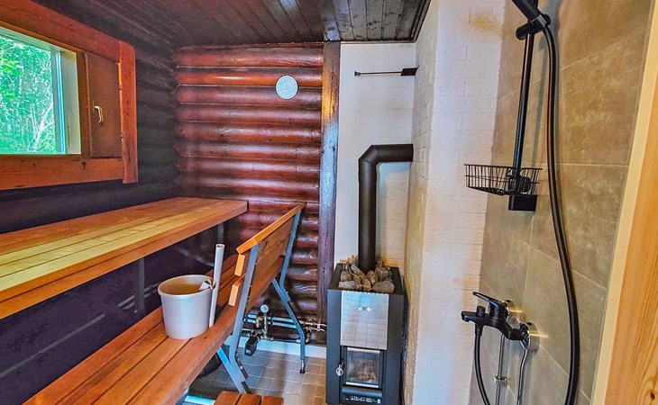Downstairs: living room/kitchen with sofa bed, dressing room, sauna, open veranda.
