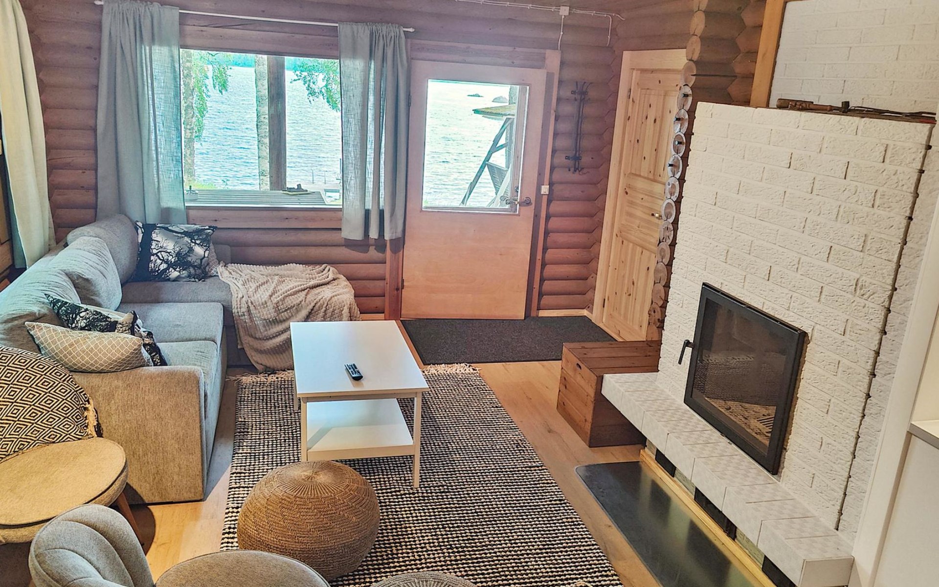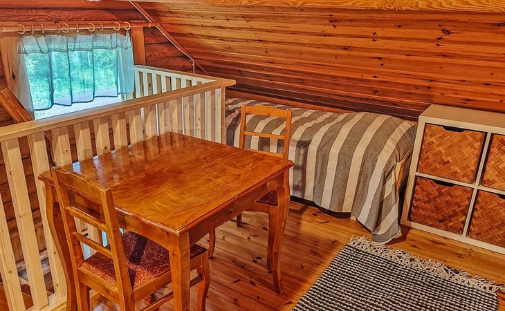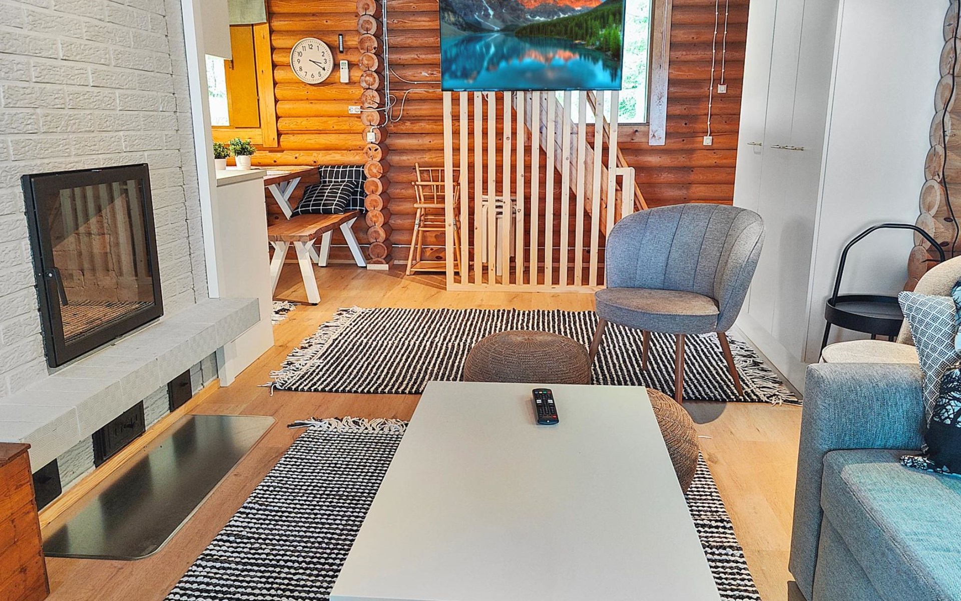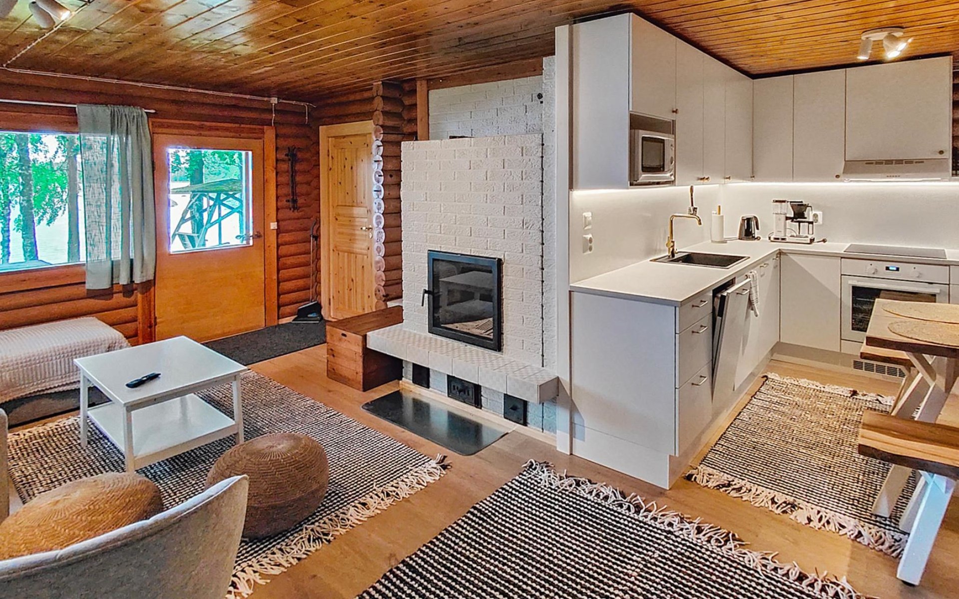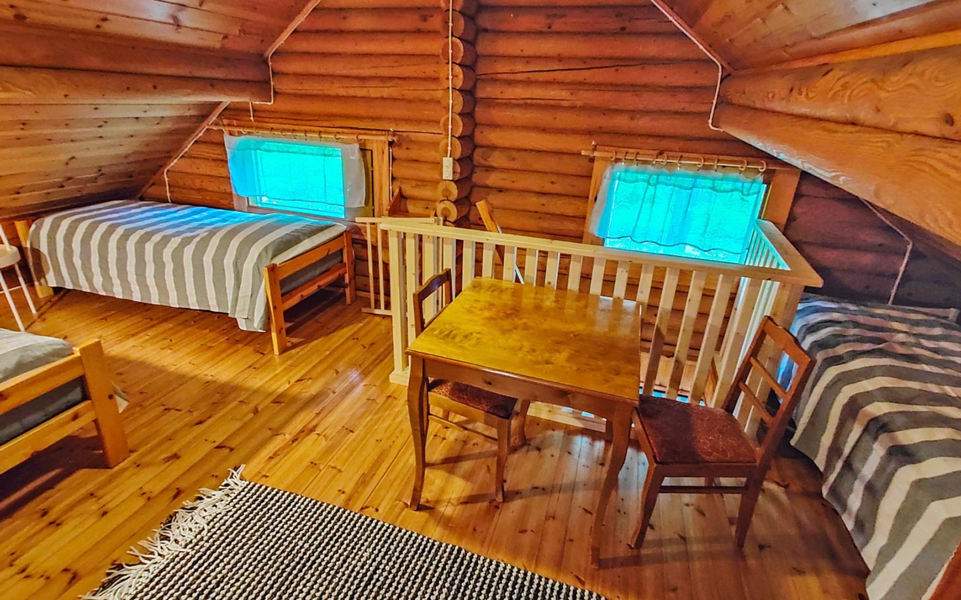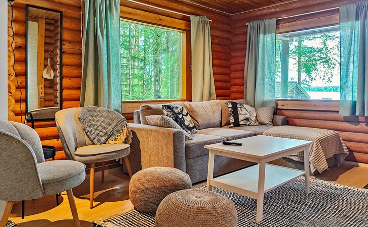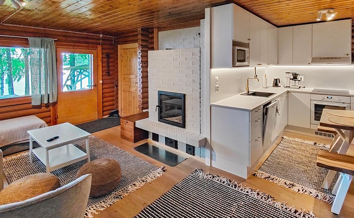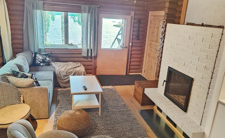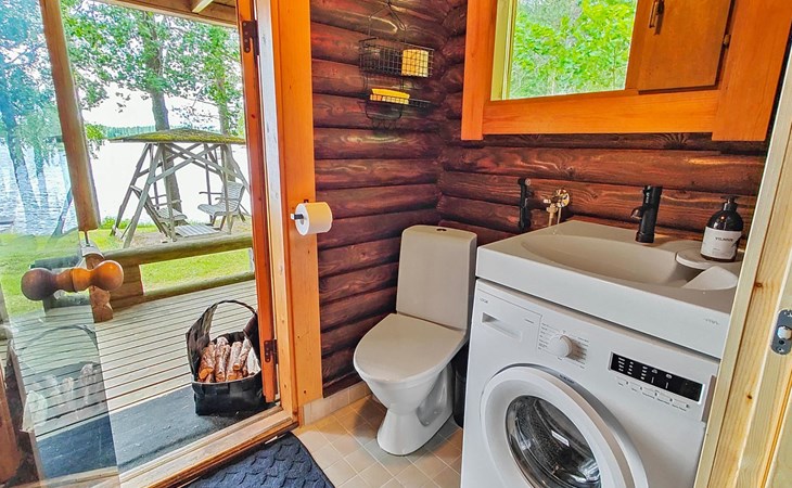 Downstairs: living room/kitchen with sofa bed, dressing room, sauna, open veranda.