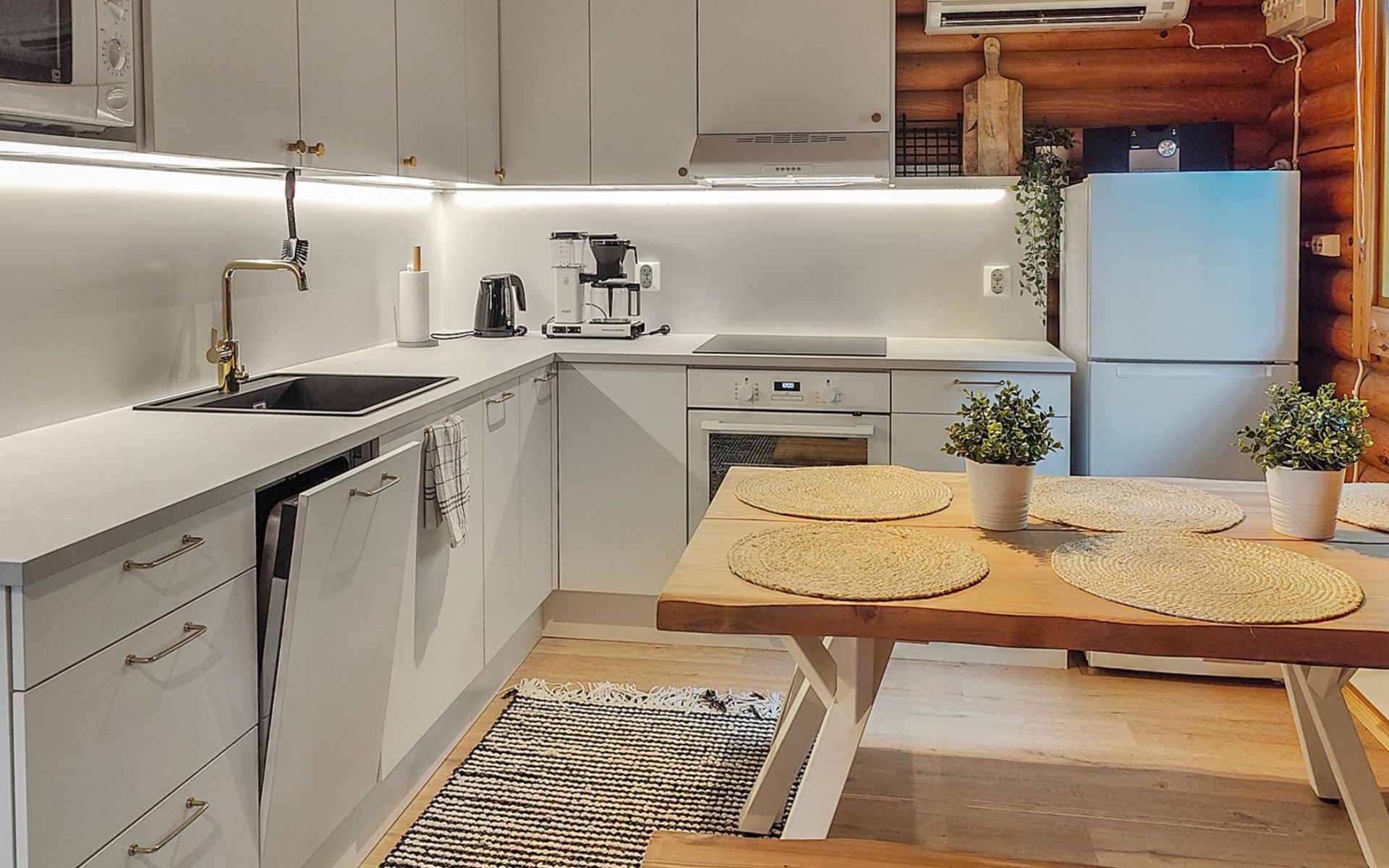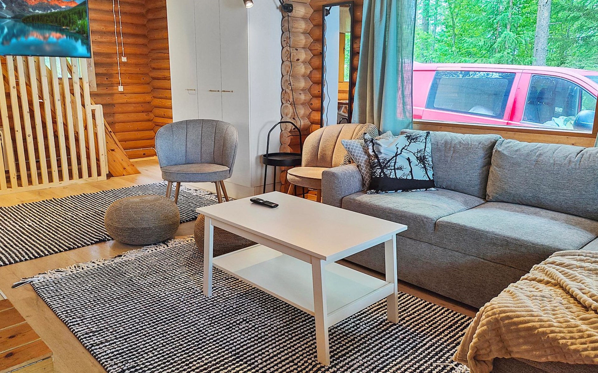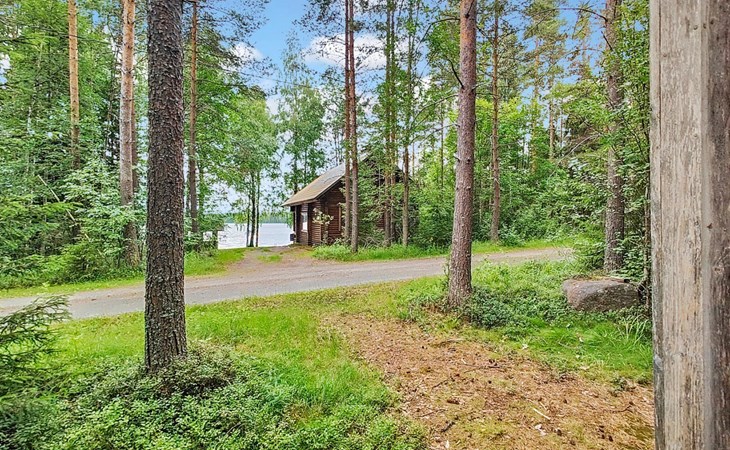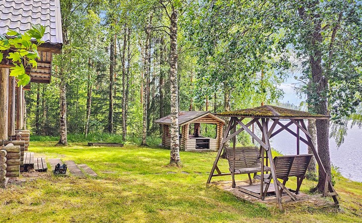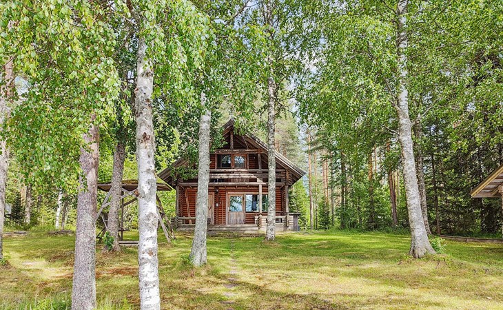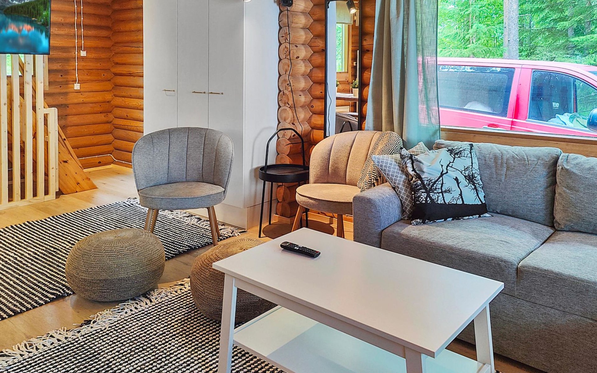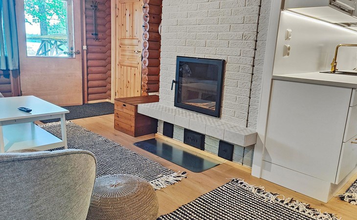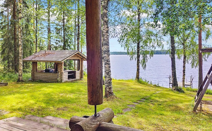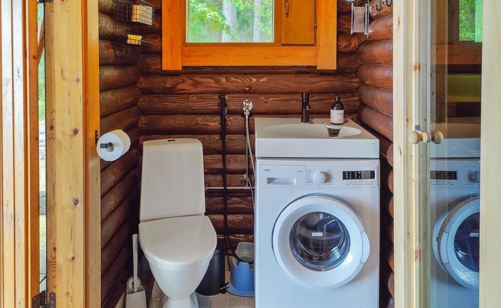 Downstairs: living room/kitchen with sofa bed, dressing room, sauna, open veranda.