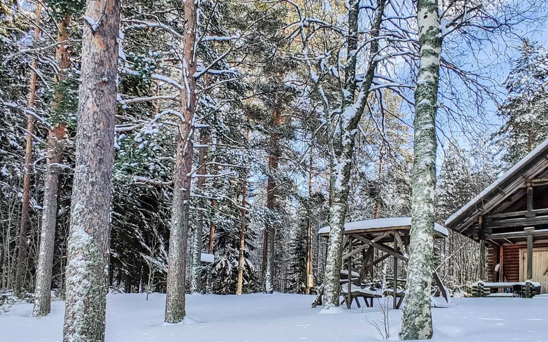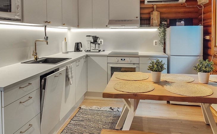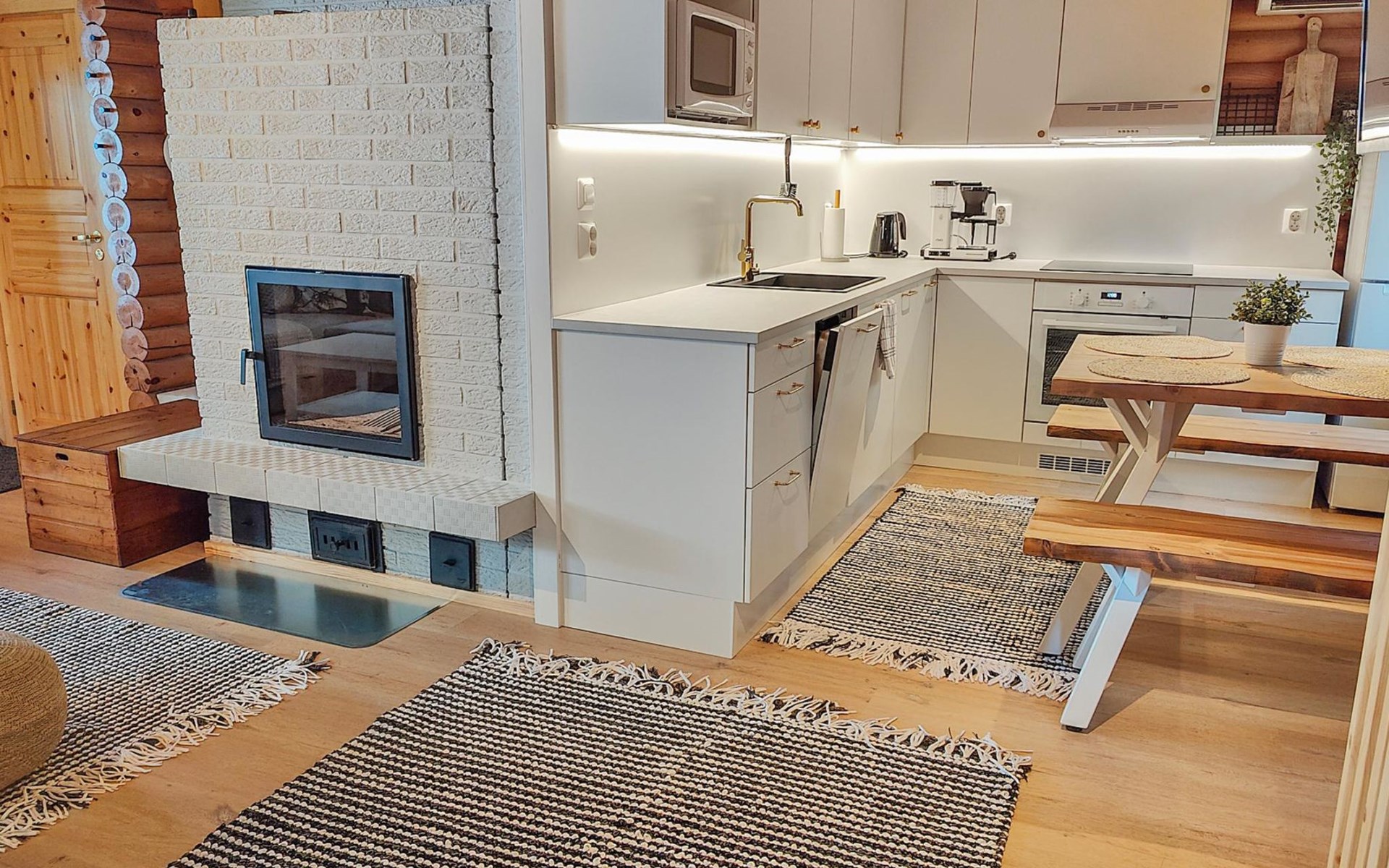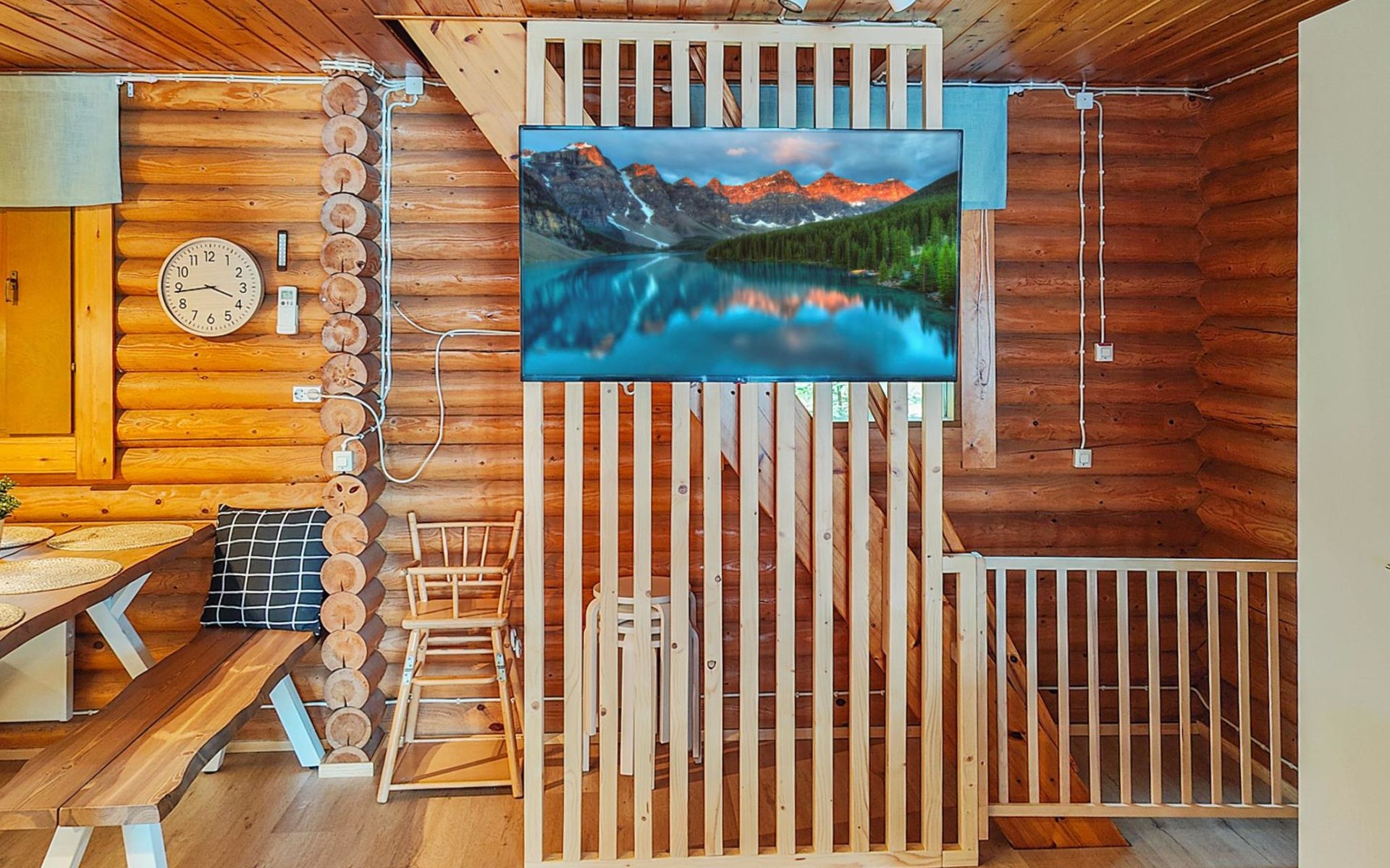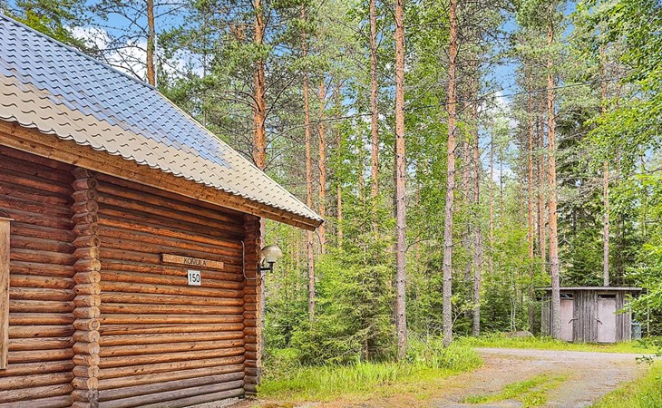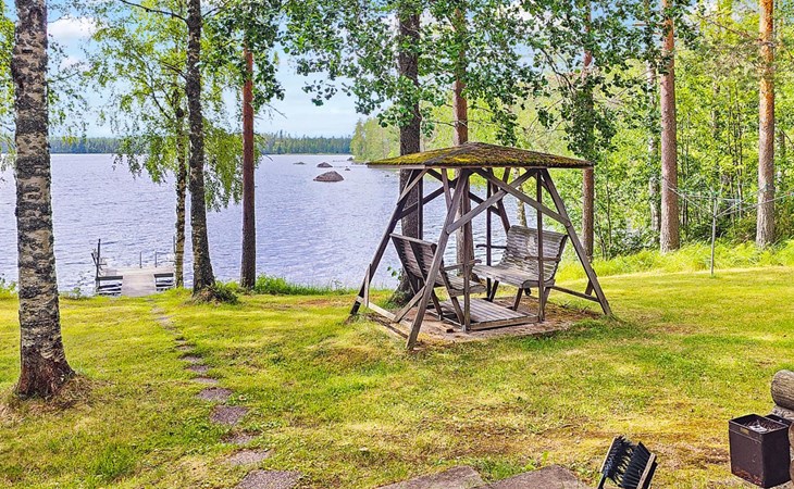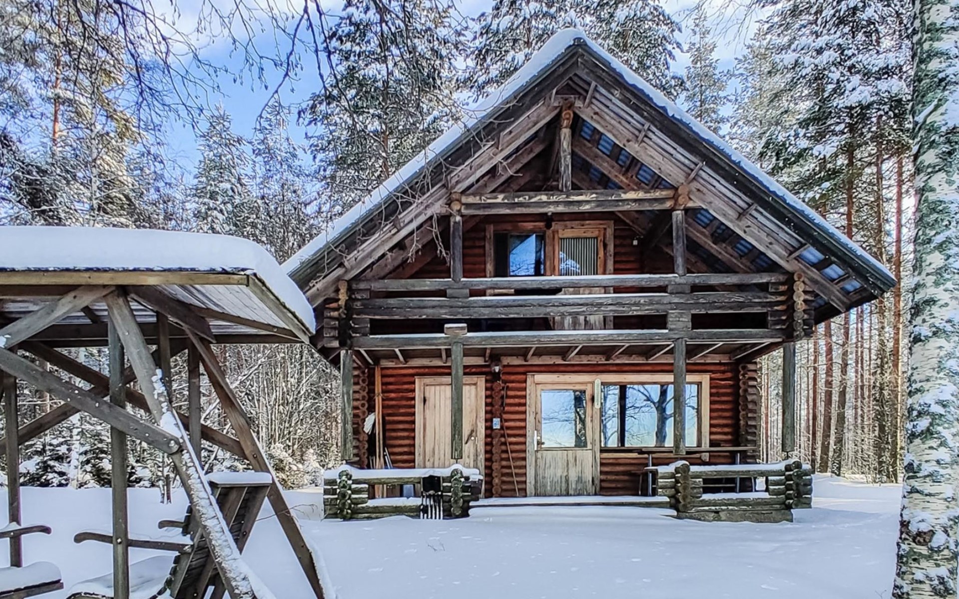 Downstairs: living room/kitchen with sofa bed, dressing room, sauna, open veranda.