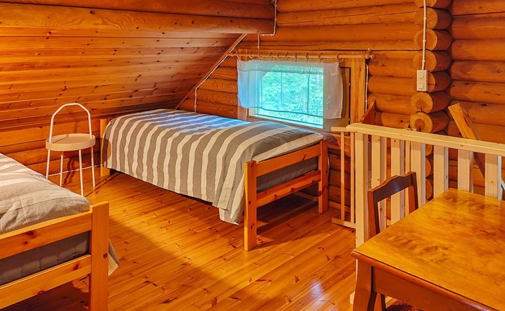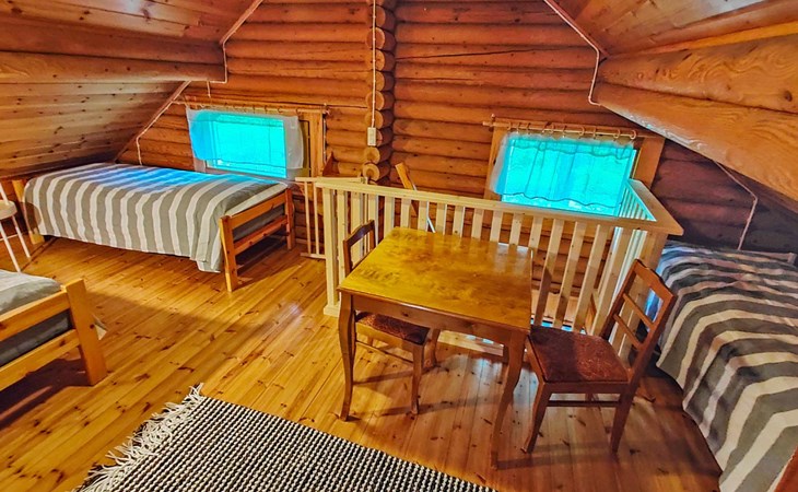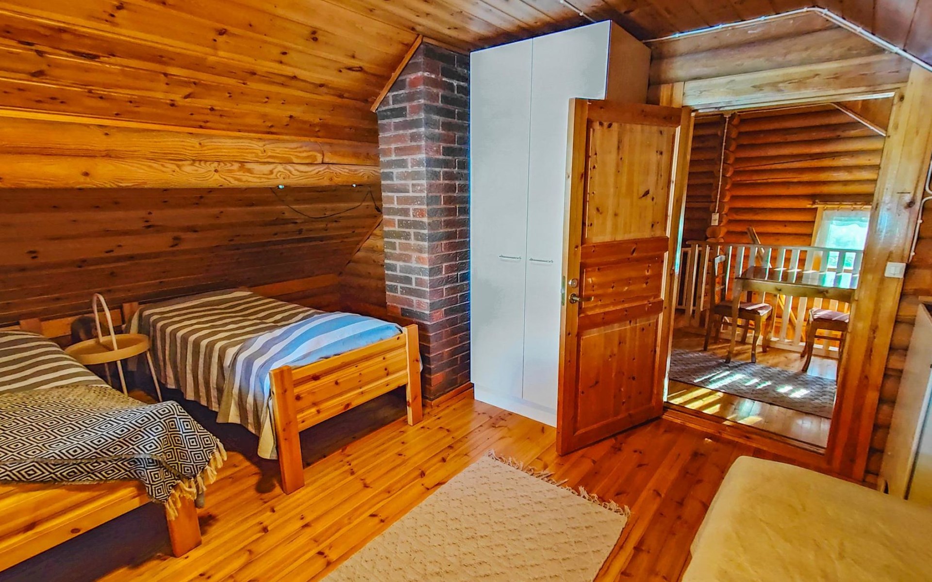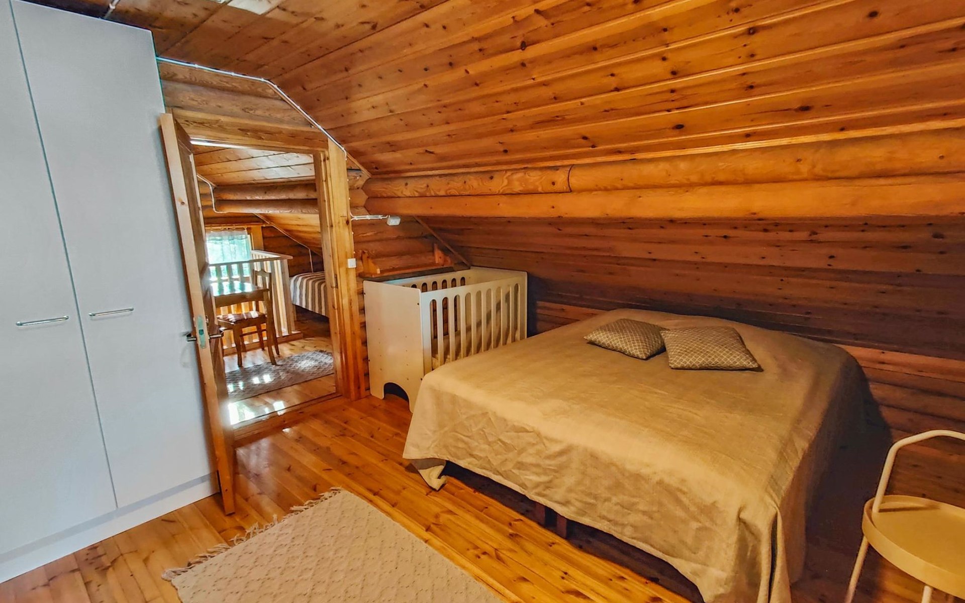 Upstairs: bedroom with one double bed and 2 single beds and crib, lobby with 3 beds, balcony.