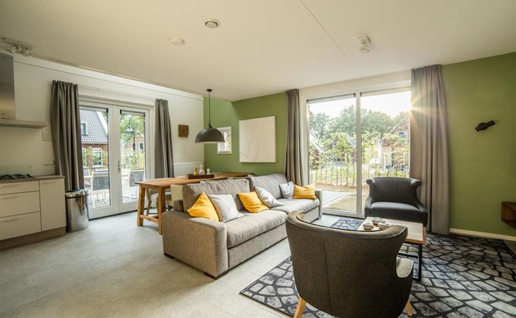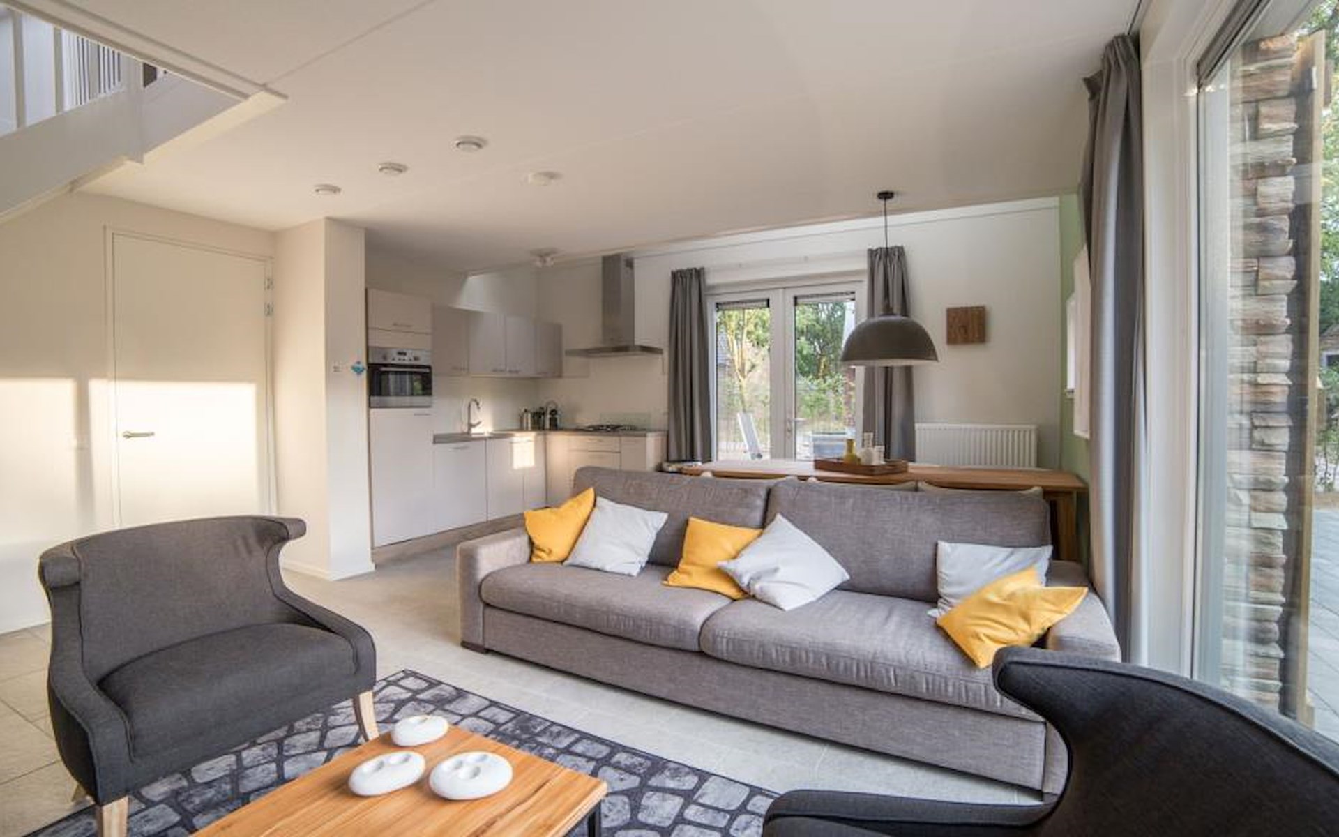De royale woonkamer beschikt over een ruime zithoek met televisie. Daarnaast is er een eethoek met een eettafel. De luxe keuken is compleet uitgerust met onder andere een koelkast, magnetron, vaatwasser, waterkoker, oven, kookplaat, broodrooster en een Nespresso apparaat.