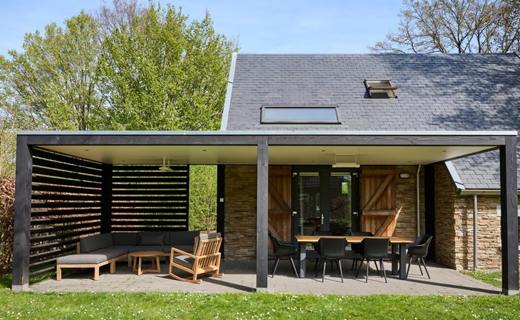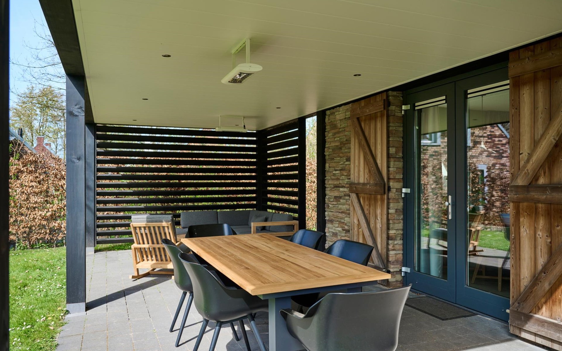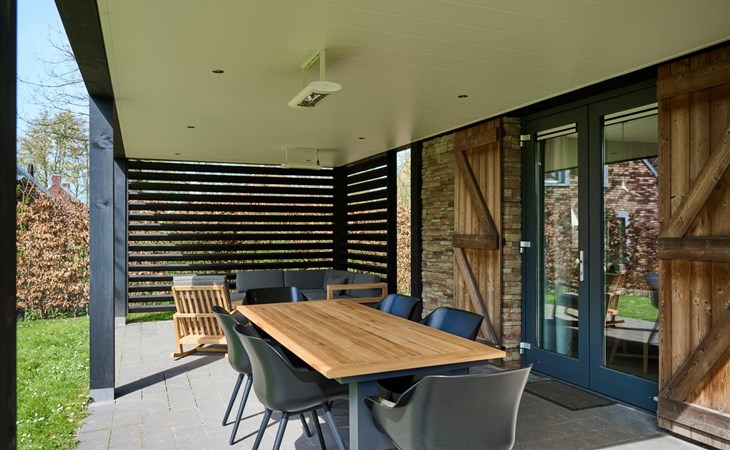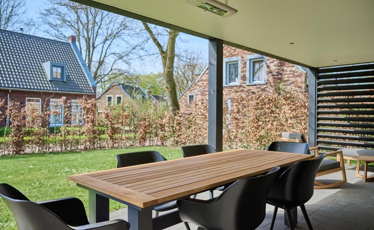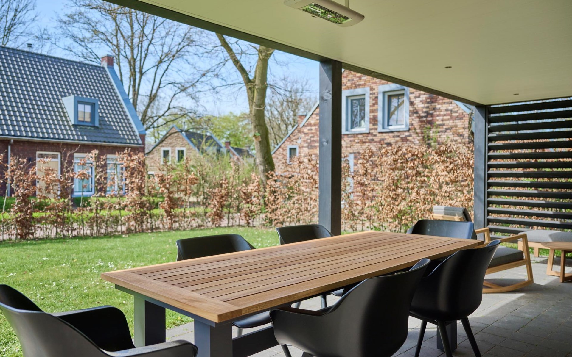 Vanuit de woonkamer heb je toegang tot de royale veranda met een tuinset, comfortabele loungeset en heater. Om hier lekker bourgondisch te kunnen genieten is de woning voorzien van een barbecue.
