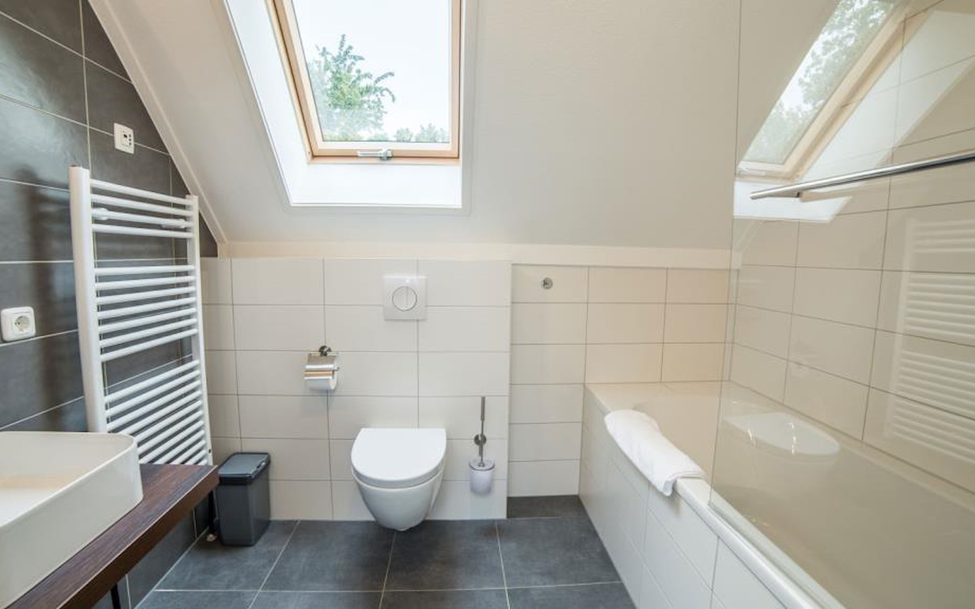 Er zijn 3 slaapkamers, waarvan 1 op de begane grond met 2 éénpersoonsbedden. Daarnaast zijn er 2 badkamers waarvan 1 met douche en wastafel en 1 met bad, toilet en wastafel. Er is ook een separaat toilet aanwezig.