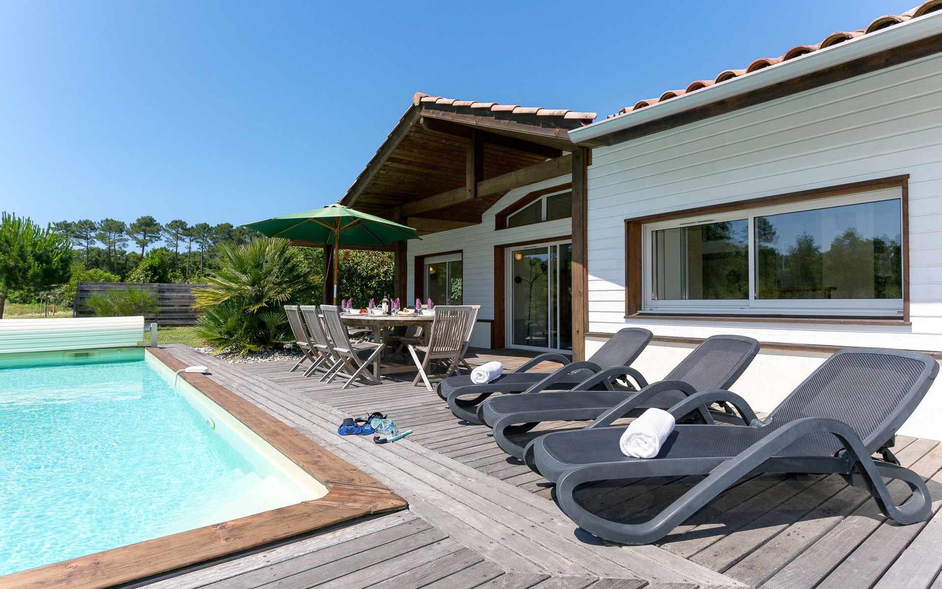 Mooi vakantiecomplex "Club Royal Océan La Prade". 85 huizen in de plaats. 2 km van het centrum van Moliets-Bourg, 8 km van het centrum van Vieux Boucau, 35 km van het centrum van Dax, 1.2 km van zee. Voor alleengebruik: tuin 600 m2 met gazon en bomen, openluchtzwembad (150 cm diepte, seizoensgebonden beschikbaarheid: 23.Mei. - 03.Okt.). In het complex: receptie, Internet (WiFi). Winkel 1.5 km, supermarkt 6 km, treinstation "Dax" 35 km, zandstrand 1.4 km. Golfterrein (18 holes) 700 m. De afgebeelde foto is slechts een voorbeeld. De huurobjecten kunnen wb. Woonoppervlak, kamerindeling verschillen.