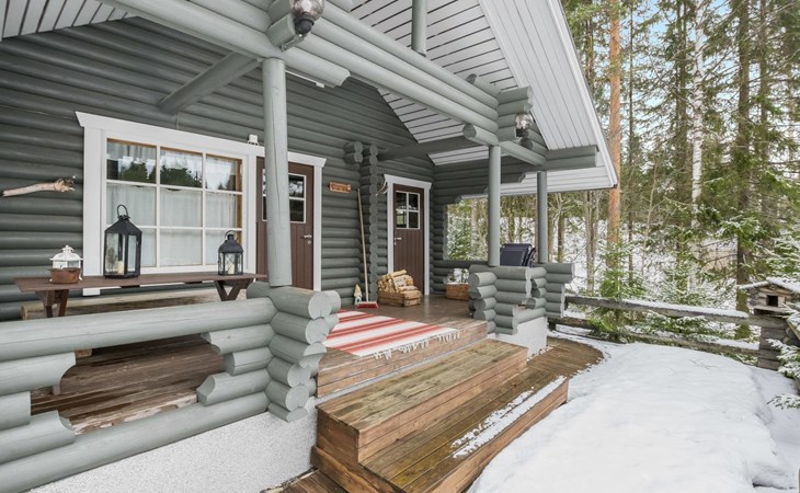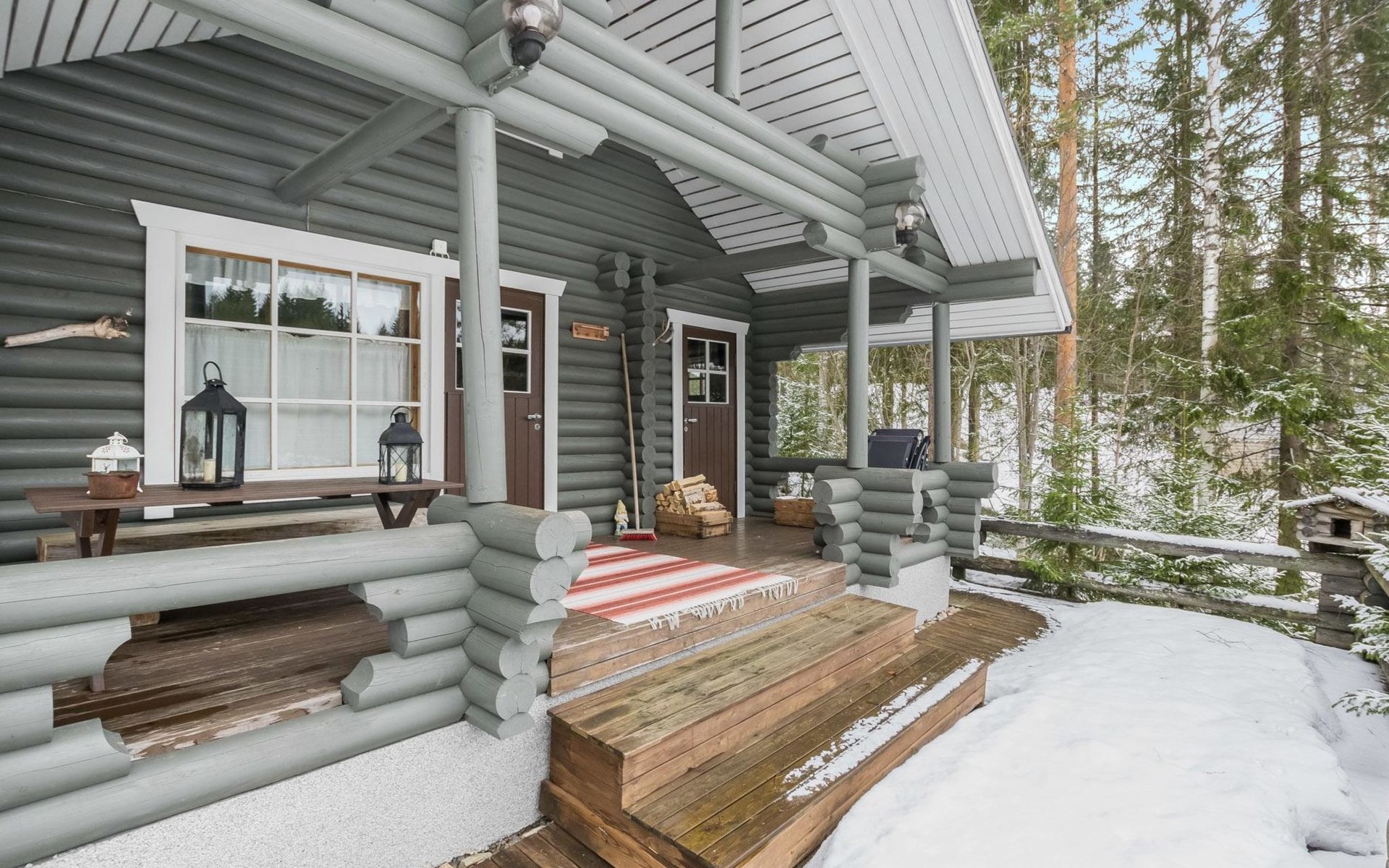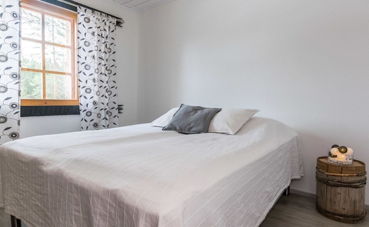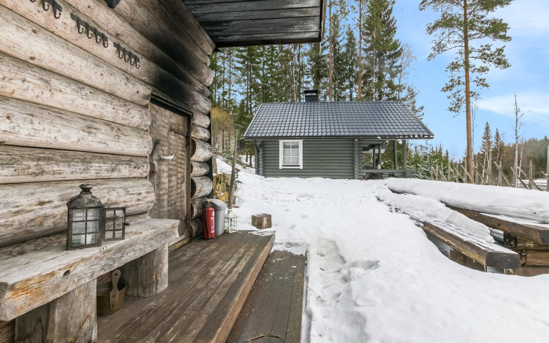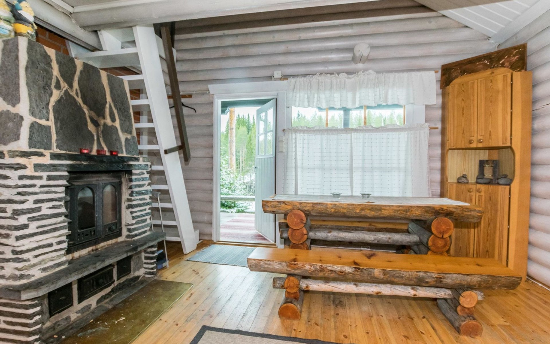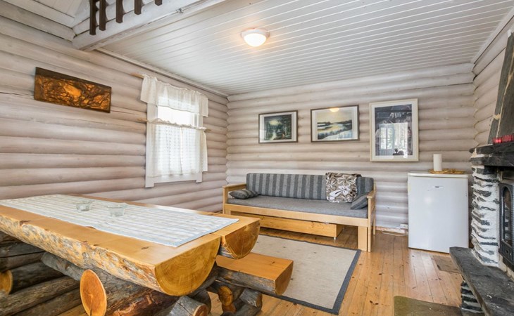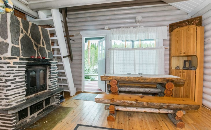 Two-storey cottage made of solid roundlogs 2003, living room/kitchen, sleeping loft 2 beds, hall, downstairs bedroom 2 beds, bedroom 2 beds, room with fireplace (extendible extra double bed). In 2021 built 2 more bedrooms (10 and 12 m², 2 beds in each) and also kitchen and surfaces renovated. There are no windows in two of the bedrooms. Sauna (wood heated stove) and bathroom, open terraces above and below.