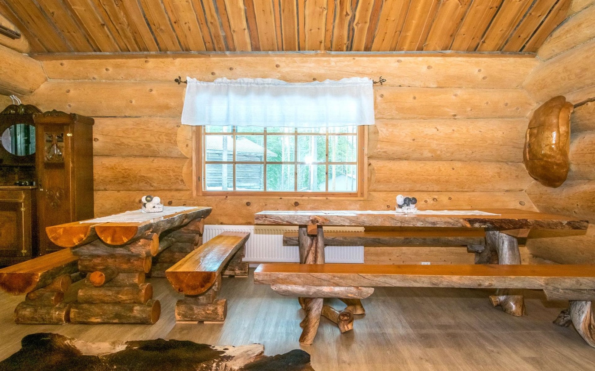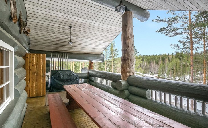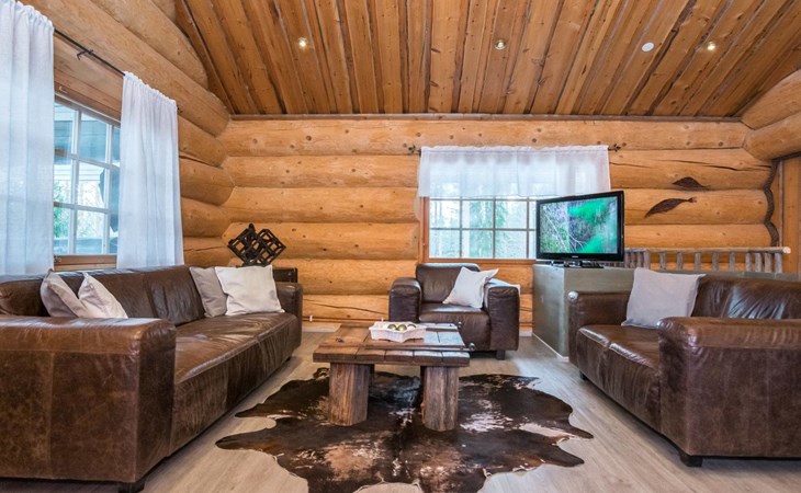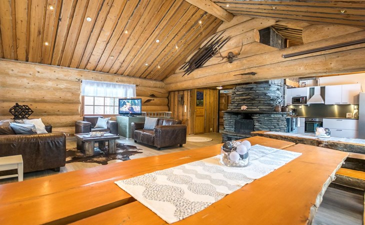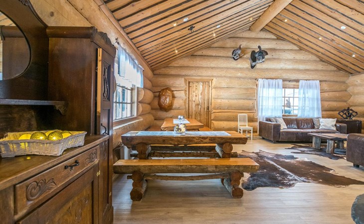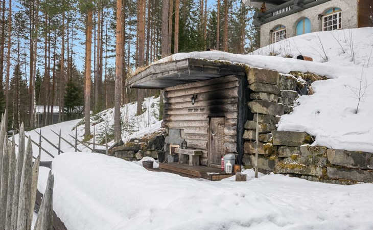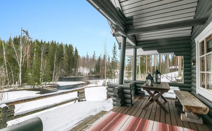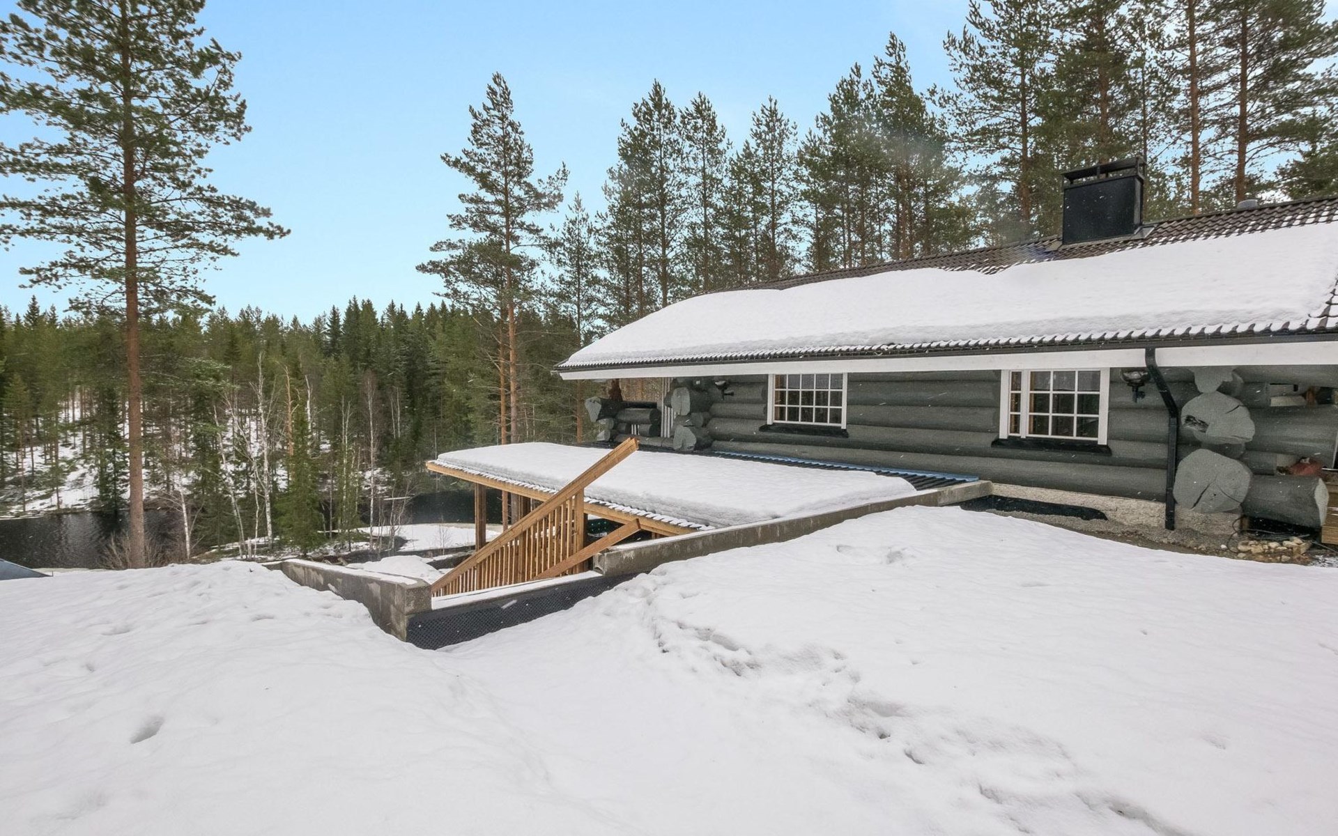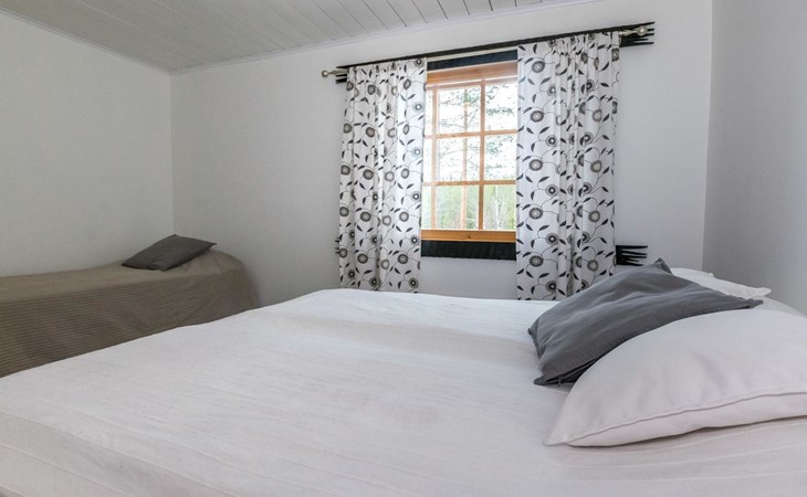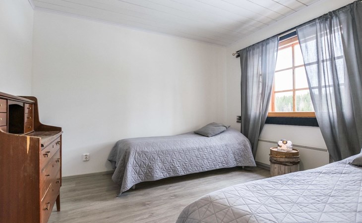 Two-storey cottage made of solid roundlogs 2003, living room/kitchen, sleeping loft 2 beds, hall, downstairs bedroom 2 beds, bedroom 2 beds, room with fireplace (extendible extra double bed). In 2021 built 2 more bedrooms (10 and 12 m², 2 beds in each) and also kitchen and surfaces renovated. There are no windows in two of the bedrooms. Sauna (wood heated stove) and bathroom, open terraces above and below.
