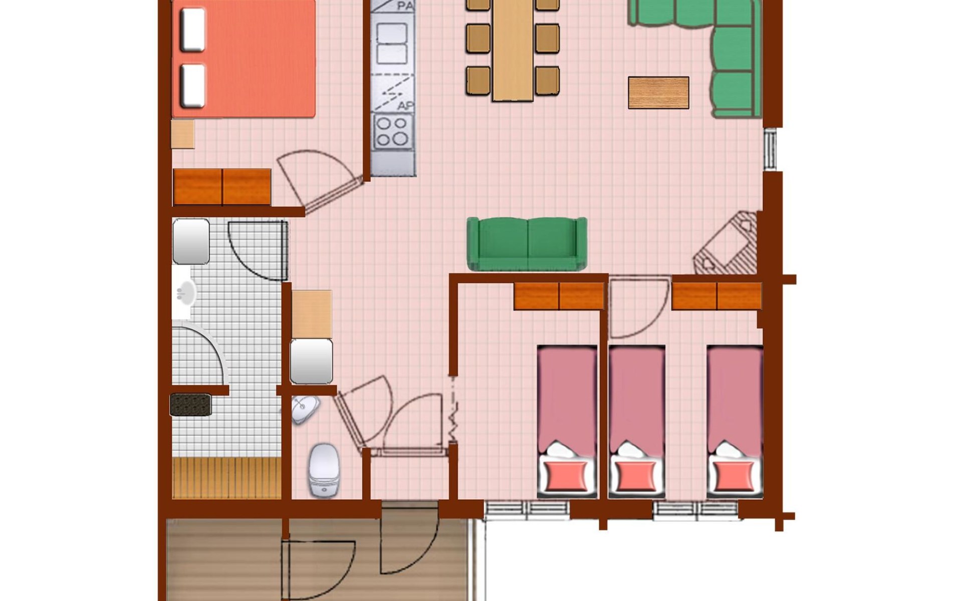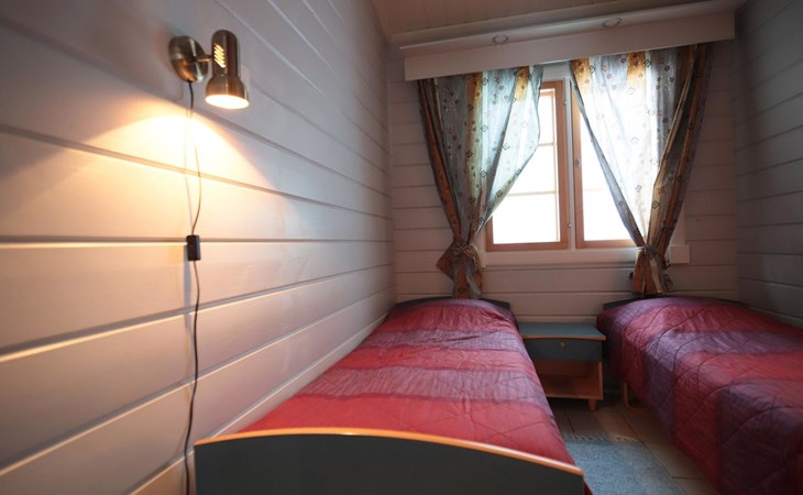 Sleeping accommodation consists of three bedrooms. Two of the bedrooms have two 80 cm wide beds per room. One bedroom has an 80 cm wide bed, under which you can pull out another bed.