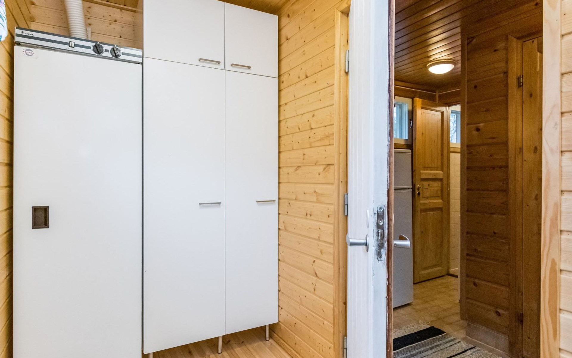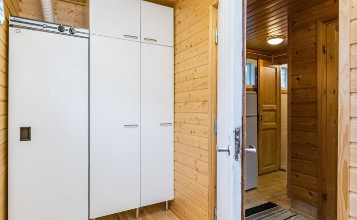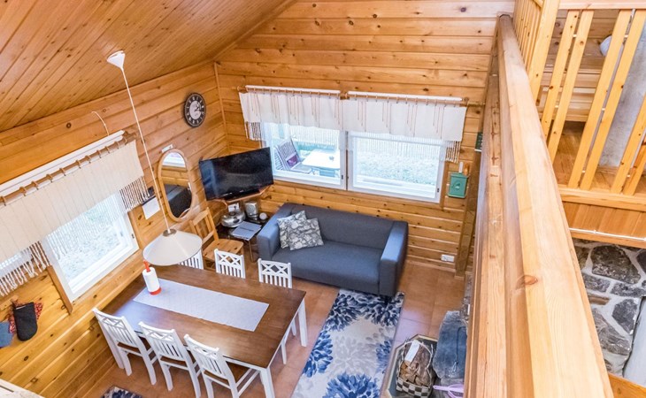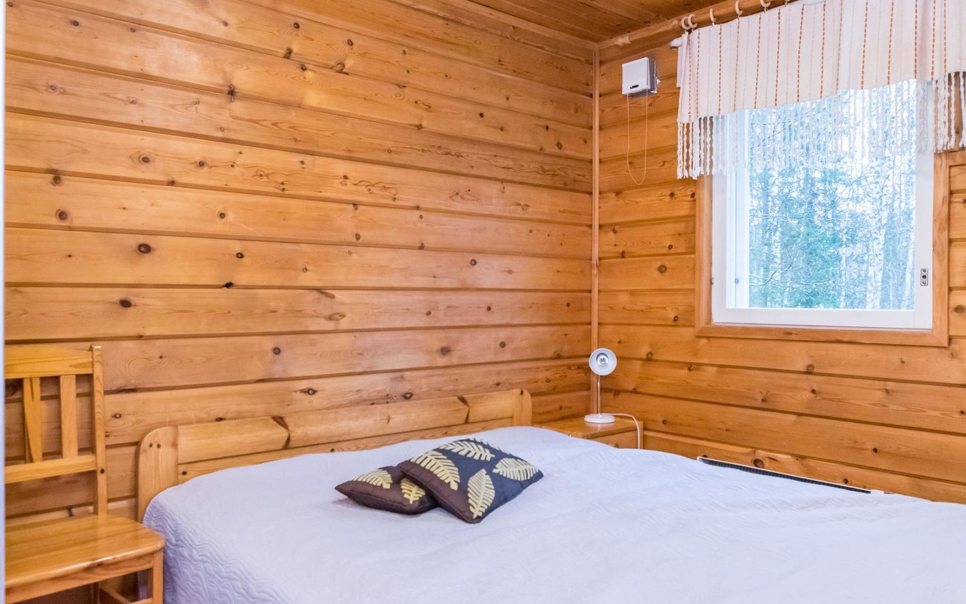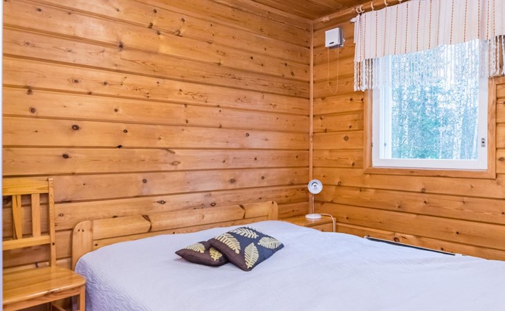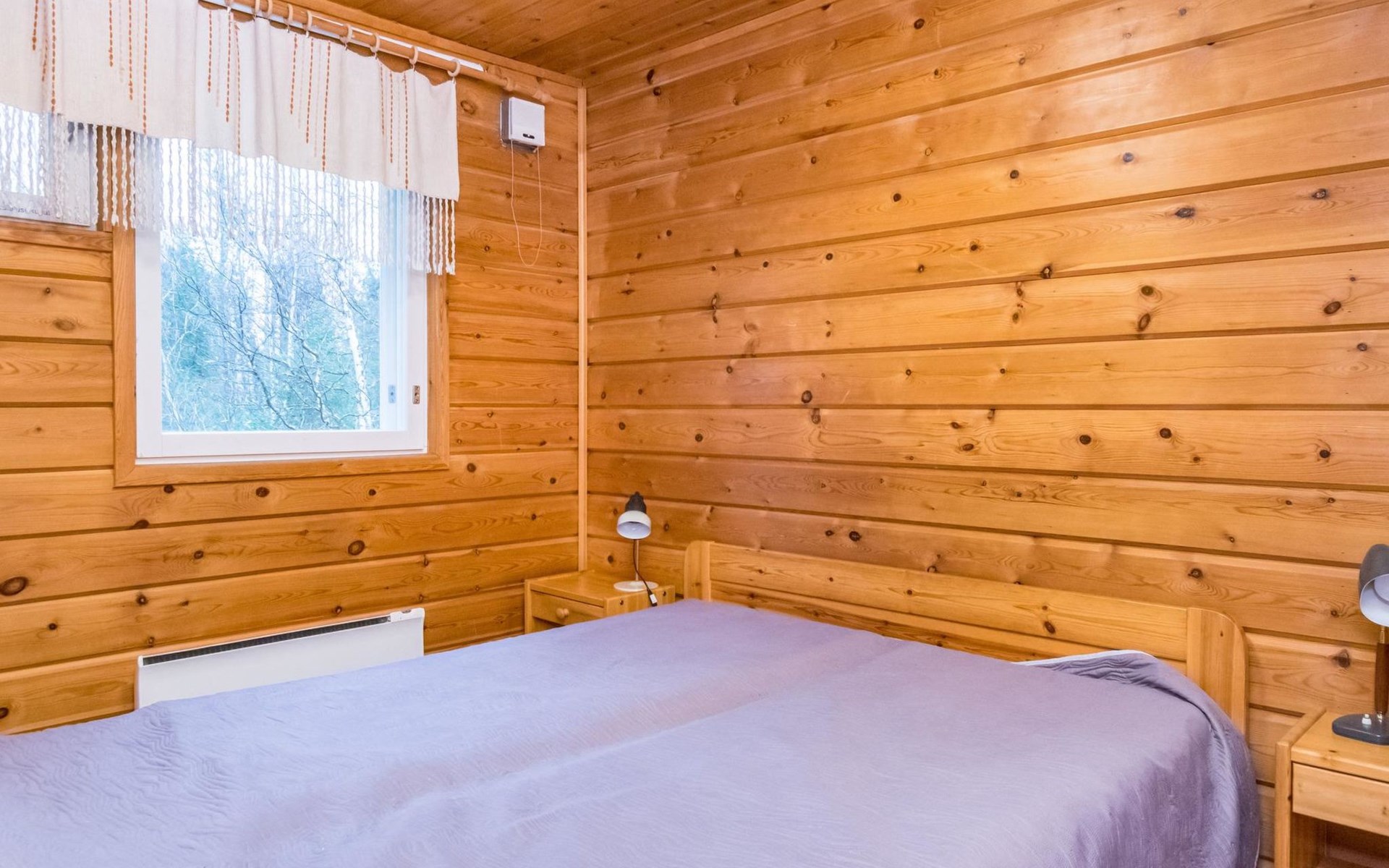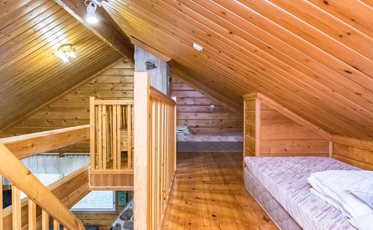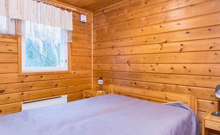 Log cabin with paneled interior built in 1990. Living room/kitchen, 2 bedrooms with double beds, sleeping loft (28m²) with 4 mattresses, sauna (electric stove), washroom and open porch.