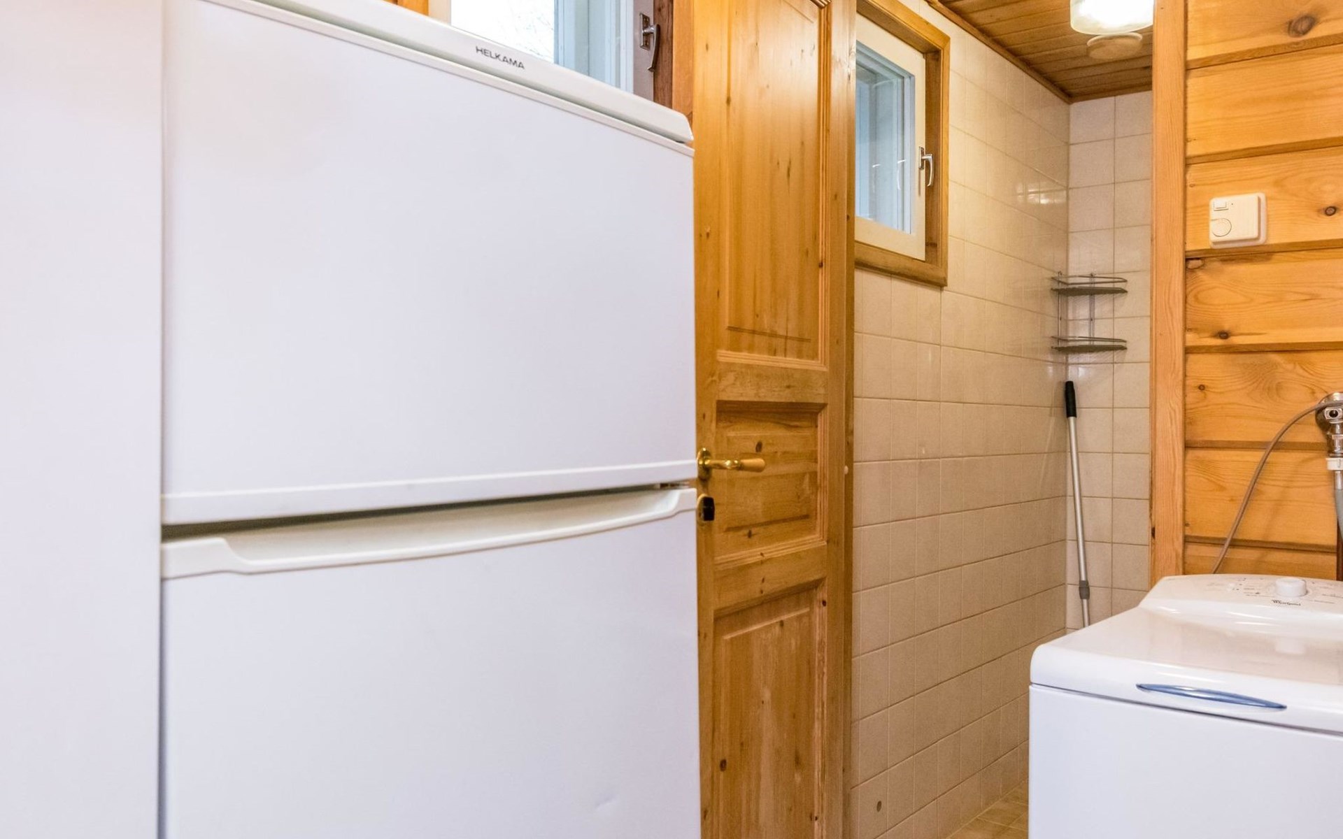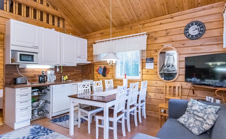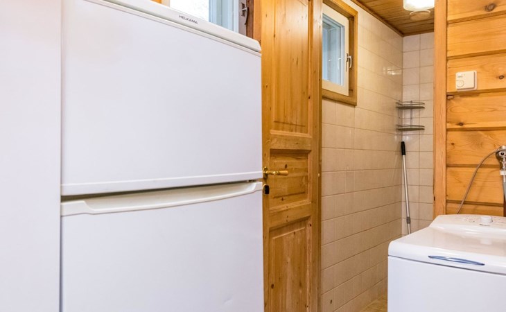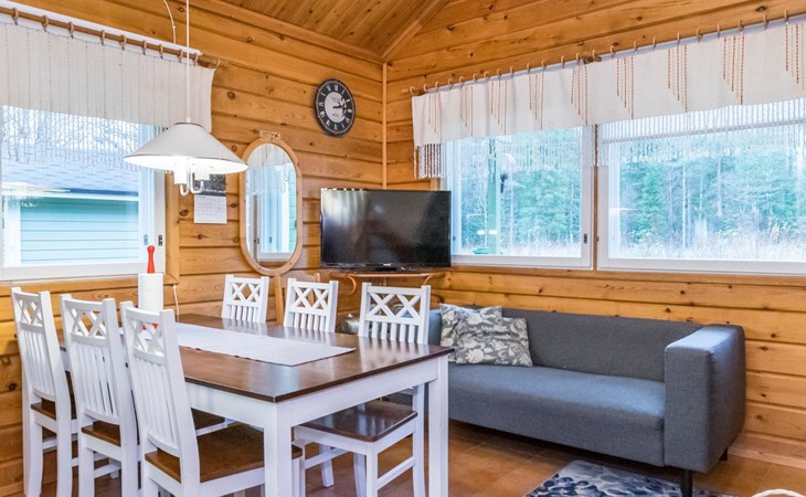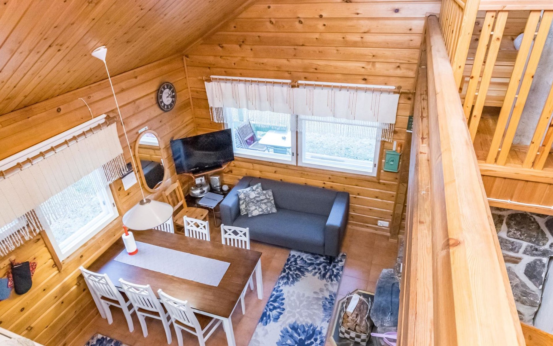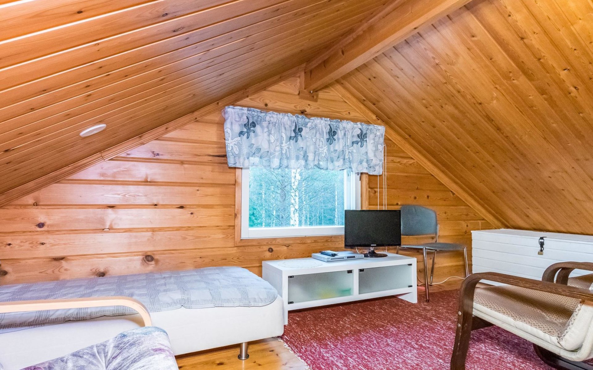 Log cabin with paneled interior built in 1990. Living room/kitchen, 2 bedrooms with double beds, sleeping loft (28m²) with 4 mattresses, sauna (electric stove), washroom and open porch.