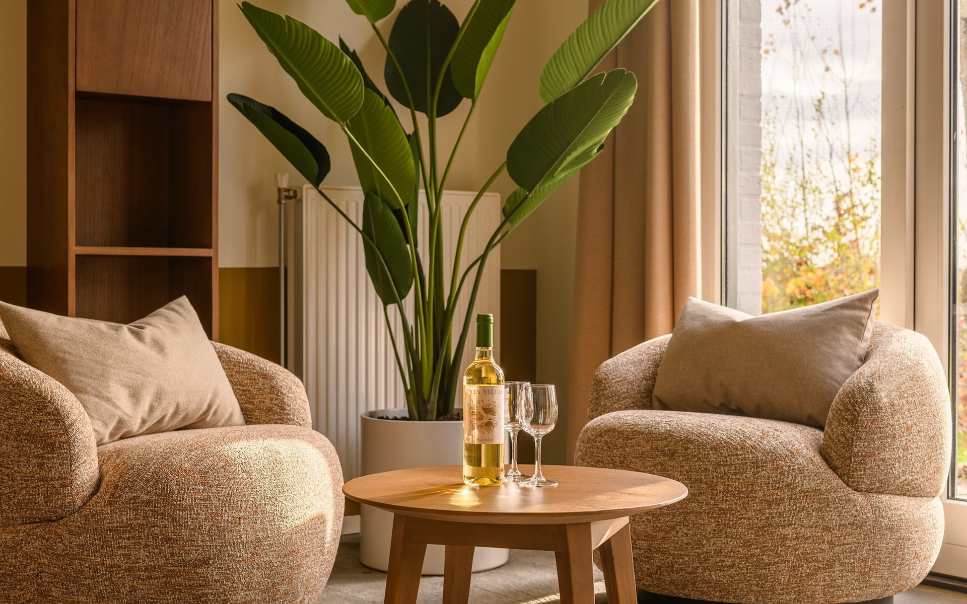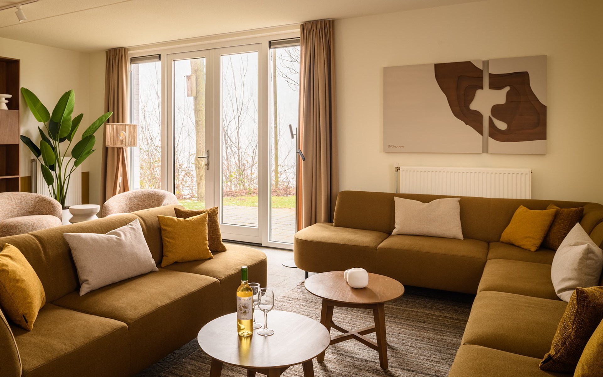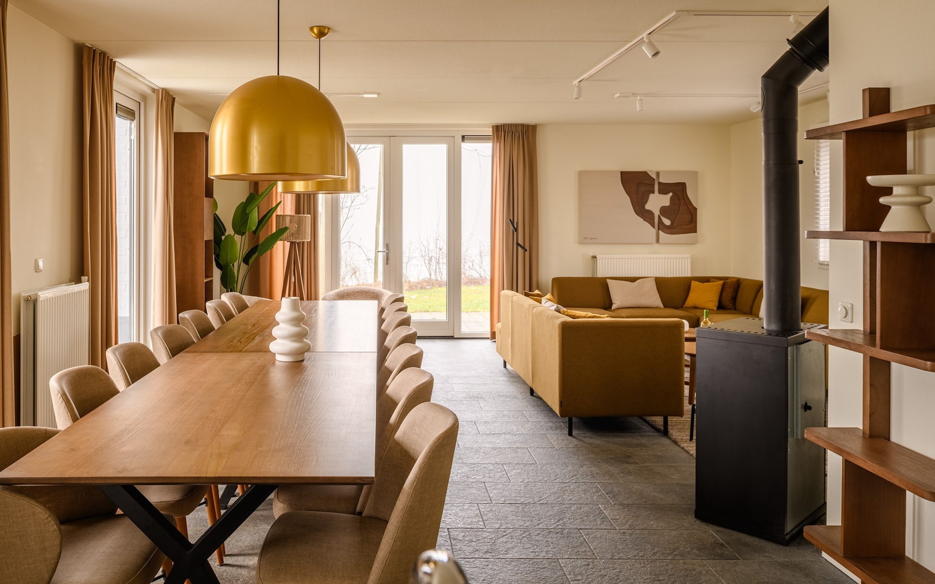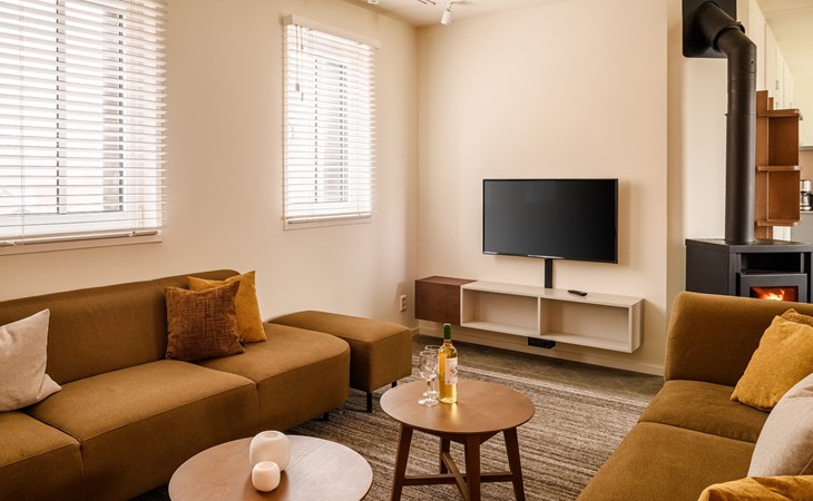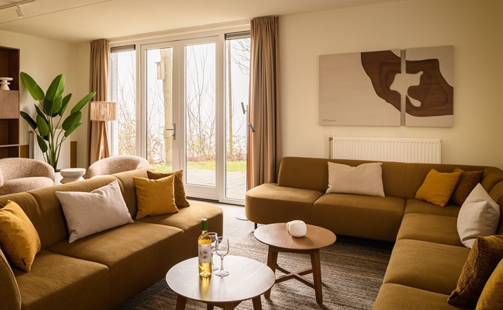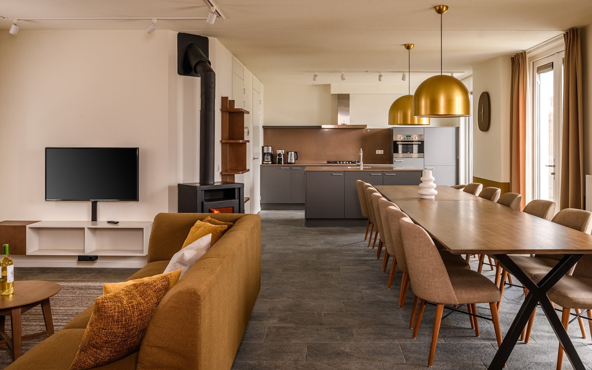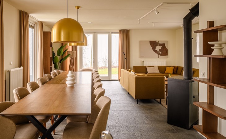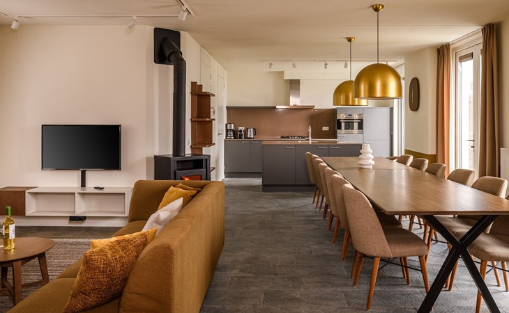 De royale woonkamer is voorzien van zithoek, eethoek en een open keuken met luxe apparatuur. Hier heb je onder andere de beschikking over een combi-oven, vaatwasser, koel-vriescombinatie, filter koffiezetapparaat en een Nespresso apparaat. In de woonkamer staat een sfeervolle houtkachel voor ontspannen avonden bij het knisperende haardvuur. Vanuit de woonkamer heb je via de openslaande deuren toegang tot de tuin met een ruim terras.
