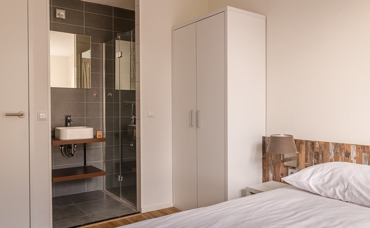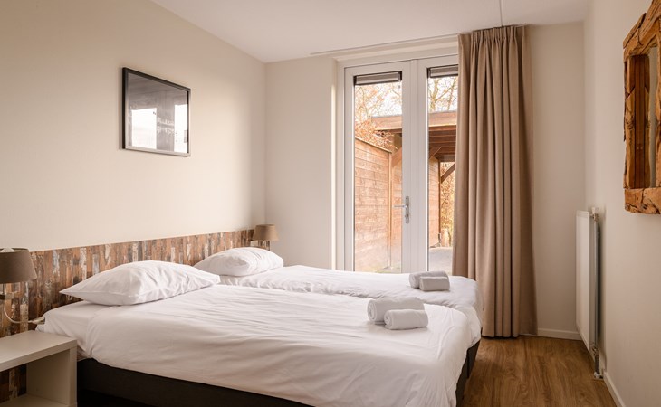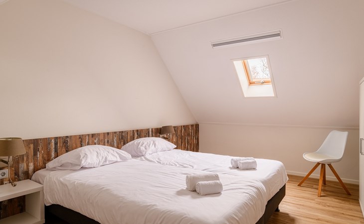 Op de begane grond bevindt zich een tweepersoonsslaapkamer met 2 éénpersoonsbedden en een douche en wastafel. Verder is er een separaat toilet aanwezig op de begane grond.